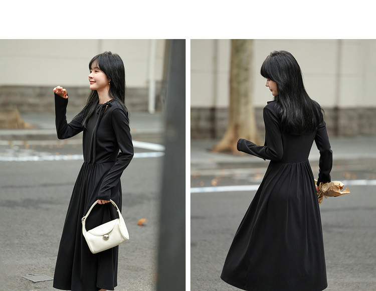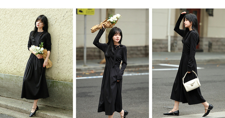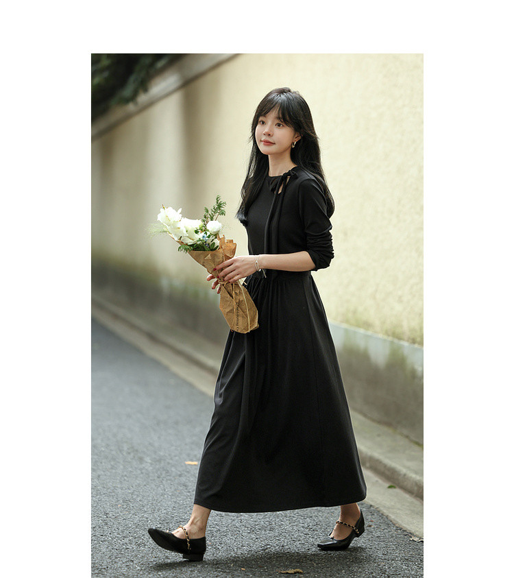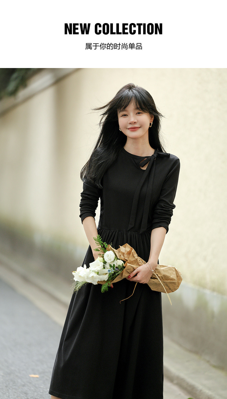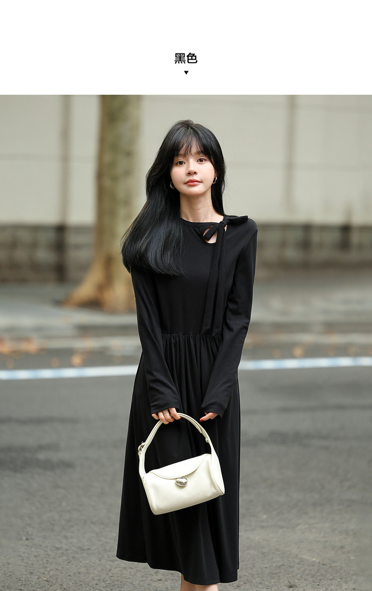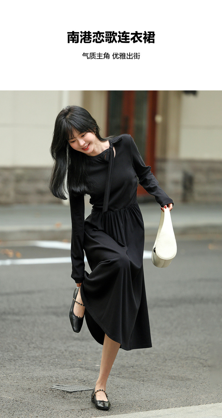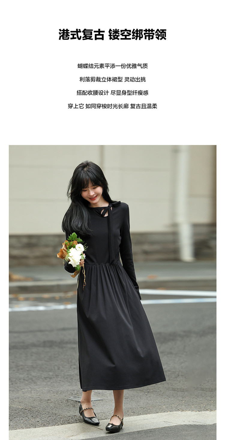 【霞光映日】秋法式文艺镂空绑带复古A字收腰遮肉中长女连衣裙