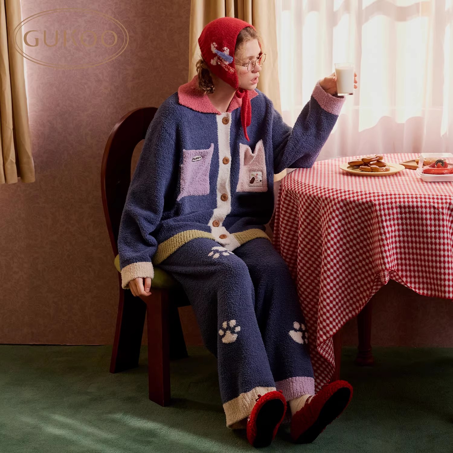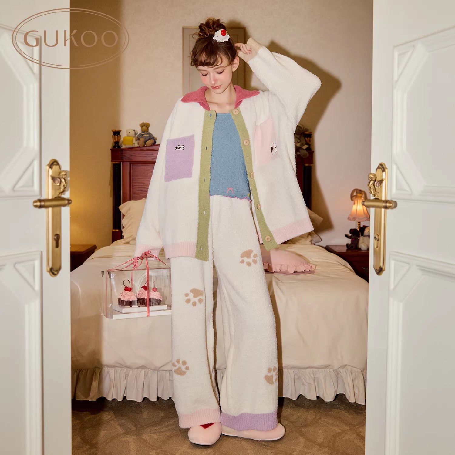 Gukoo/果壳睡衣冬季半边绒保暖新款轰轰小狗可爱女士家居服套装D