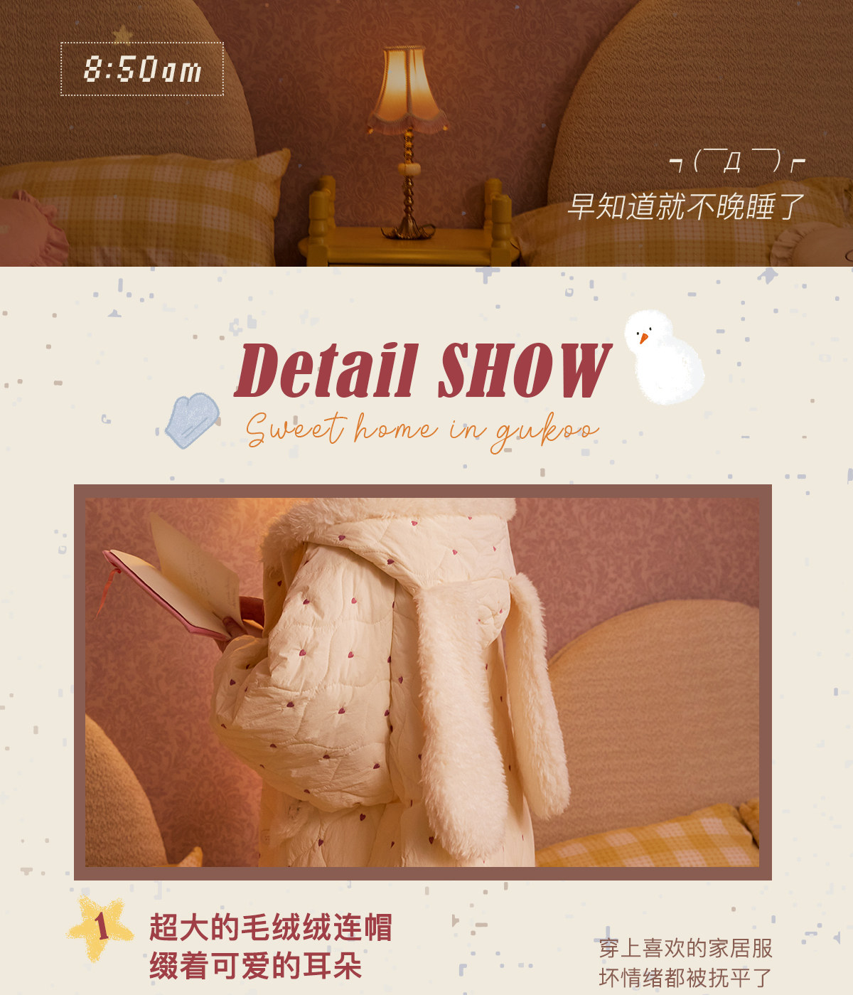 Gukoo/果壳mikko联名半边绒睡衣女秋冬保暖可爱卡通家居服套装D