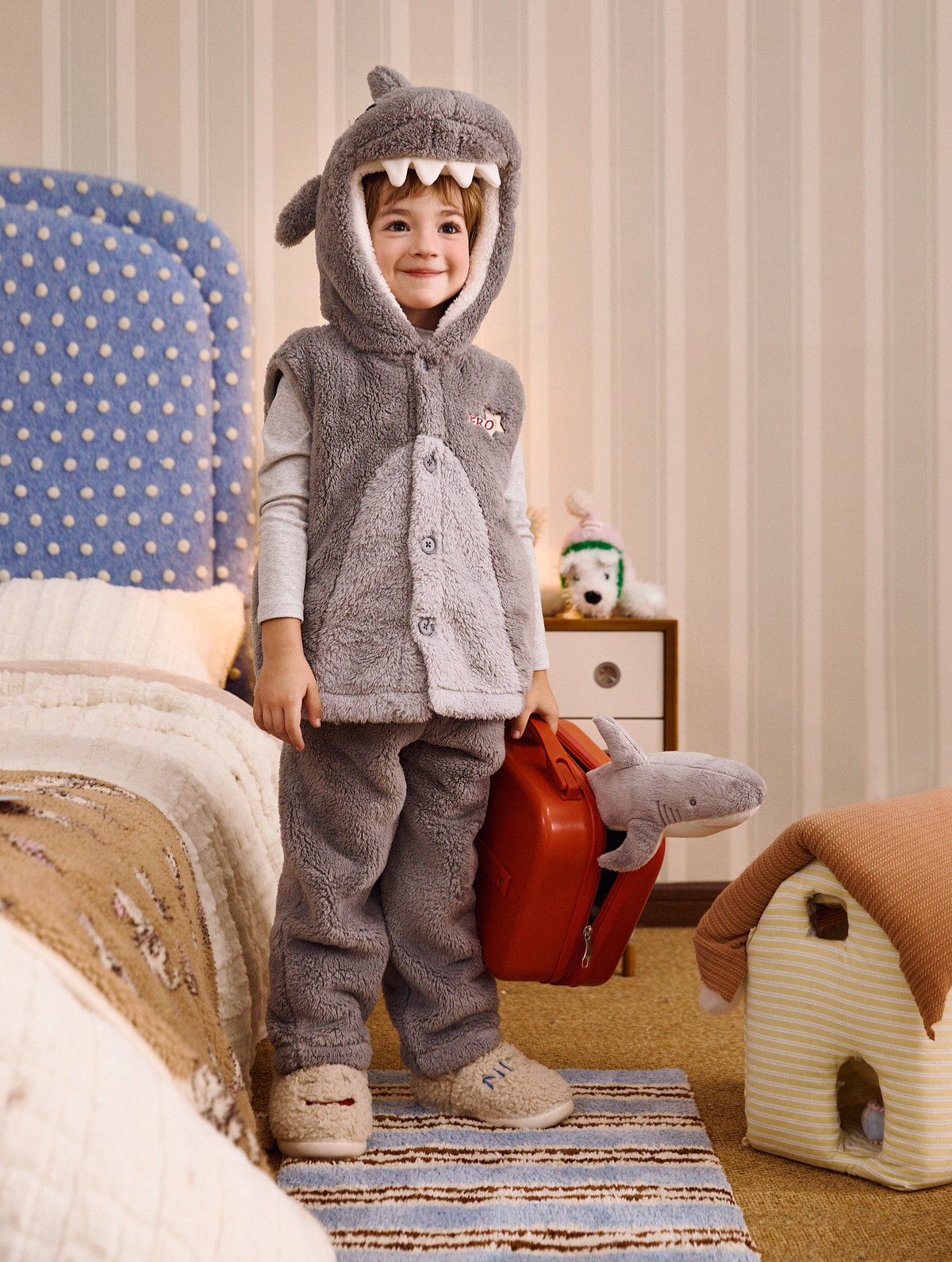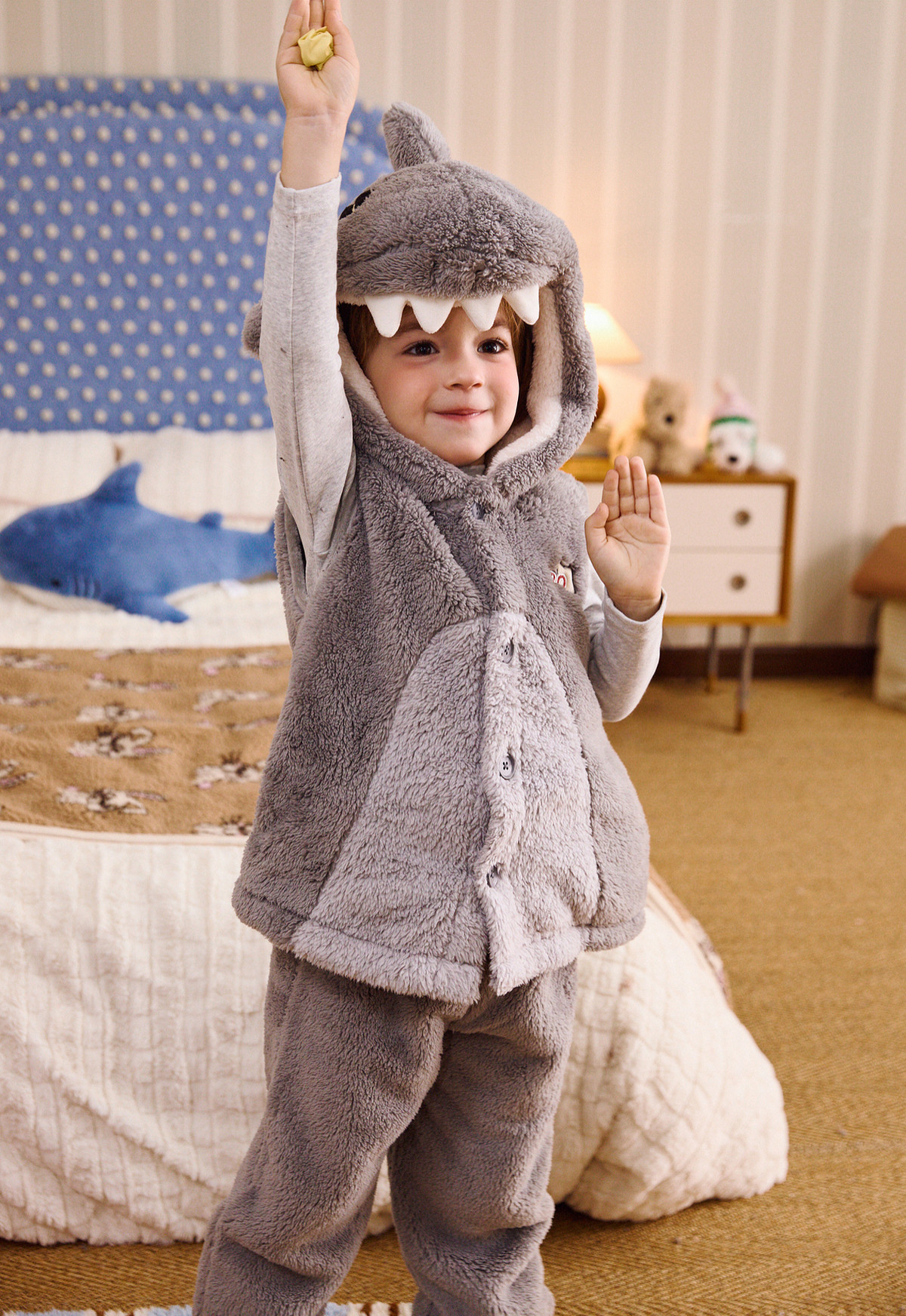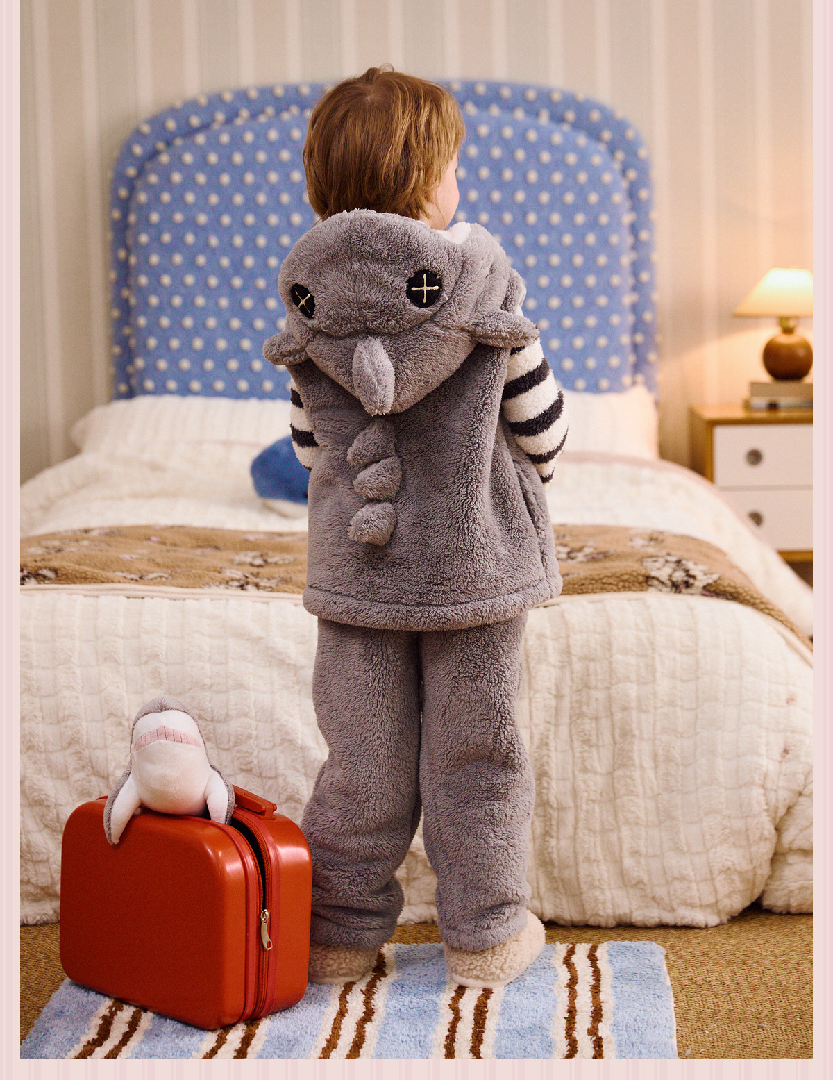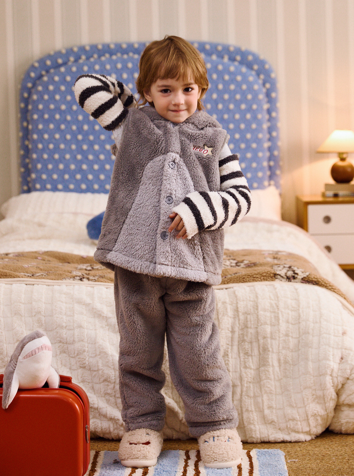 Gukoo/果壳儿童睡衣冬季毛绒保暖新款可爱小鲨鱼男童家居服套装D