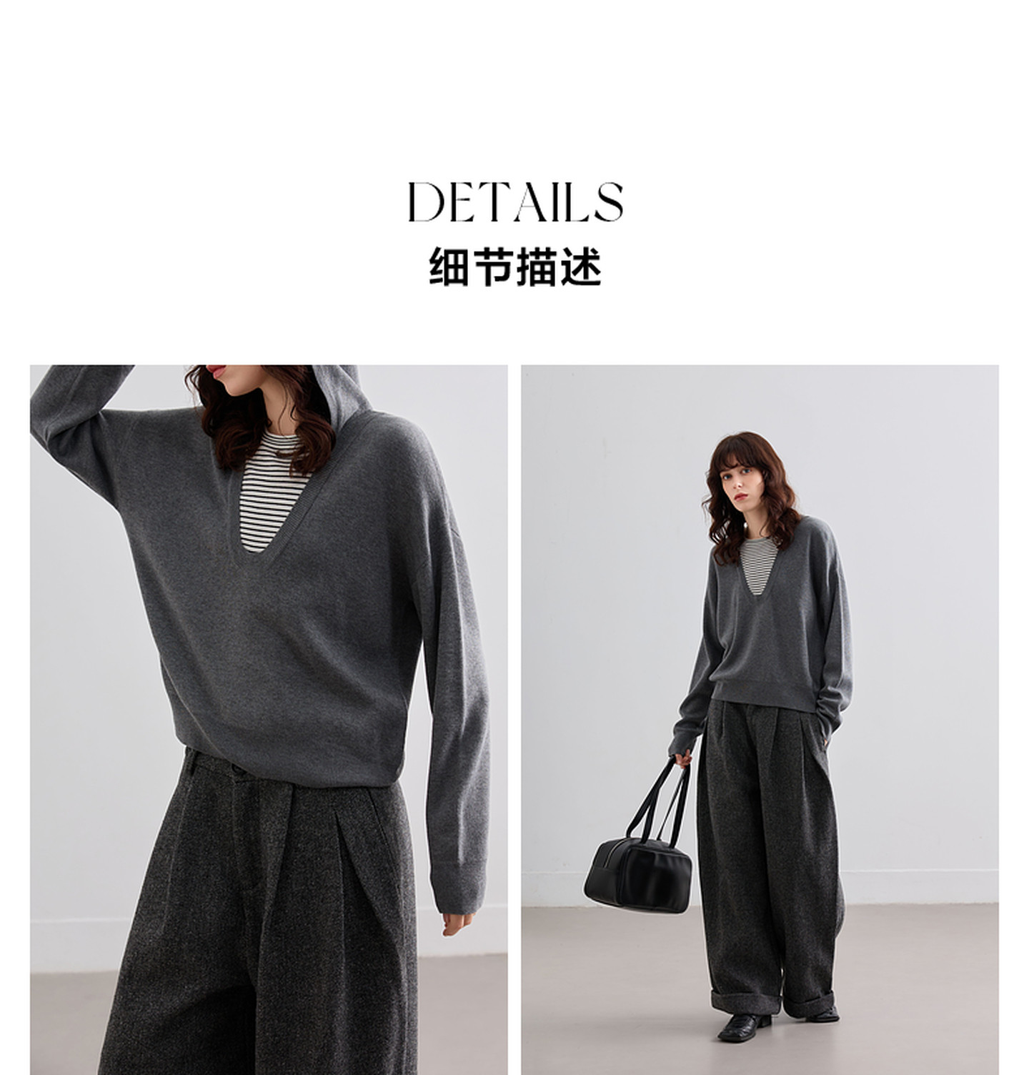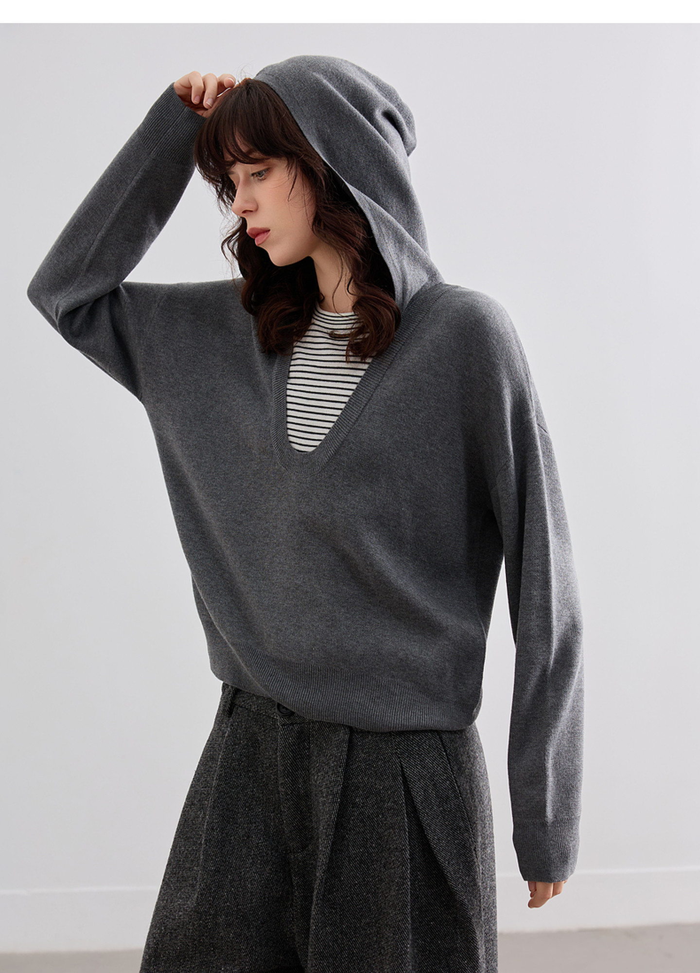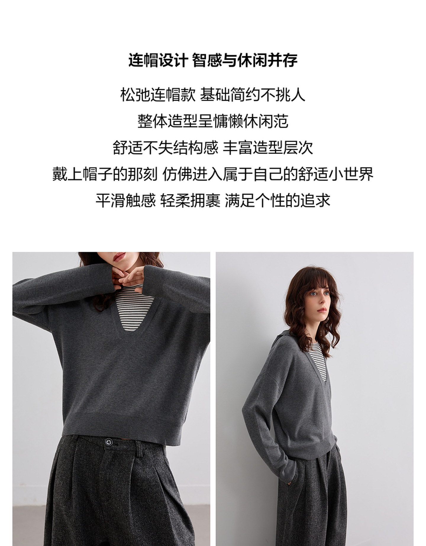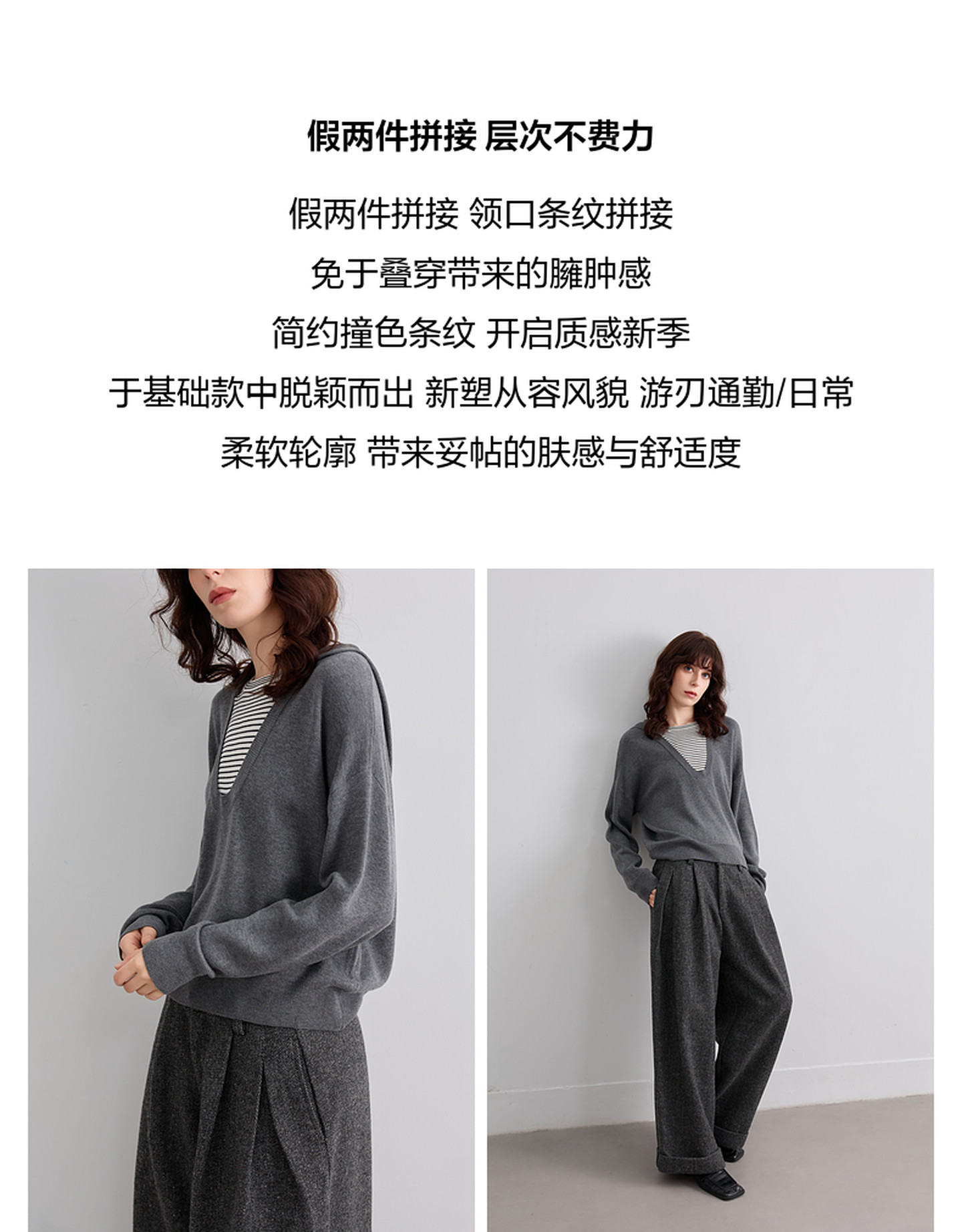 德玛纳【含蓬松绵羊毛】秋季假两件撞色条纹连帽线衫高级感针织衫女上衣G541320346301