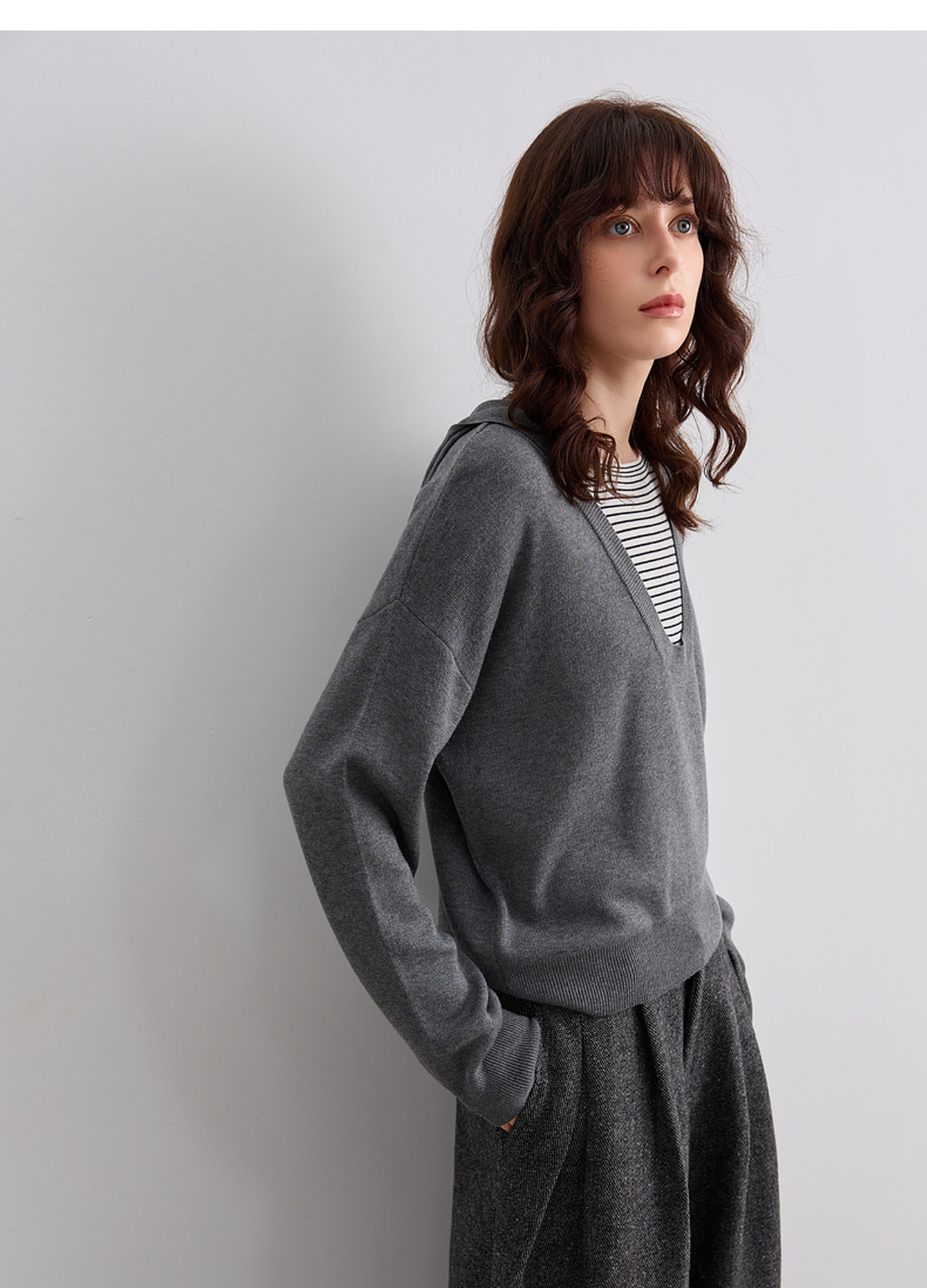 德玛纳【蓬松绵羊毛】秋季文艺学院翻领拼色条纹宽松显瘦针织衫女高级感G541320346902