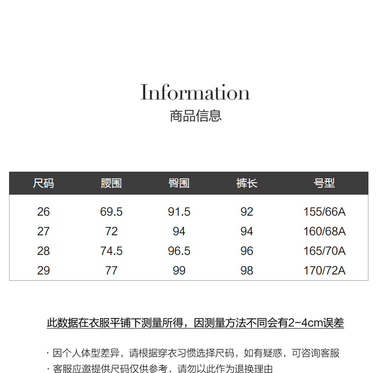 尺码 号型 腰围(cm) 臀围(cm) 裤长(cm) 26 155/66A 69.5 91.5 92 27 160/68A 72 94 94 28 165/70A 74.5 96.5 96 29 170/72A 77 99 98 温馨提示: 以上数据仅供参考,由于尺码是手工测量,所以难免存在1cm-2cm的误差 收起商品参数DETAIL