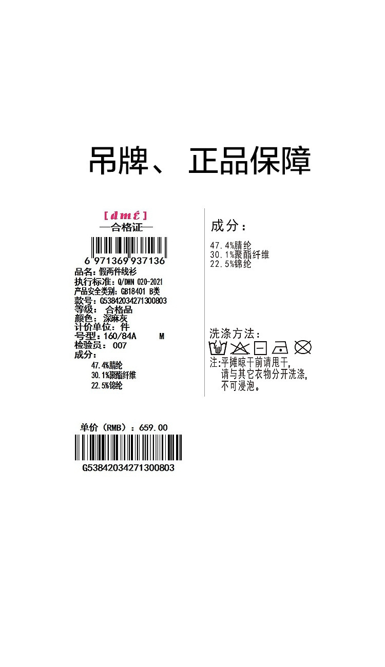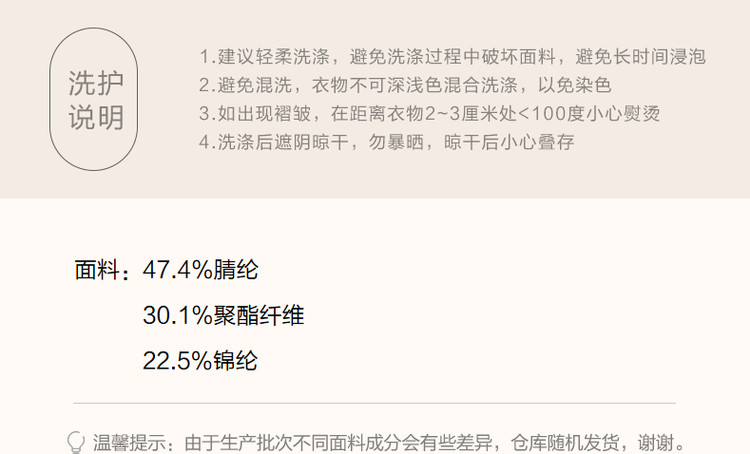 弹性: 微弹 版型: 宽松 衣长: 常规 厚薄: 常规 风格: 都市 柔软度: 柔软 适用季节: 秋,冬 领型: 翻领 袖型: 落肩袖 袖长: 长袖 适用人群: 青年 面料: 腈纶 肩型: 常规肩 穿着方式: 套头 生产/经销/进口厂家: 宁波德玛纳瑞品服饰有限公司 适用性别: 女士 厂家地址: 安徽省芜湖市三山经济开发区保定街道焦弯路3号 洗涤说明: 凡是棉、麻、丝、毛天然面料都会有轻微褪色、变型、起皱、缩水现象,为减少或避免以上情况发生在洗涤保养上需特别小心。洗涤时应选用冷水(30度以下),中性或酸性洗衣手洗(丝、毛面料应选用专业洗衣液),不宜浸泡(2分钟左右),即泡即洗,不可氯漂。为避免染色,清洗与晾晒时,深浅色应分开,不宜拧过干,反面阴干 详细材质信息: 47.4%腈纶 30.1%聚酯纤维 22.5%锦纶 主款式: 翻领针织衫 主风格: 商务通勤 执行标准: Q/DMN 020-2021 产地: 中国 商品配件: 暂无 商品编码: G538420342713008 收起商品展示IMAGE