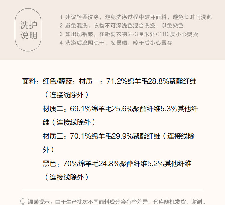 版型: 直筒 衣长: 短 厚薄: 常规 风格: 都市 适用季节: 秋,冬 领型: 圆领 衣门襟: 双排扣 袖型: 常规 袖长: 长袖 适用人群: 青年 面料: 羊毛 图案: 纯色 里材质: 羊毛 组合形式: 单件 生产/经销/进口厂家: 宁波德玛纳瑞品服饰有限公司 适用性别: 女士 厂家地址: 安徽省芜湖市三山经济开发区保定街道焦弯路3号 是否双面可穿: 否 是否连帽可脱卸: 否 详细材质信息: 红色/醇蓝:71.2%绵羊毛 28.8%聚酯纤维 (连接线除外) 黑色:70%绵羊毛 24.8%聚酯纤维 5.2%其他纤维 (连接线除外) 主款式: 羊毛外套 主风格: 商务通勤 执行标准: Q/DMN 002-2016 产地: 中国 商品配件: 暂无 商品编码: G538420822206610 收起商品展示IMAGE