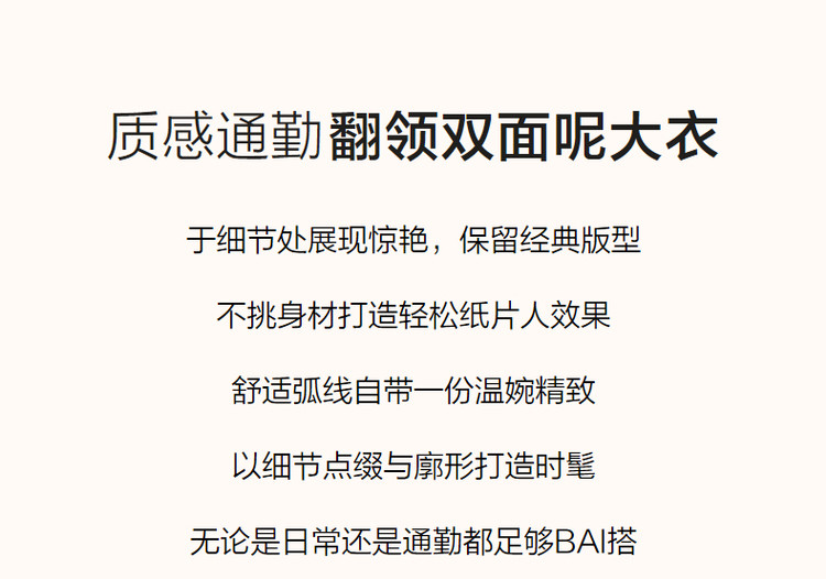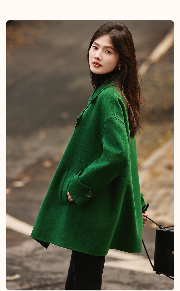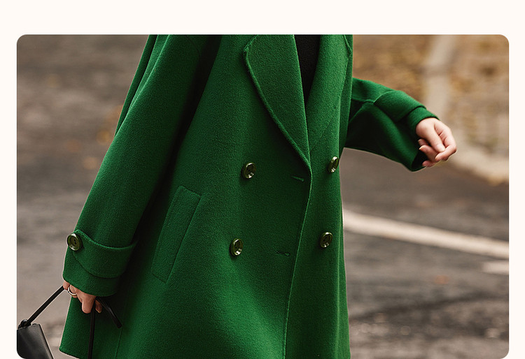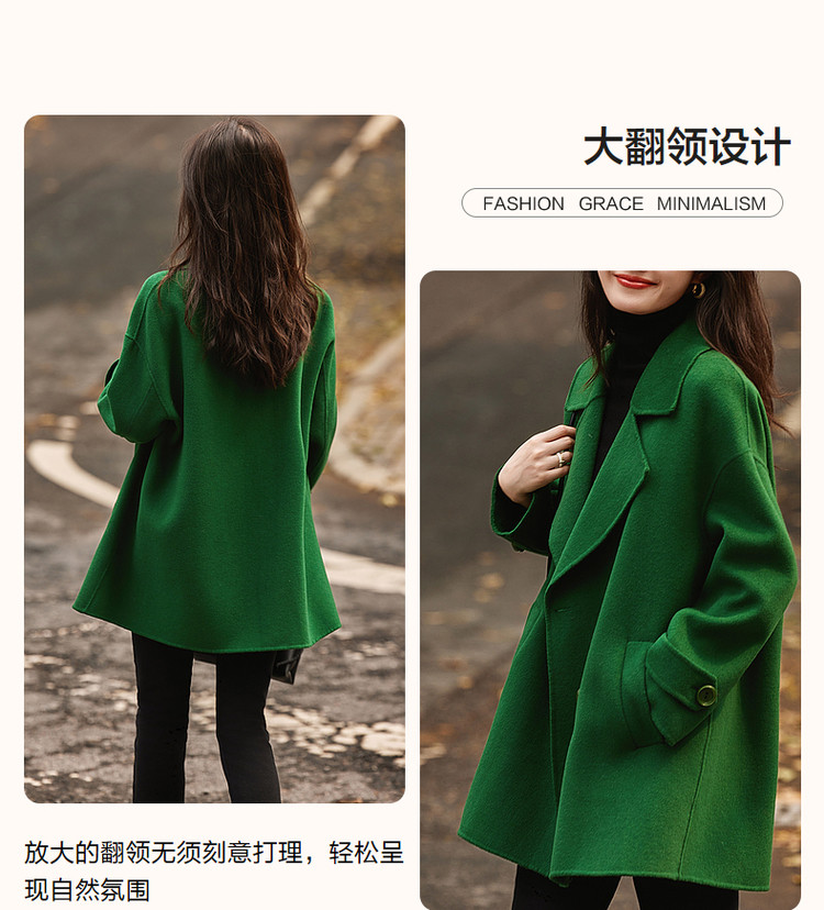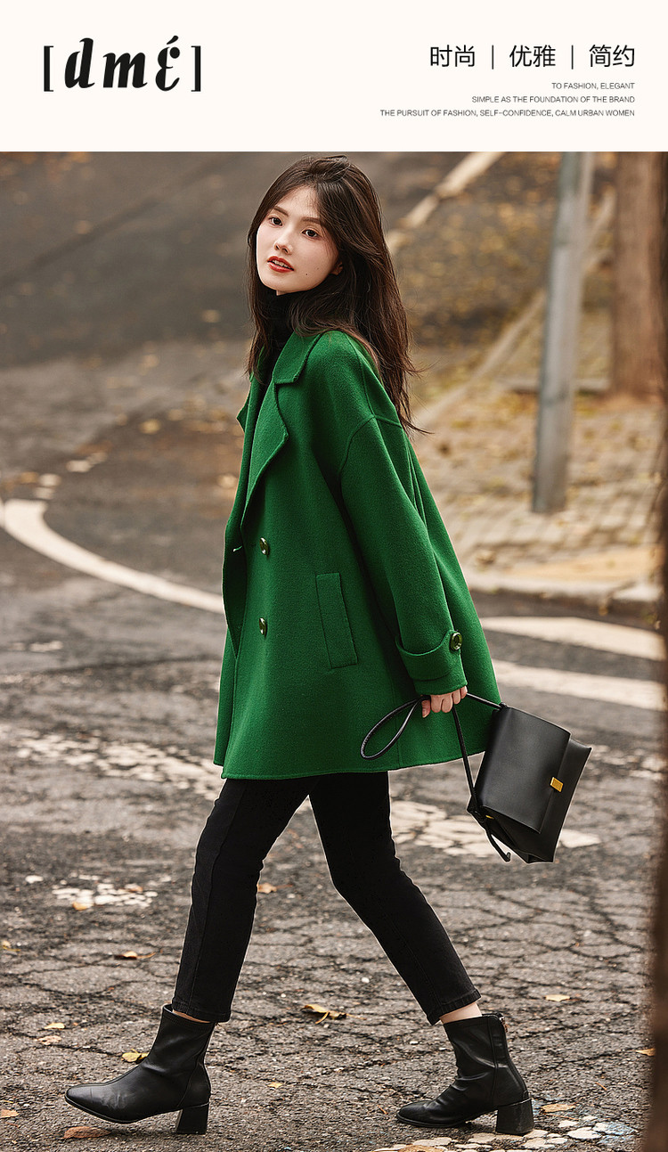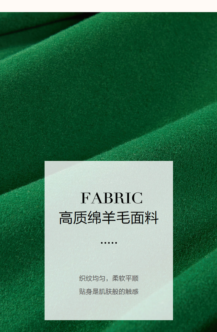 弹性: 无弹 版型: 直筒 衣长: 中长 风格: 都市 适用季节: 秋,冬 领型: 大翻领 衣门襟: 双排扣 袖型: 常规 袖长: 长袖 适用人群: 青年 面料: 羊毛,绵羊毛 肩型: 常规肩 里材质: 涤纶/聚酯纤维 上市年份: 2023 生产/经销/进口厂家: 宁波德玛纳瑞品服饰有限公司 适用性别: 女士 厂家地址: 安徽省芜湖市三山经济开发区保定街道焦弯路3号 洗涤说明: 凡是棉、麻、丝、毛天然面料都会有轻微褪色、变型、起皱、缩水现象,为减少或避免以上情况发生在洗涤保养上需特别小心。洗涤时应选用冷水(30度以下),中性或酸性洗衣手洗(丝、毛面料应选用专业洗衣液),不宜浸泡(2分钟左右),即泡即洗,不可氯漂。为避免染色,清洗与晾晒时,深浅色应分开,不宜拧过干,反面阴干 是否双面可穿: 否 是否连帽可脱卸: 否 详细材质信息: 绿色:材质一:71.8%绵羊毛28.2%聚酯纤维(连接线除外) 材质二:69.6%绵羊毛25.3%聚酯纤维5.1%其他纤维(连接线除外) 黑色:70%绵羊毛24.8%聚酯纤维5.2%其他纤维(连接线除外) 驼色:69.7%绵羊毛26.7%聚酯纤维3.6%其他纤维(连接线除外) 主款式: 直筒大衣 主风格: 极简 执行标准: Q/DMN 002-2016 毛领: 无毛领 是否有毛领: 无毛领 产地: 中国 商品配件: 暂无 商品编码: G538420830401401 收起商品展示IMAGE