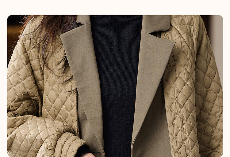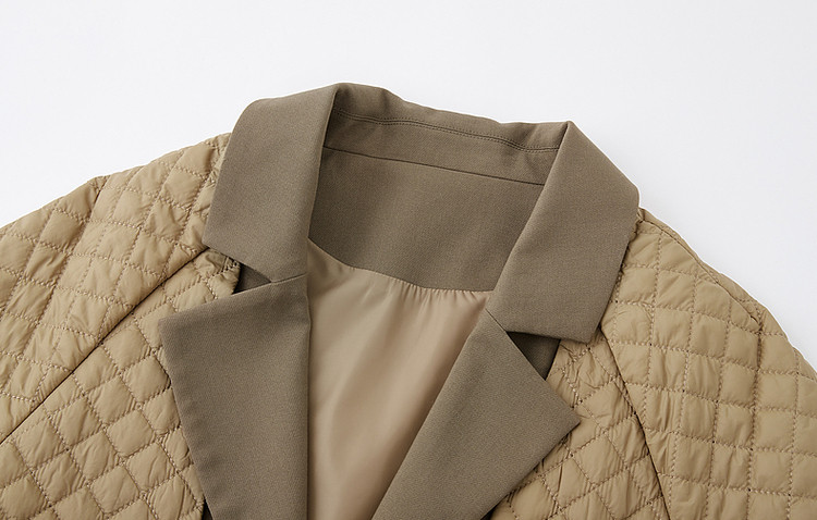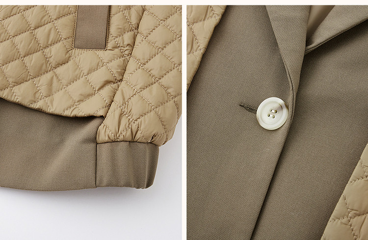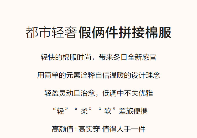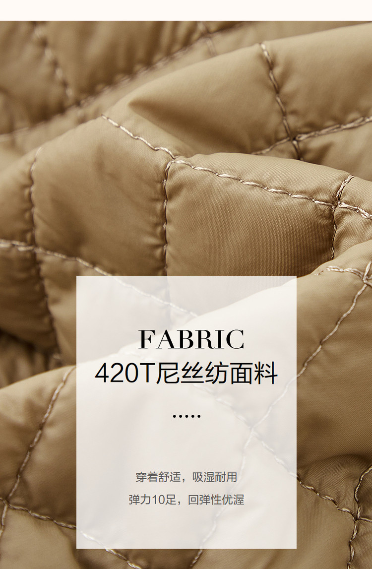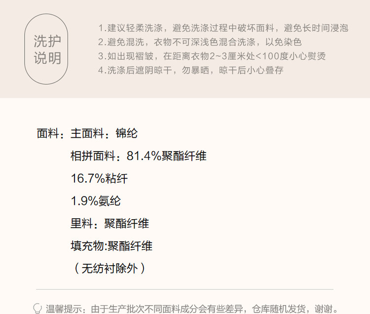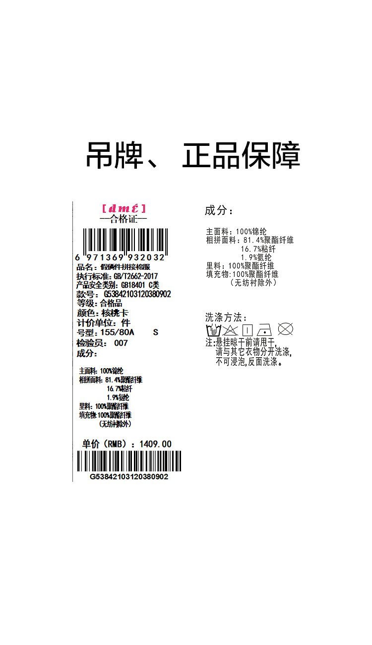 弹性: 微弹 版型: 常规 衣长: 常规 厚薄: 常规 风格: 时尚 适用季节: 秋,冬 领型: 西装领 衣门襟: 纽扣 袖型: 插肩袖 袖长: 长袖 适用人群: 青年 面料: 锦纶/尼龙 填充物: 涤纶/聚酯纤维 里材质: 涤纶/聚酯纤维 生产/经销/进口厂家: 宁波德玛纳瑞品服饰有限公司 适用性别: 女士 厂家地址: 安徽省芜湖市三山经济开发区保定街道焦弯路3号 洗涤说明: 凡是棉、麻、丝、毛天然面料都会有轻微褪色、变型、起皱、缩水现象,为减少或避免以上情况发生在洗涤保养上需特别小心。洗涤时应选用冷水(30度以下),中性或酸性洗衣手洗(丝、毛面料应选用专业洗衣液),不宜浸泡(2分钟左右),即泡即洗,不可氯漂。为避免染色,清洗与晾晒时,深浅色应分开,不宜拧过干,反面阴干 是否双面可穿: 否 是否连帽可脱卸: 否 详细材质信息: 主面料:100%锦纶 相拼面料:81.4%聚酯纤维 16.7%粘纤 1.9%氨纶 里料:100%聚酯纤维 填充物:100%聚酯纤维 (无纺衬除外) 主款式: 翻领棉服 主风格: 都市休闲 执行标准: GB/T2662-2017 产地: 中国 商品配件: 暂无 商品编码: G538421031203809 收起商品展示IMAGE