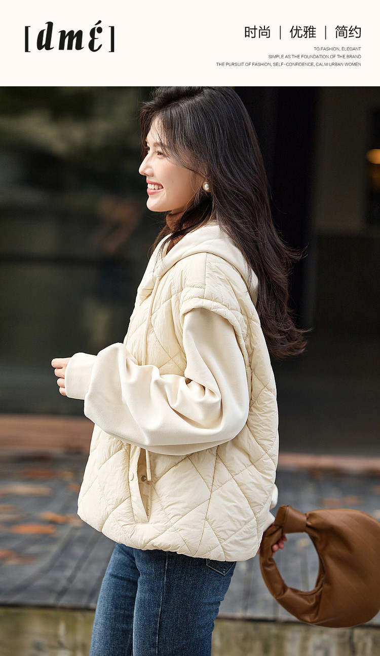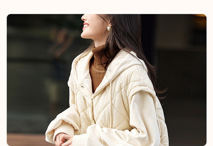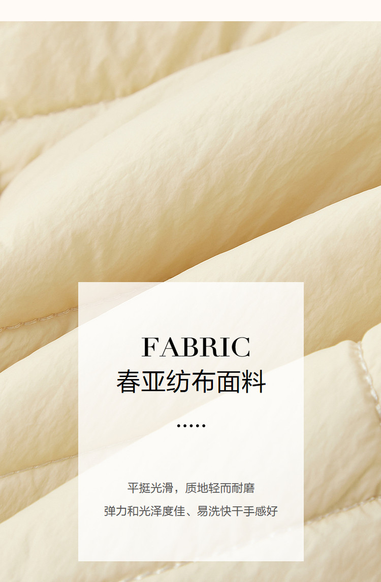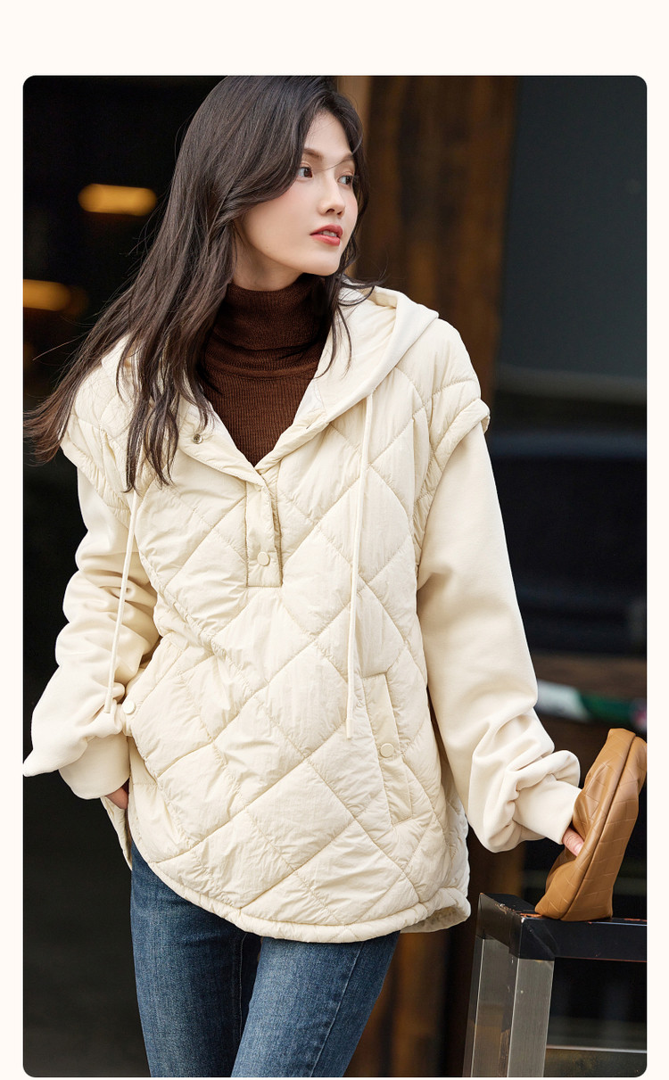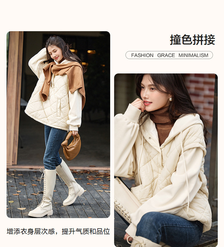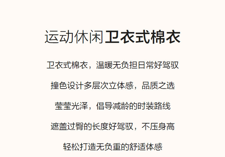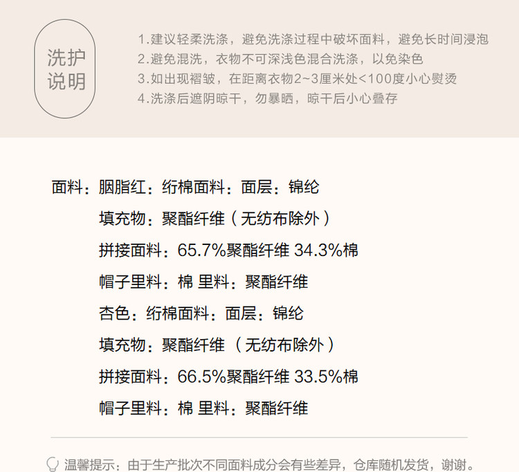 弹性: 微弹 版型: 常规 衣长: 短 厚薄: 厚 风格: 运动休闲 适用季节: 秋,冬 领型: 连帽 衣门襟: 无扣无拉链 袖型: 落肩袖 袖长: 长袖 适用人群: 青年 面料: 锦纶/尼龙 填充物: 涤纶/聚酯纤维 里材质: 涤纶/聚酯纤维 生产/经销/进口厂家: 宁波德玛纳瑞品服饰有限公司 适用性别: 女士 厂家地址: 安徽省芜湖市三山经济开发区保定街道焦弯路3号 洗涤说明: 凡是棉、麻、丝、毛天然面料都会有轻微褪色、变型、起皱、缩水现象,为减少或避免以上情况发生在洗涤保养上需特别小心。洗涤时应选用冷水(30度以下),中性或酸性洗衣手洗(丝、毛面料应选用专业洗衣液),不宜浸泡(2分钟左右),即泡即洗,不可氯漂。为避免染色,清洗与晾晒时,深浅色应分开,不宜拧过干,反面阴干 是否双面可穿: 否 是否连帽可脱卸: 否 详细材质信息: 胭脂红:绗棉面料:面层:100%锦纶 填充物:100%聚酯纤维 (无纺布除外) 拼接面料:65.7%聚酯纤维 34.3%棉 帽子里料:100%棉 里料:100%聚酯纤维 杏色:绗棉面料:面层:100%锦纶 填充物:100%聚酯纤维 (无纺布除外) 拼接面料:66.5%聚酯纤维 33.5%棉 帽子里料:100%棉 里料:100%聚酯纤维 主款式: 连帽棉服 主风格: 都市休闲 执行标准: GB/T2662-2017 产地: 中国 商品配件: 暂无 商品编码: G538421032718804 收起商品展示IMAGE