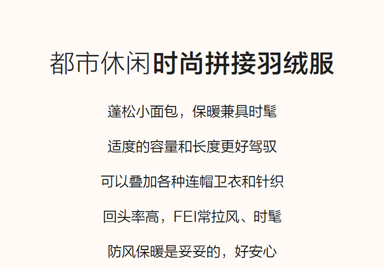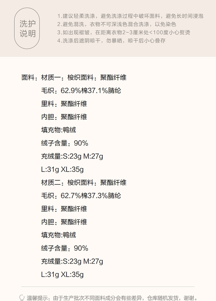 弹性: 微弹 版型: 直筒 衣长: 常规 厚薄: 厚 风格: 通勤 适用季节: 秋,冬 领型: 立领 衣门襟: 拉链 袖型: 插肩袖 袖长: 长袖 适用人群: 青年 面料: 涤纶/聚酯纤维 填充物: 灰鸭绒,白鸭绒 填充物含量区间: 90%及以上 上市年份: 2023 充绒量区间: 100g以下 生产/经销/进口厂家: 宁波德玛纳瑞品服饰有限公司 适用性别: 女士 厂家地址: 安徽省芜湖市三山经济开发区保定街道焦弯路3号 洗涤说明: 凡是棉、麻、丝、毛天然面料都会有轻微褪色、变型、起皱、缩水现象,为减少或避免以上情况发生在洗涤保养上需特别小心。洗涤时应选用冷水(30度以下),中性或酸性洗衣手洗(丝、毛面料应选用专业洗衣液),不宜浸泡(2分钟左右),即泡即洗,不可氯漂。为避免染色,清洗与晾晒时,深浅色应分开,不宜拧过干,反面阴干 是否双面可穿: 否 是否连帽可脱卸: 否 详细材质信息: 材质一:梭织面料:100%聚酯纤维 毛织:62.9%棉 37.1%腈纶 里料:100%聚酯纤维 内胆:100%聚酯纤维 填充物:鸭绒绒子含量:90%充绒量:S:23g M:27g L:31g XL:35g 材质二:梭织面料:100%聚酯纤维 毛织:62.7%棉 37.3%腈纶 里料:100%聚酯纤维 内胆:100%聚酯纤维 填充物:鸭绒绒子含量:90%充绒量:S:23g M:27g L:31g XL:35g 主款式: 三防羽绒 主风格: 商务通勤 尺码详细充绒量: 100g以下 执行标准: GB/T14272-2021 毛领: 无毛领 产地: 中国 商品配件: 暂无 商品编码: G538421122208902 收起商品展示IMAGE
