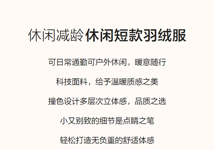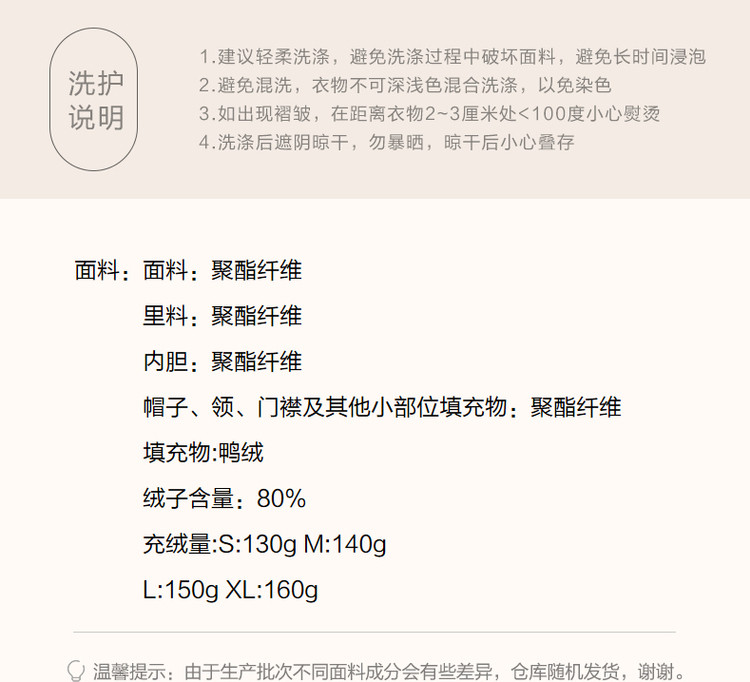 弹性: 无弹 版型: 直筒 衣长: 短 厚薄: 厚 风格: 通勤 适用季节: 秋,冬 领型: 立领 衣门襟: 拉链 袖型: 常规 袖长: 长袖 适用人群: 青年 面料: 涤纶/聚酯纤维 填充物: 灰鸭绒,白鸭绒 填充物含量区间: 80%~89% 充绒量区间: 100g(含)-150g(不含) 生产/经销/进口厂家: 宁波德玛纳瑞品服饰有限公司 适用性别: 女士 厂家地址: 安徽省芜湖市三山经济开发区保定街道焦弯路3号 洗涤说明: 凡是棉、麻、丝、毛天然面料都会有轻微褪色、变型、起皱、缩水现象,为减少或避免以上情况发生在洗涤保养上需特别小心。洗涤时应选用冷水(30度以下),中性或酸性洗衣手洗(丝、毛面料应选用专业洗衣液),不宜浸泡(2分钟左右),即泡即洗,不可氯漂。为避免染色,清洗与晾晒时,深浅色应分开,不宜拧过干,反面阴干 是否双面可穿: 否 是否连帽可脱卸: 否 详细材质信息: 面料:100%聚酯纤维 里料:100%聚酯纤维 内胆:100%聚酯纤维 帽子、领、门襟及其他小部位填充物:100%聚酯纤维 填充物:鸭绒 绒子含量:80% 充绒量:S:130g M:140g L:150g XL:160g 主款式: 短款羽绒 主风格: 商务通勤 尺码详细充绒量: 100g-150g(不含);150g(含)-200g(不含) 执行标准: GB/T14272-2021 毛领: 无毛领 产地: 中国 商品配件: 暂无 商品编码: G538421122215103 收起商品展示IMAGE