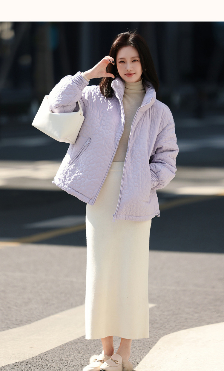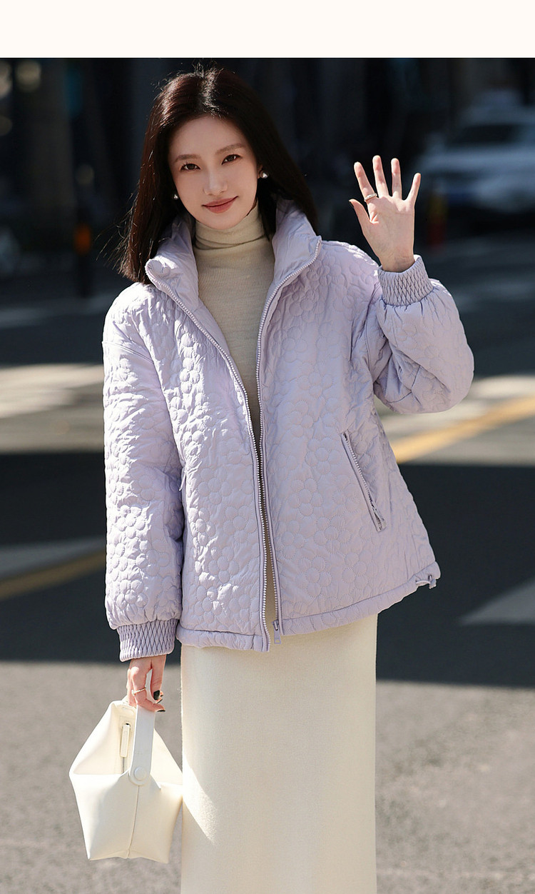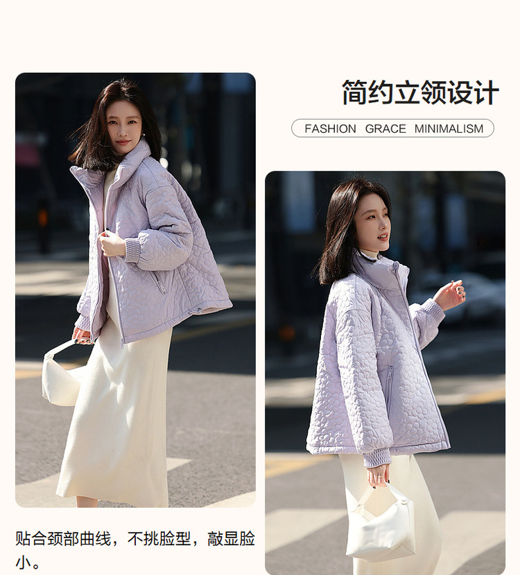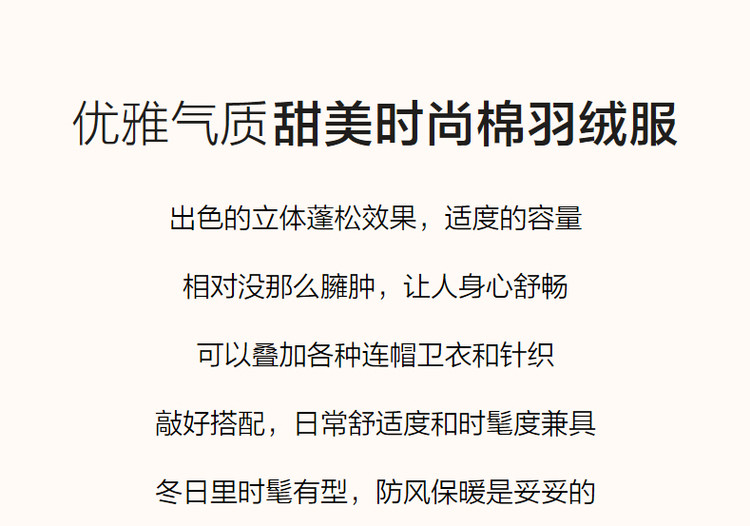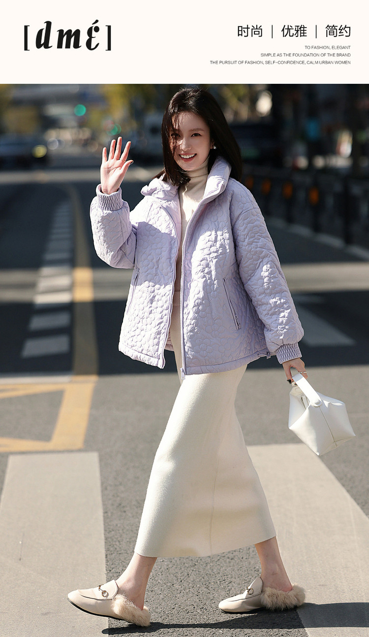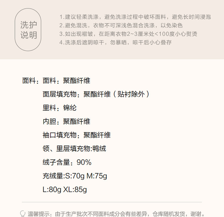 弹性: 无弹 版型: 直筒 衣长: 常规 厚薄: 厚 风格: 休闲 适用季节: 秋,冬 领型: 立领 衣门襟: 拉链 袖型: 落肩袖 袖长: 长袖 适用人群: 青年 面料: 涤纶/聚酯纤维 填充物: 白鸭绒 填充物含量区间: 90%及以上 充绒量区间: 100g以下 生产/经销/进口厂家: 宁波德玛纳瑞品服饰有限公司 适用性别: 女士 厂家地址: 安徽省芜湖市三山经济开发区保定街道焦弯路3号 洗涤说明: 凡是棉、麻、丝、毛天然面料都会有轻微褪色、变型、起皱、缩水现象,为减少或避免以上情况发生在洗涤保养上需特别小心。洗涤时应选用冷水(30度以下),中性或酸性洗衣手洗(丝、毛面料应选用专业洗衣液),不宜浸泡(2分钟左右),即泡即洗,不可氯漂。为避免染色,清洗与晾晒时,深浅色应分开,不宜拧过干,反面阴干 是否双面可穿: 否 是否连帽可脱卸: 否 详细材质信息: 面料:100%聚酯纤维 面层填充物:100%聚酯纤维(贴衬除外) 里料:100%锦纶 内胆:100%聚酯纤维 袖口填充物:100%聚酯纤维 领、里层填充物:鸭绒 绒子含量:90% 充绒量:S:70g M:75g L:80g XL:85g 主款式: 立领羽绒 主风格: 都市休闲 尺码详细充绒量: 100g以下 执行标准: Q/DMN 022-2023 毛领: 无毛领 产地: 中国 商品配件: 暂无 商品编码: G538421122713702 收起商品展示IMAGE