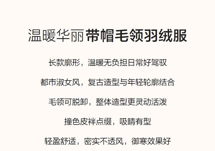 弹性: 无弹 版型: 直筒 衣长: 长 厚薄: 常规 风格: 通勤 适用季节: 秋,冬 领型: 连帽 衣门襟: 拉链 袖型: 插肩袖 袖长: 长袖 适用人群: 青年 面料: 涤纶/聚酯纤维 填充物: 鸭绒 填充物含量区间: 90%及以上 充绒量区间: 150g(含)-200g(不含) 生产/经销/进口厂家: 宁波德玛纳瑞品服饰有限公司 适用性别: 女士 厂家地址: 安徽省芜湖市三山经济开发区保定街道焦弯路3号 洗涤说明: 凡是棉、麻、丝、毛天然面料都会有轻微褪色、变型、起皱、缩水现象,为减少或避免以上情况发生在洗涤保养上需特别小心。洗涤时应选用冷水(30度以下),中性或酸性洗衣手洗(丝、毛面料应选用专业洗衣液),不宜浸泡(2分钟左右),即泡即洗,不可氯漂。为避免染色,清洗与晾晒时,深浅色应分开,不宜拧过干,反面阴干 是否双面可穿: 否 是否连帽可脱卸: 否 详细材质信息: 面料:100%聚酯纤维 (非纤维物质除外) 里料:100%聚酯纤维 内胆:100%聚酯纤维 门襟及其他小部位填充物:100%聚酯纤维 毛条:貉子毛 填充物:鸭绒 绒子含量:90% 充绒量:S:175g M:185g L:195g XL:205g 主款式: 连帽羽绒 主风格: 极简 尺码详细充绒量: 150g(含)-200g(不含) 执行标准: GB/T14272-2021 毛领: 带毛领 产地: 中国 商品配件: 暂无 商品编码: G538421142410104 收起商品展示IMAGE