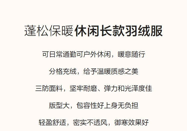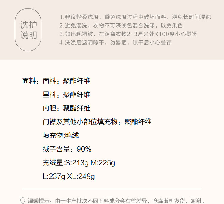 弹性: 无弹 版型: 直筒 衣长: 长 厚薄: 厚 风格: 通勤 适用季节: 秋,冬 领型: 翻领 衣门襟: 单排扣 袖型: 常规 袖长: 长袖 适用人群: 青年 面料: 涤纶/聚酯纤维 填充物: 鸭绒 填充物含量区间: 90%及以上 充绒量区间: 200g(含)-250g(不含) 生产/经销/进口厂家: 宁波德玛纳瑞品服饰有限公司 适用性别: 女士 厂家地址: 安徽省芜湖市三山经济开发区保定街道焦弯路3号 洗涤说明: 凡是棉、麻、丝、毛天然面料都会有轻微褪色、变型、起皱、缩水现象,为减少或避免以上情况发生在洗涤保养上需特别小心。洗涤时应选用冷水(30度以下),中性或酸性洗衣手洗(丝、毛面料应选用专业洗衣液),不宜浸泡(2分钟左右),即泡即洗,不可氯漂。为避免染色,清洗与晾晒时,深浅色应分开,不宜拧过干,反面阴干 是否双面可穿: 否 是否连帽可脱卸: 否 详细材质信息: 面料:100%聚酯纤维 里料:100%聚酯纤维 内胆:100%聚酯纤维 门襟及其他小部位填充物:100%聚酯纤维 填充物:鸭绒 绒子含量:90% 充绒量:S:213g M:225g L:237g XL:249g 主款式: 棒球服 主风格: 都市休闲 尺码详细充绒量: 200g(含)-250g(不含) 执行标准: GB/T14272-2021 毛领: 无毛领 产地: 中国 商品配件: 暂无 商品编码: G538421151209902 收起商品展示IMAGE