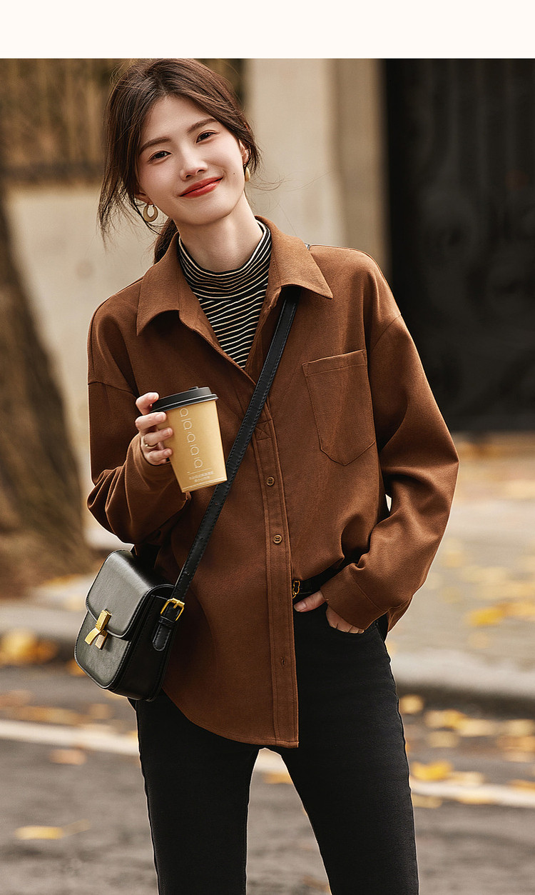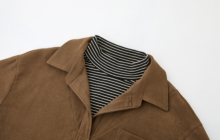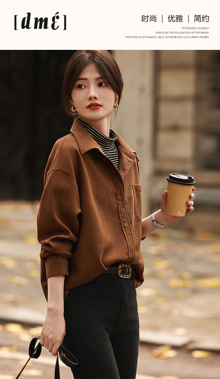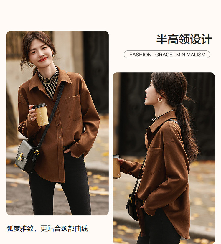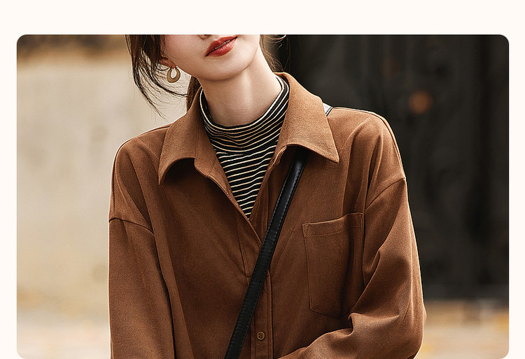 弹性: 无弹 版型: 常规 衣长: 常规 厚薄: 厚 风格: 都市 流行元素: 撞色 适用季节: 秋,冬 领型: 翻领 袖型: 衬衫袖 袖长: 长袖 面料: 涤纶/聚酯纤维 肩型: 常规肩 生产/经销/进口厂家: 宁波德玛纳瑞品服饰有限公司 适用性别: 女士 厂家地址: 安徽省芜湖市三山经济开发区保定街道焦弯路3号 洗涤说明: 凡是棉、麻、丝、毛天然面料都会有轻微褪色、变型、起皱、缩水现象,为减少或避免以上情况发生在洗涤保养上需特别小心。洗涤时应选用冷水(30度以下),中性或酸性洗衣手洗(丝、毛面料应选用专业洗衣液),不宜浸泡(2分钟左右),即泡即洗,不可氯漂。为避免染色,清洗与晾晒时,深浅色应分开,不宜拧过干,反面阴干 详细材质信息: 梭织面料:98.7%聚酯纤维 1.3%氨纶 针织面料:94%聚酯纤维 6%氨纶 主款式: 通勤衬衫 主风格: 都市休闲 执行标准: Q/DMN 017-2023 产地: 中国 商品配件: 暂无 商品编码: G538421241401817 收起商品展示IMAGE