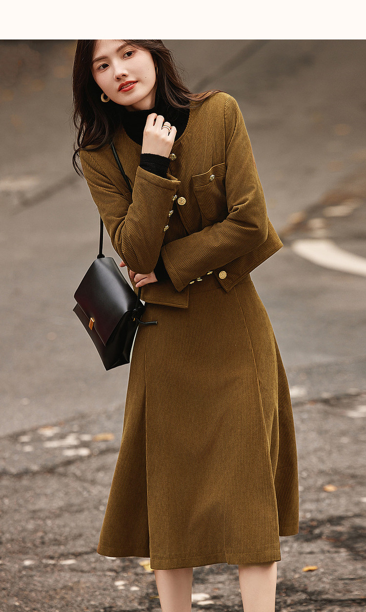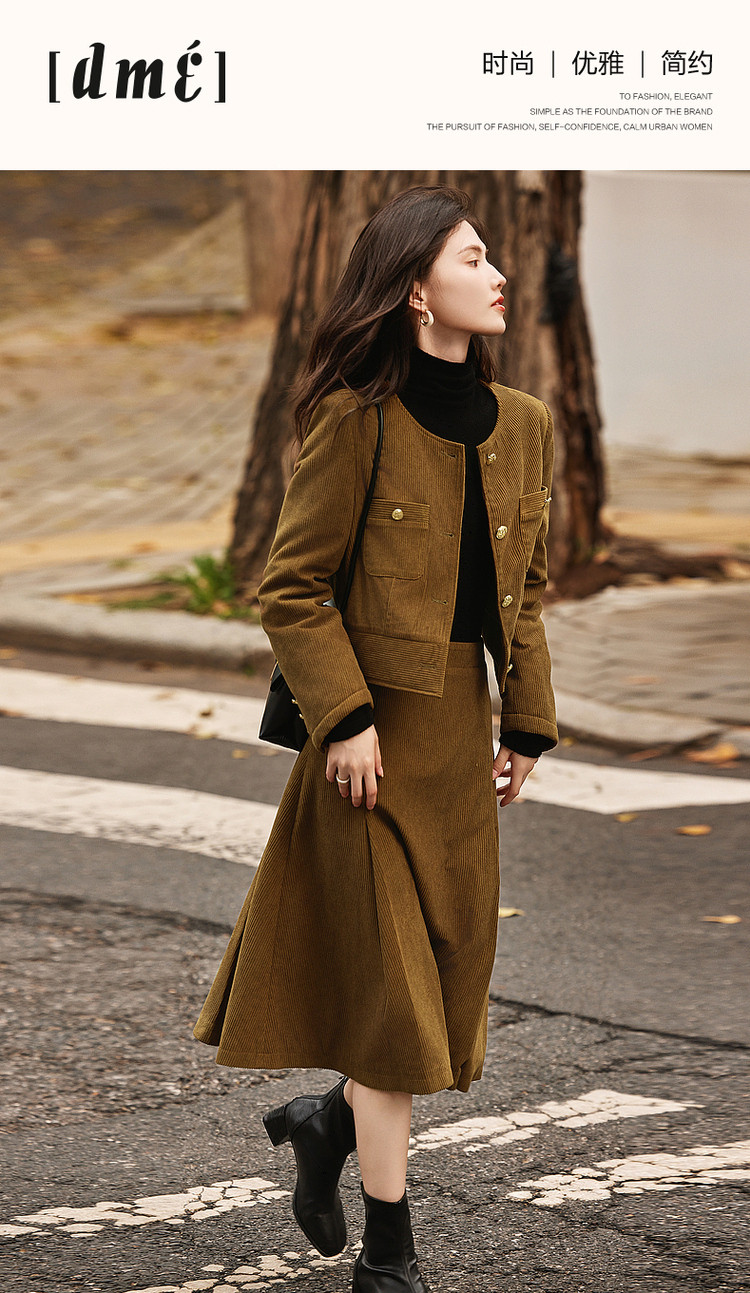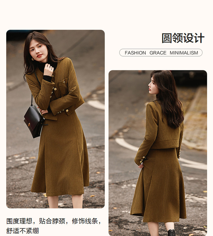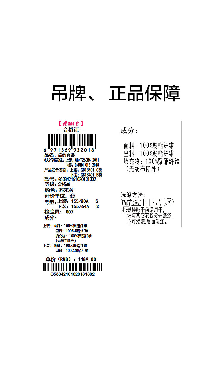 弹性: 微弹 版型: 常规 衣长: 常规 风格: 通勤 流行元素: 纽扣 适用场景: 日常 适用季节: 秋,冬 领型: 圆领 袖型: 常规 袖长: 长袖 适用人群: 青年 面料: 涤纶/聚酯纤维 款式: 通勤套装 套装形式: 上衣+裙 上市年份: 2023 规格数量: 两件 生产/经销/进口厂家: 宁波德玛纳瑞品服饰有限公司 适用性别: 女士 厂家地址: 安徽省芜湖市三山经济开发区保定街道焦弯路3号 洗涤说明: 凡是棉、麻、丝、毛天然面料都会有轻微褪色、变型、起皱、缩水现象,为减少或避免以上情况发生在洗涤保养上需特别小心。洗涤时应选用冷水(30度以下),中性或酸性洗衣手洗(丝、毛面料应选用专业洗衣液),不宜浸泡(2分钟左右),即泡即洗,不可氯漂。为避免染色,清洗与晾晒时,深浅色应分开,不宜拧过干,反面阴干 详细材质信息: 上装:面料:100%聚酯纤维 里料:100%聚酯纤维 填充物:100%聚酯纤维 (无纺布除外) 下装:面料:100%聚酯纤维 里料:100%聚酯纤维 主款式: 连衣裙套装 主风格: 商务通勤 执行标准: 上装:GB/T26384-2011下装:Q/DMN 016-2018 产地: 中国 商品配件: 暂无 商品编码: G538421610201313 收起商品展示IMAGE