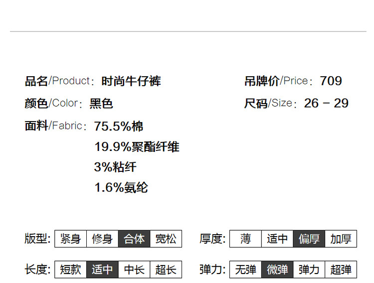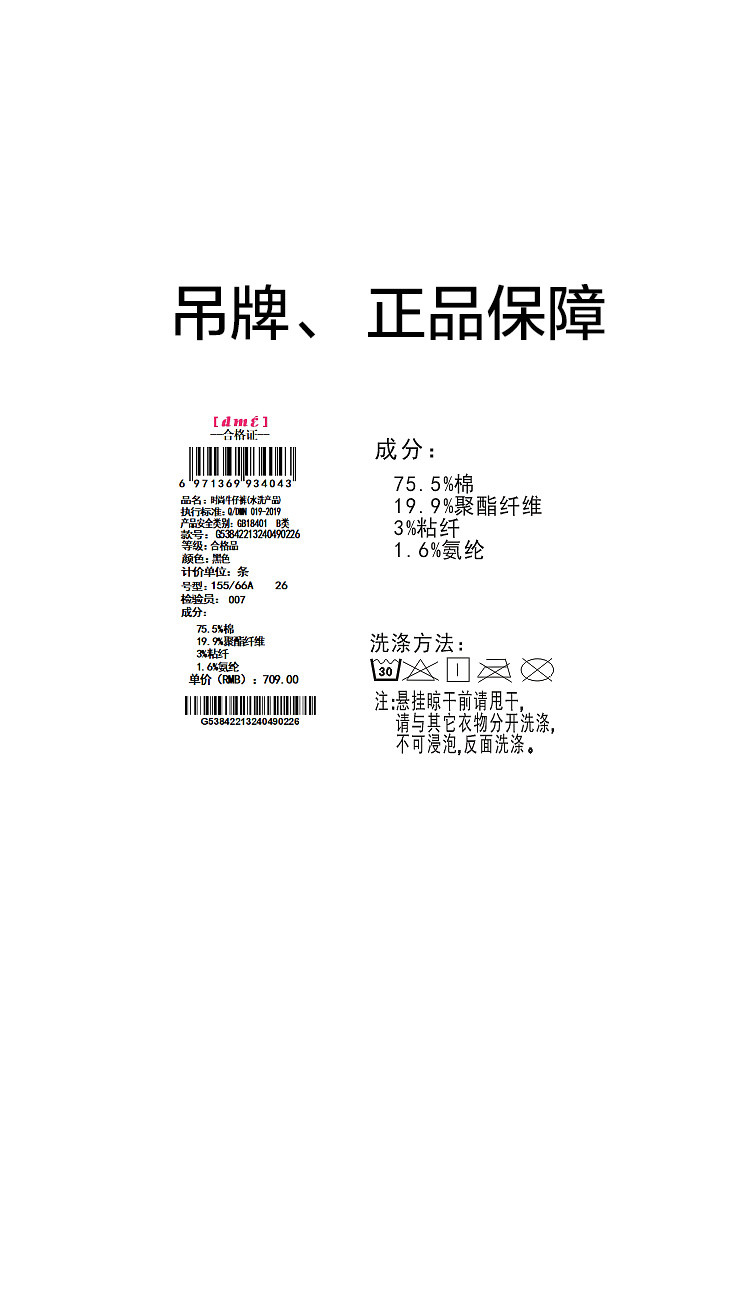 弹性: 微弹 版型: 修身 裤长: 九分裤 风格: 休闲风 流行元素: 口袋 适用季节: 秋,冬 腰型: 高腰 适用人群: 青年 面料: 涤纶/聚酯纤维 款式: 小脚裤 裤门襟: 拉链 生产/经销/进口厂家: 宁波德玛纳瑞品服饰有限公司 适用性别: 女士 厂家地址: 安徽省芜湖市三山经济开发区保定街道焦弯路3号 洗涤说明: 凡是棉、麻、丝、毛天然面料都会有轻微褪色、变型、起皱、缩水现象,为减少或避免以上情况发生在洗涤保养上需特别小心。洗涤时应选用冷水(30度以下),中性或酸性洗衣手洗(丝、毛面料应选用专业洗衣液),不宜浸泡(2分钟左右),即泡即洗,不可氯漂。为避免染色,清洗与晾晒时,深浅色应分开,不宜拧过干,反面阴干 详细材质信息: 75.5%棉 19.9%聚酯纤维 3%粘纤 1.6%氨纶 主款式: 小脚裤 主风格: 都市休闲 执行标准: Q/DMN 019-2019 产地: 中国 商品配件: 暂无 商品编码: G538422132404902 收起商品展示IMAGE