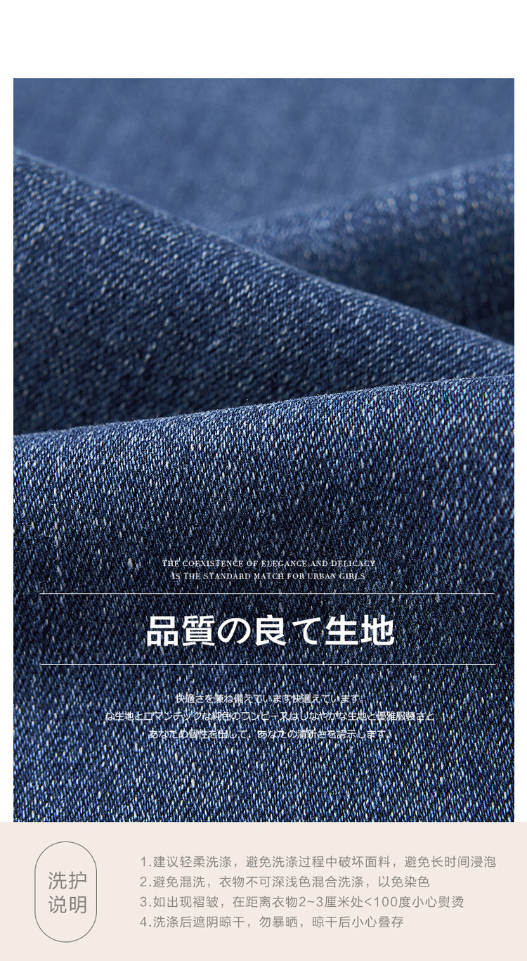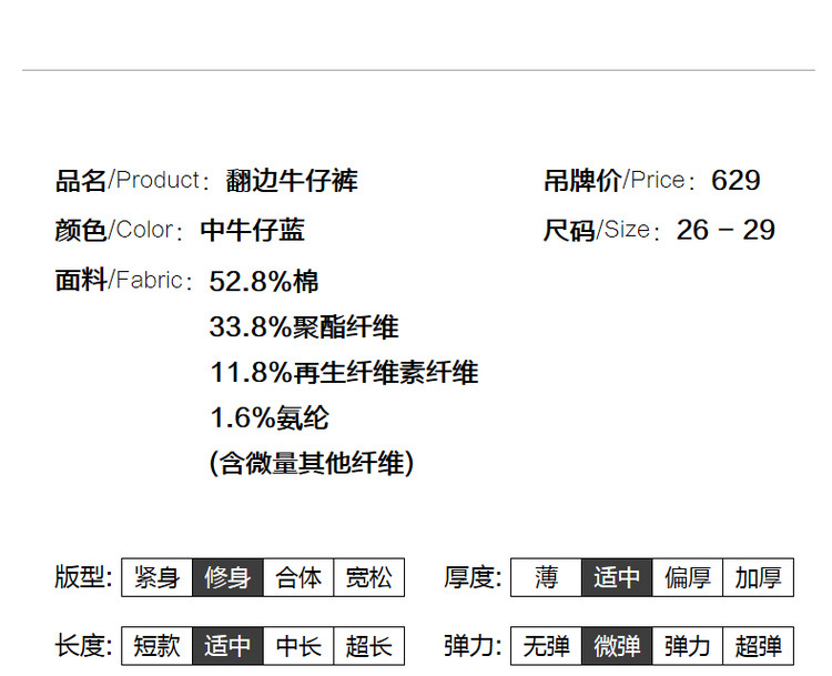 弹性: 中弹 版型: 修身 厚薄: 常规 裤长: 九分裤 风格: 高街 流行元素: 水洗,做旧,磨白 适用季节: 秋,冬 腰型: 中腰 适用人群: 青年 面料: 棉 款式: 牛仔裤 裤门襟: 拉链 生产/经销/进口厂家: 宁波德玛纳瑞品服饰有限公司 适用性别: 女士 厂家地址: 安徽省芜湖市三山经济开发区保定街道焦弯路3号 洗涤说明: 凡是棉、麻、丝、毛天然面料都会有轻微褪色、变型、起皱、缩水现象,为减少或避免以上情况发生在洗涤保养上需特别小心。洗涤时应选用冷水(30度以下),中性或酸性洗衣手洗(丝、毛面料应选用专业洗衣液),不宜浸泡(2分钟左右),即泡即洗,不可氯漂。为避免染色,清洗与晾晒时,深浅色应分开,不宜拧过干,反面阴干 详细材质信息: 52.8%棉 33.8%聚酯纤维 11.8%再生纤维素纤维 1.6%氨纶 (含微量其他纤维) 主款式: 直筒裤 主风格: 都市休闲 执行标准: FZ/T81006-2017 产地: 中国 商品配件: 暂无 商品编码: G538422140127620 收起商品展示IMAGE