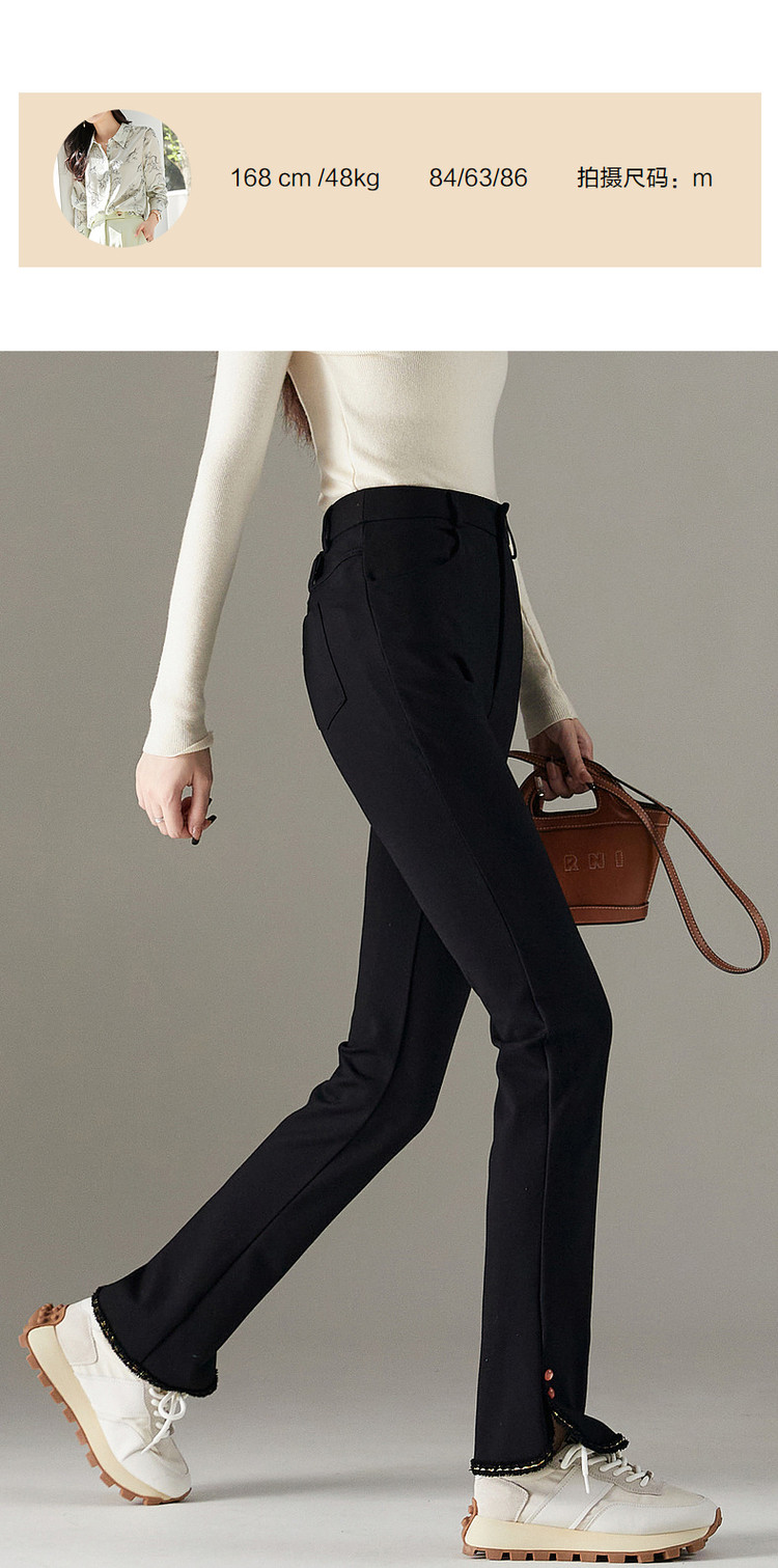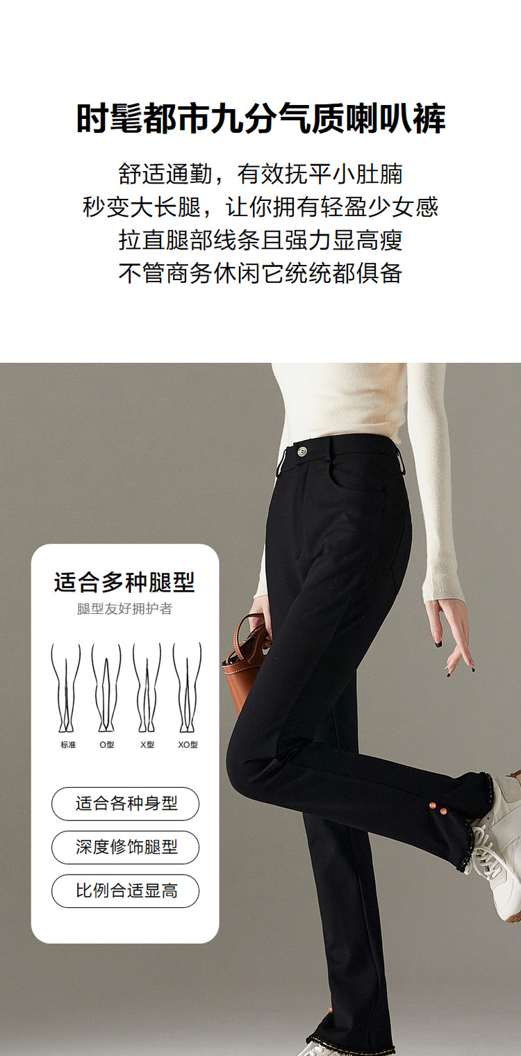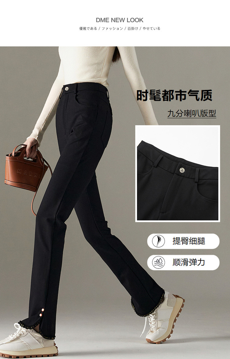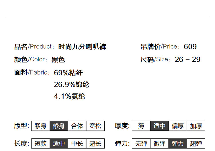 弹性: 中弹 版型: 修身 厚薄: 常规 裤长: 九分裤 风格: 通勤风 适用季节: 冬 腰型: 中腰 适用人群: 青年 面料: 锦纶/尼龙 款式: 喇叭裤 裤门襟: 拉链 生产/经销/进口厂家: 宁波德玛纳瑞品服饰有限公司 适用性别: 女士 厂家地址: 安徽省芜湖市三山经济开发区保定街道焦弯路3号 洗涤说明: 凡是棉、麻、丝、毛天然面料都会有轻微褪色、变型、起皱、缩水现象,为减少或避免以上情况发生在洗涤保养上需特别小心。洗涤时应选用冷水(30度以下),中性或酸性洗衣手洗(丝、毛面料应选用专业洗衣液),不宜浸泡(2分钟左右),即泡即洗,不可氯漂。为避免染色,清洗与晾晒时,深浅色应分开,不宜拧过干,反面阴干 详细材质信息: 69%粘纤 26.9%锦纶 4.1%氨纶 主款式: 喇叭裤 主风格: 商务通勤 执行标准: Q/DMN 016-2018 产地: 中国 商品配件: 暂无 商品编码: G538422230123902 收起商品展示IMAGE