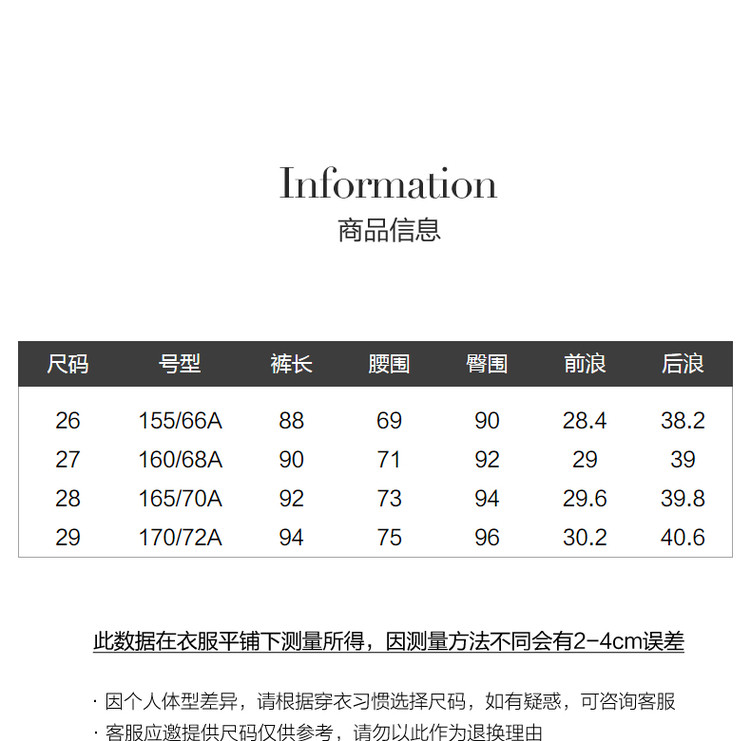 尺码 号型 腰围(cm) 臀围(cm) 裤长(cm) 26 155/66A 69 90 88 27 160/68A 71 92 90 28 165/70A 73 94 92 29 170/72A 75 96 94 温馨提示: 以上数据仅供参考,由于尺码是手工测量,所以难免存在1cm-2cm的误差 收起商品参数DETAIL