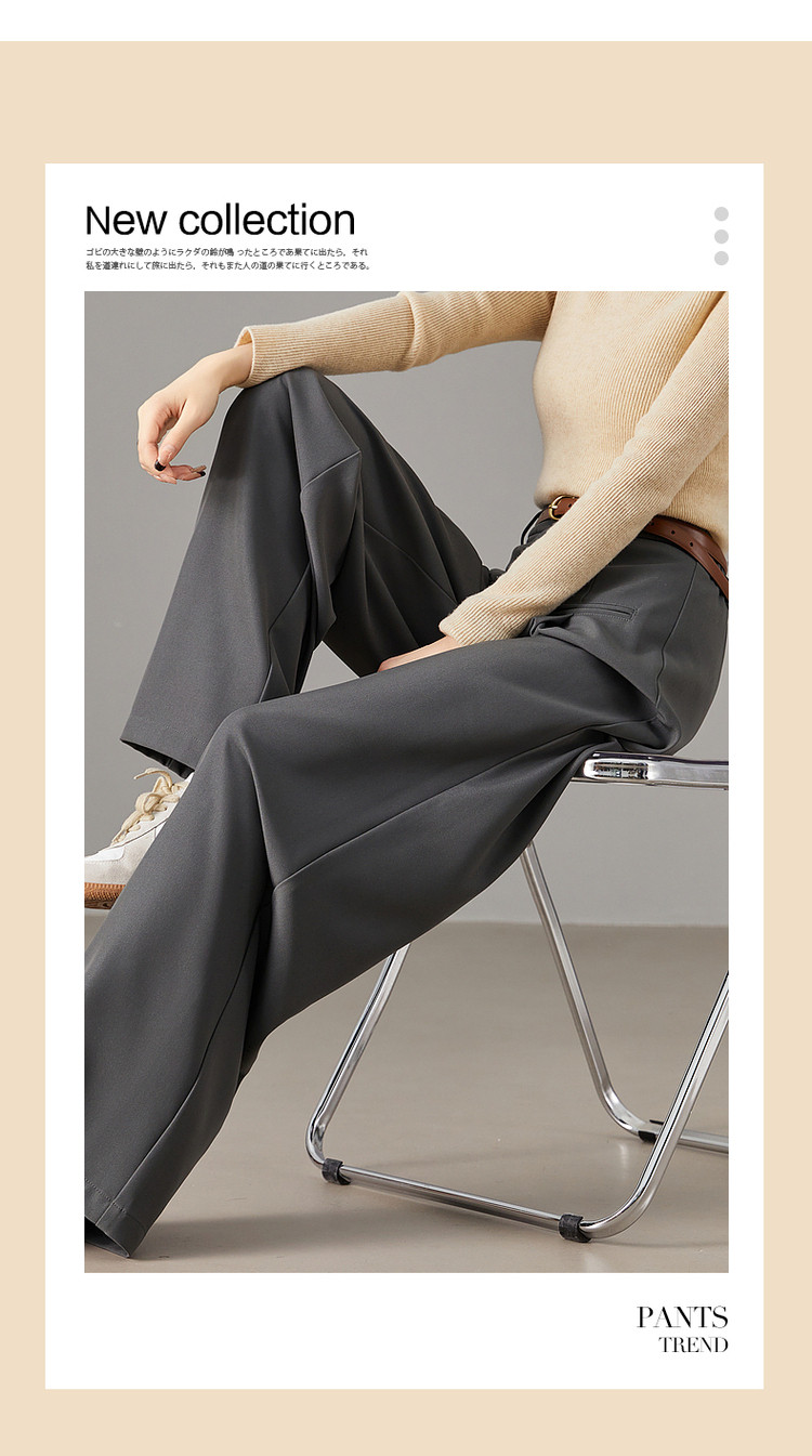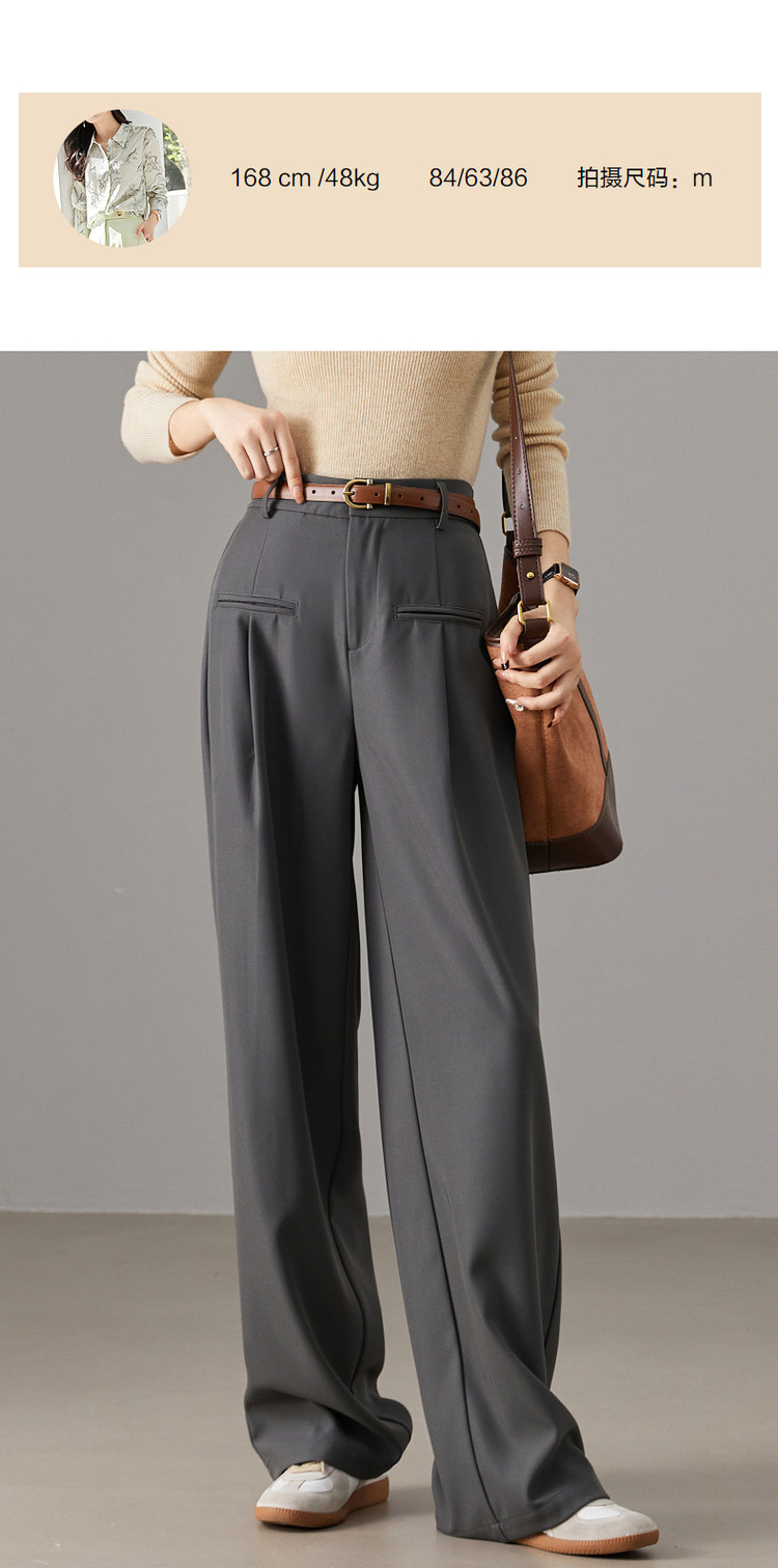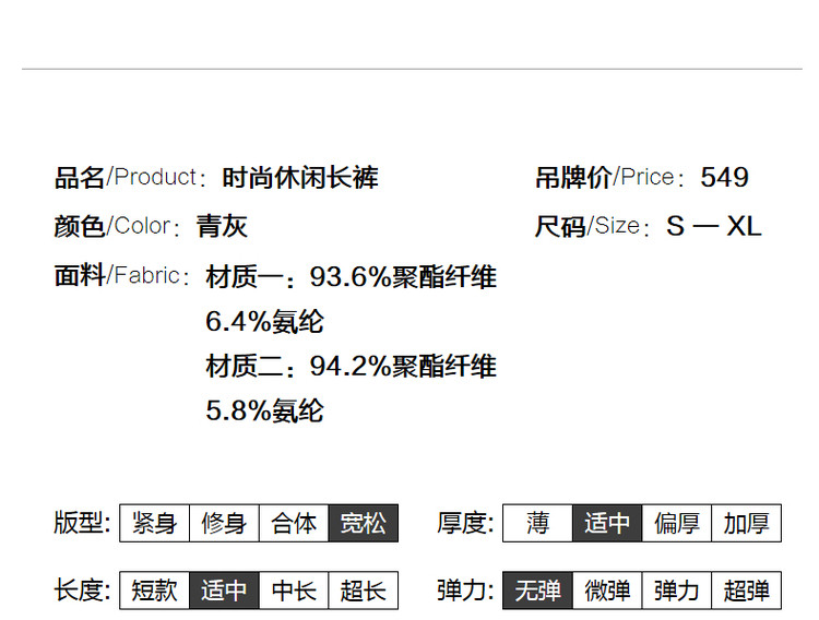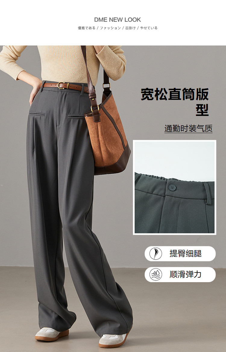 弹性: 无弹 版型: 宽松 厚薄: 常规 裤长: 长裤 风格: 通勤 适用季节: 春,秋 腰型: 中腰 适用人群: 青年 面料: 涤纶/聚酯纤维 款式: 直筒裤 裤门襟: 拉链 生产/经销/进口厂家: 宁波德玛纳瑞品服饰有限公司 适用性别: 女士 厂家地址: 安徽省芜湖市三山经济开发区保定街道焦弯路3号 洗涤说明: 凡是棉、麻、丝、毛天然面料都会有轻微褪色、变型、起皱、缩水现象,为减少或避免以上情况发生在洗涤保养上需特别小心。洗涤时应选用冷水(30度以下),中性或酸性洗衣手洗(丝、毛面料应选用专业洗衣液),不宜浸泡(2分钟左右),即泡即洗,不可氯漂。为避免染色,清洗与晾晒时,深浅色应分开,不宜拧过干,反面阴干 详细材质信息: 材质一:93.6%聚酯纤维 6.4%氨纶 材质二:94.2%聚酯纤维 5.8%氨纶 主款式: 直筒裤 主风格: 商务通勤 执行标准: Q/DMN 017-2023 FZ/T81007-2022 产地: 中国 商品配件: 暂无 商品编码: G538422240124207 收起商品展示IMAGE
