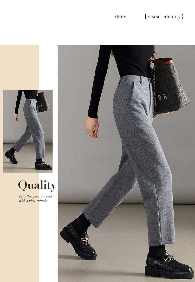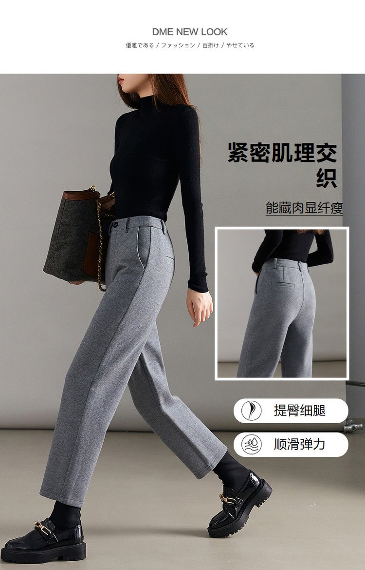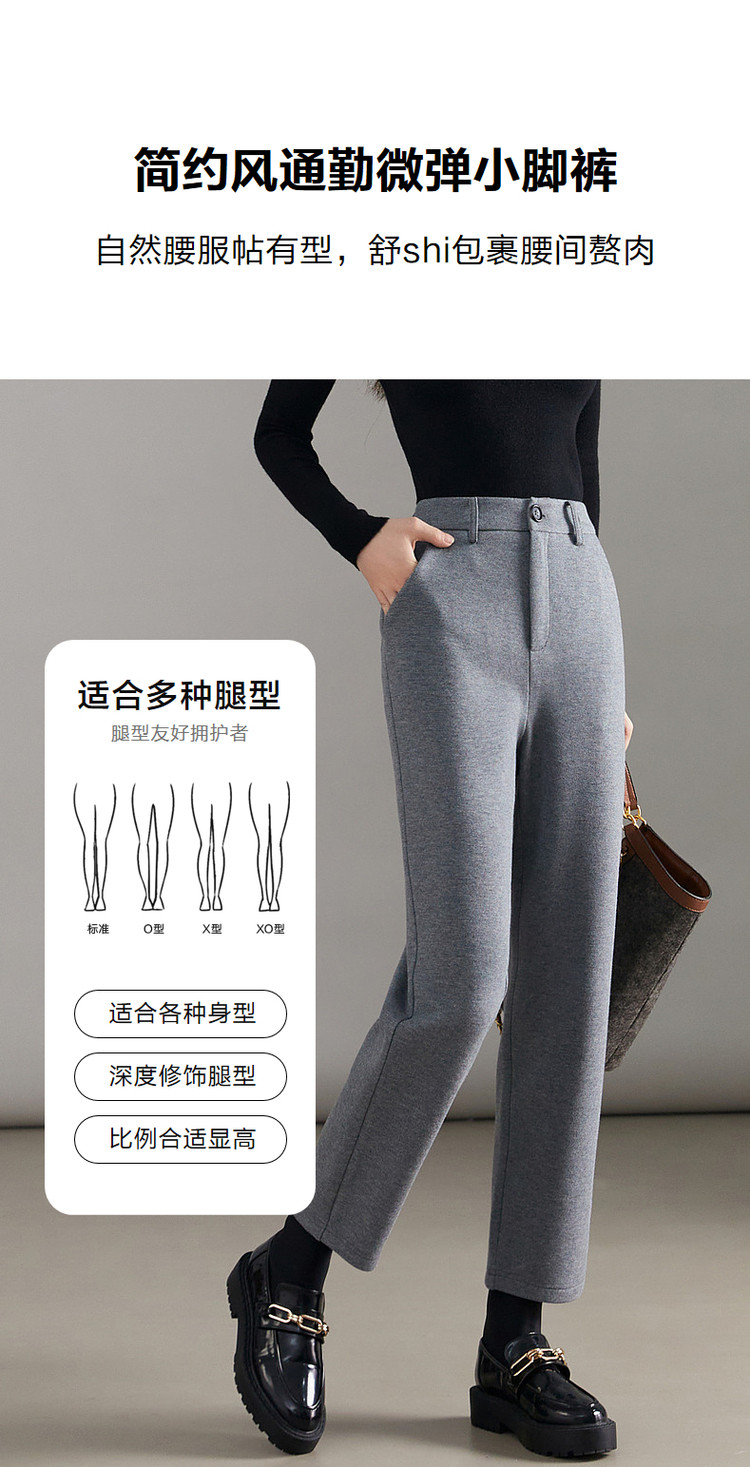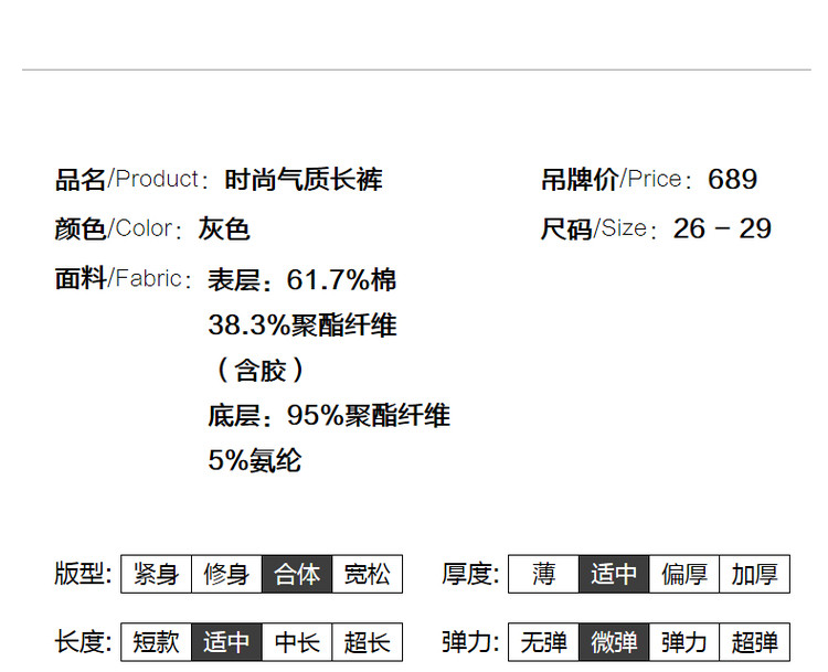 弹性: 微弹 版型: 常规 厚薄: 厚 裤长: 长裤 风格: 通勤风 适用季节: 春,秋 适用人群: 青年 面料: 涤纶/聚酯纤维 款式: 小脚裤,锥形裤 裤门襟: 拉链 生产/经销/进口厂家: 宁波德玛纳瑞品服饰有限公司 适用性别: 女士 厂家地址: 安徽省芜湖市三山经济开发区保定街道焦弯路3号 洗涤说明: 凡是棉、麻、丝、毛天然面料都会有轻微褪色、变型、起皱、缩水现象,为减少或避免以上情况发生在洗涤保养上需特别小心。洗涤时应选用冷水(30度以下),中性或酸性洗衣手洗(丝、毛面料应选用专业洗衣液),不宜浸泡(2分钟左右),即泡即洗,不可氯漂。为避免染色,清洗与晾晒时,深浅色应分开,不宜拧过干,反面阴干 详细材质信息: 表层:61.7%棉 38.3%聚酯纤维 (含胶) 底层:95%聚酯纤维 5%氨纶 主款式: 小脚裤 主风格: 商务通勤 执行标准: Q/DMN 016-2018 产地: 中国 商品配件: 暂无 商品编码: G538422242203201 收起商品展示IMAGE