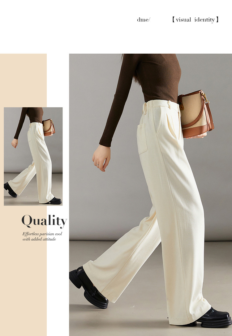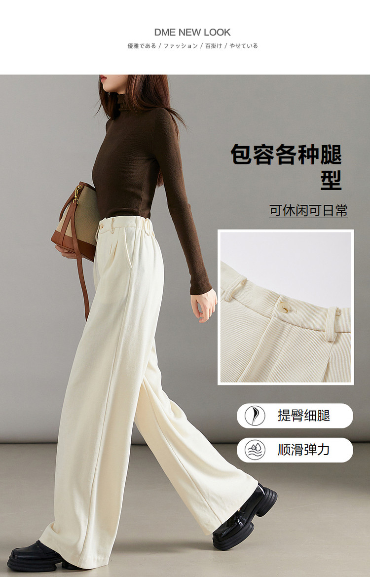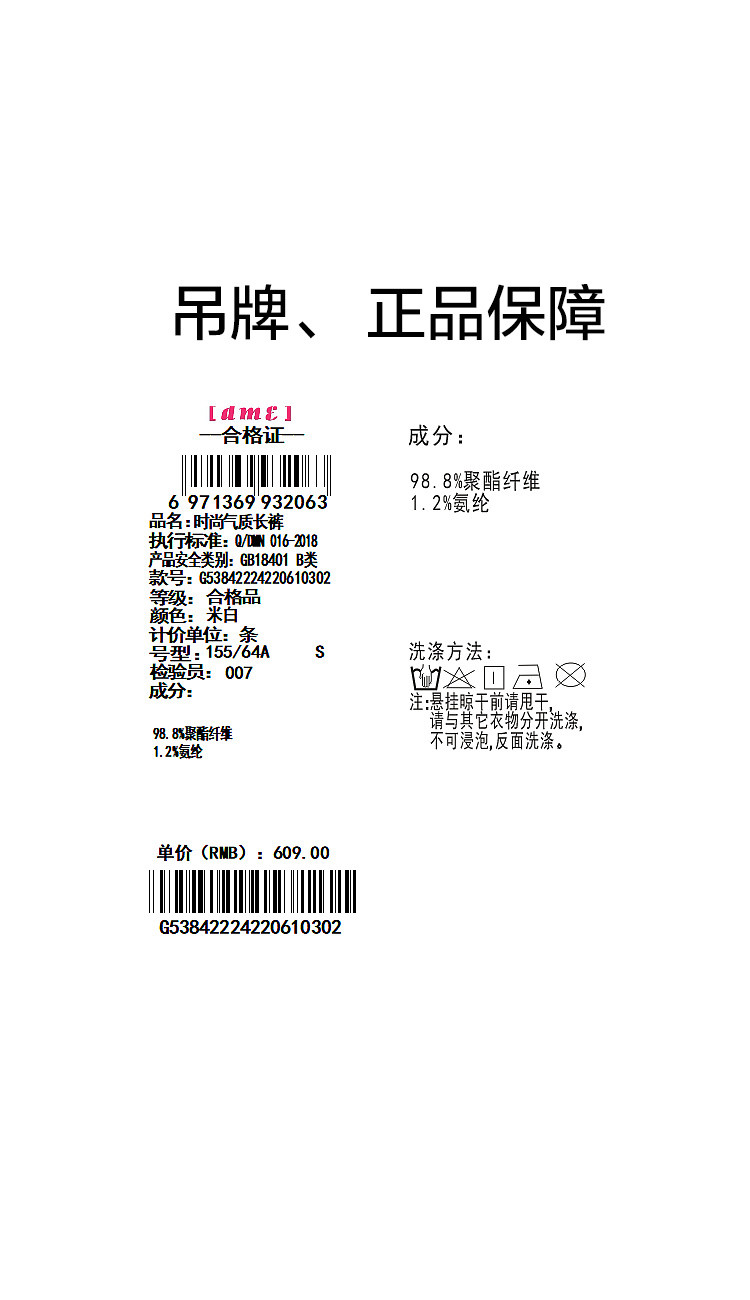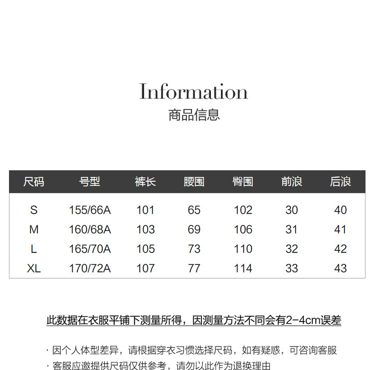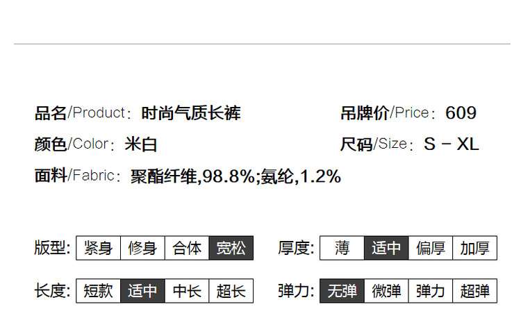 弹性: 微弹 版型: 直筒 厚薄: 厚 裤长: 长裤 风格: 通勤 适用季节: 秋,冬 适用人群: 青年 面料: 涤纶/聚酯纤维 款式: 阔腿裤,直筒裤 裤门襟: 拉链 生产/经销/进口厂家: 宁波德玛纳瑞品服饰有限公司 适用性别: 女士 厂家地址: 安徽省芜湖市三山经济开发区保定街道焦弯路3号 洗涤说明: 凡是棉、麻、丝、毛天然面料都会有轻微褪色、变型、起皱、缩水现象,为减少或避免以上情况发生在洗涤保养上需特别小心。洗涤时应选用冷水(30度以下),中性或酸性洗衣手洗(丝、毛面料应选用专业洗衣液),不宜浸泡(2分钟左右),即泡即洗,不可氯漂。为避免染色,清洗与晾晒时,深浅色应分开,不宜拧过干,反面阴干 详细材质信息: 聚酯纤维,98.8%;氨纶,1.2% 主款式: 运动裤 主风格: 商务通勤 执行标准: Q/DMN 016-2018 产地: 中国 商品配件: 暂无 商品编码: G538422242206103 收起商品展示IMAGE