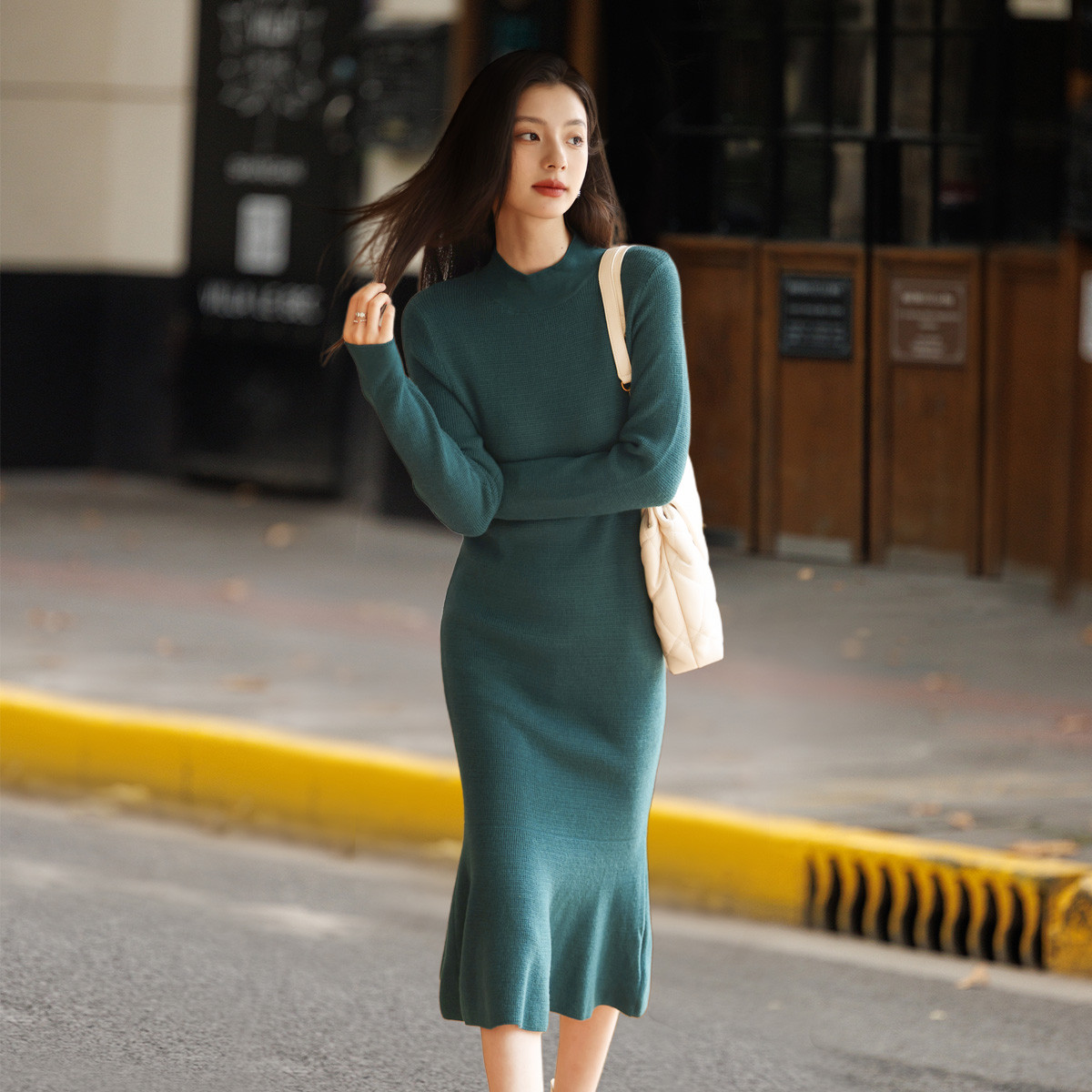 【复古鱼尾】秋冬复古风圆领保暖长袖针织半裙气质鱼尾针织连衣裙