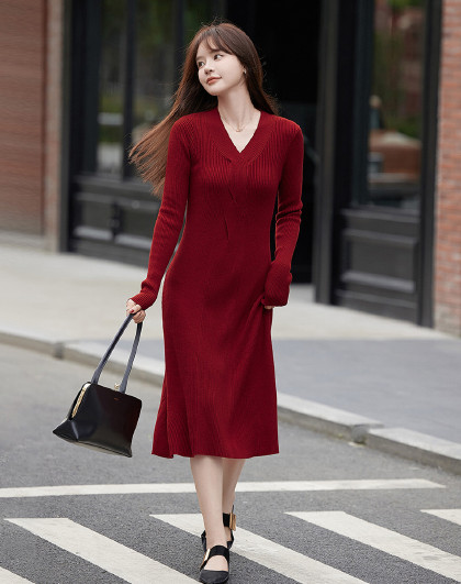 【优雅法式】2023秋新品法式扭结时尚V领长袖套头针织连衣裙