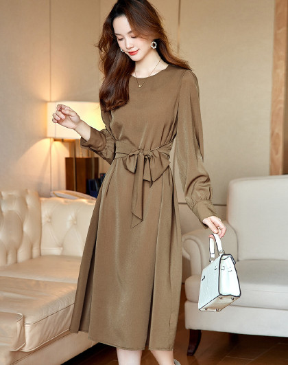 【圆领套头】春秋季款摩卡慕斯系腰带无领淑女风连衣裙