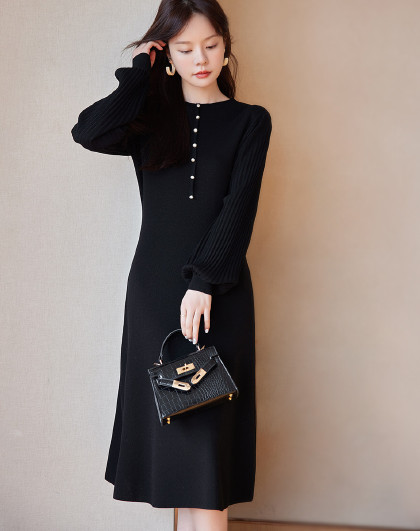 【仿亚麻】春秋季款法式浪费风圆领百褶袖收腰长袖连衣裙