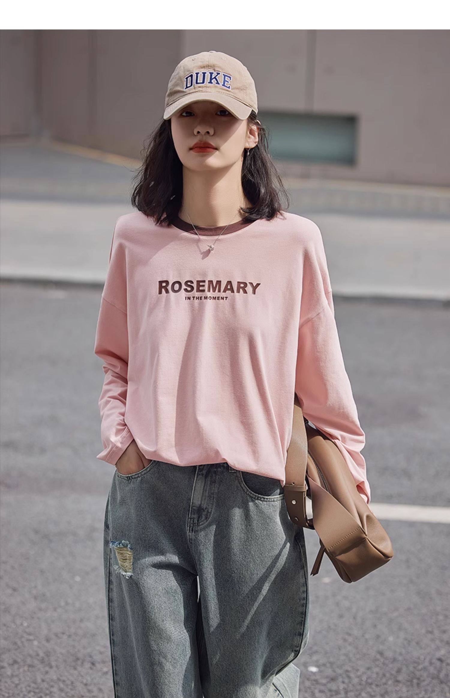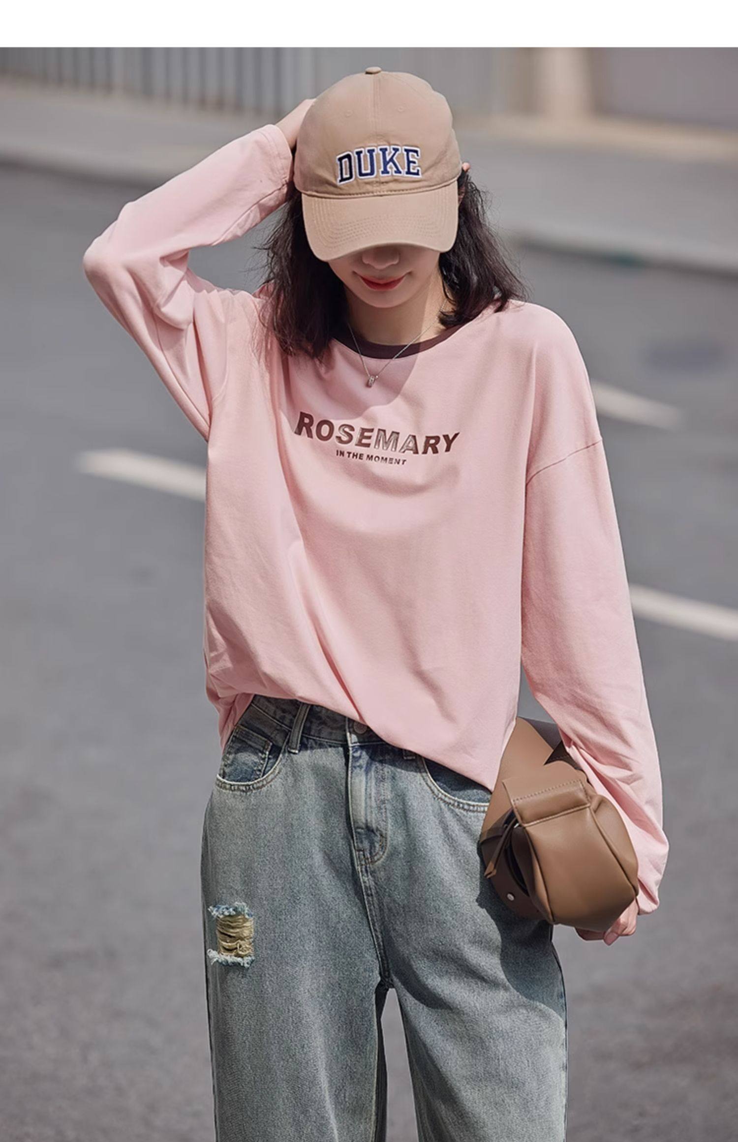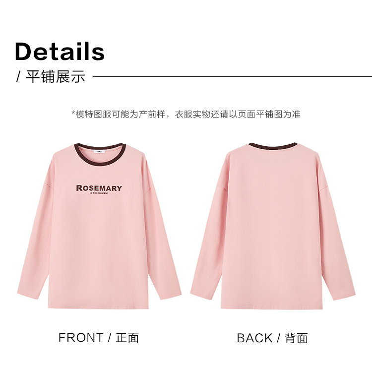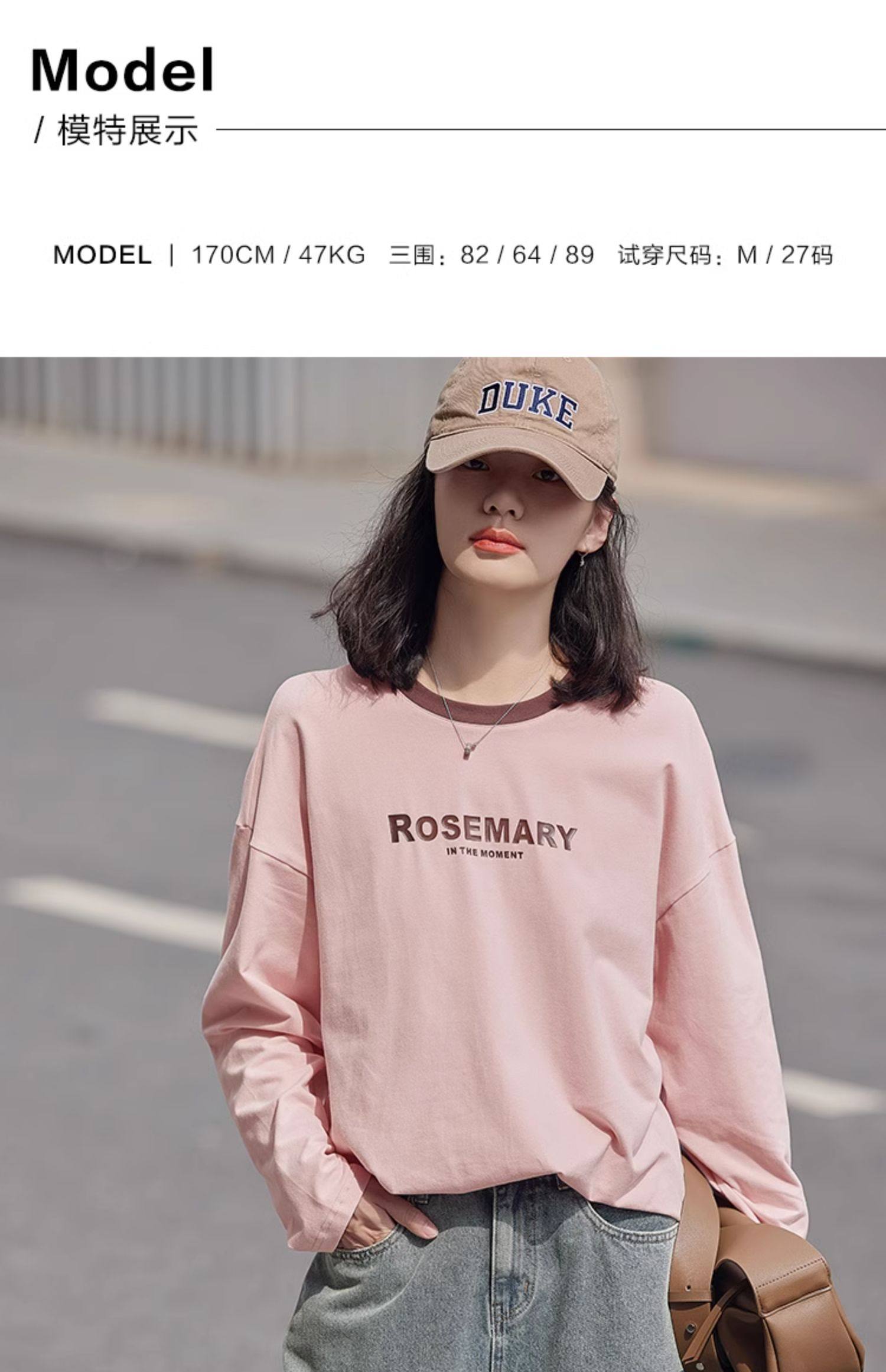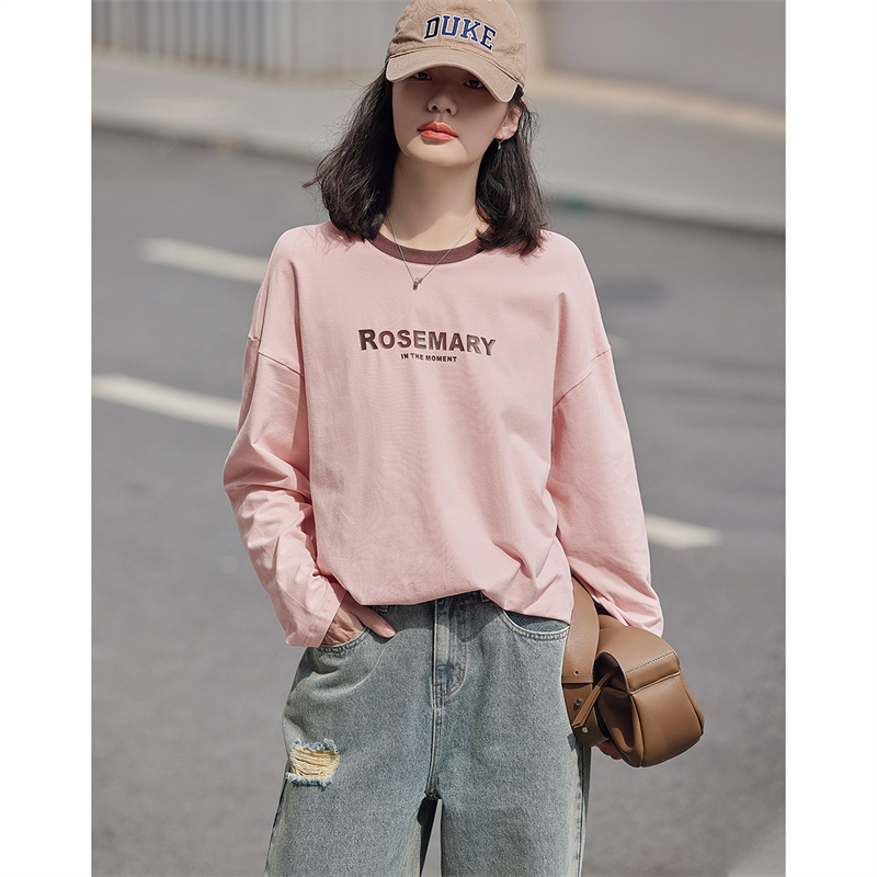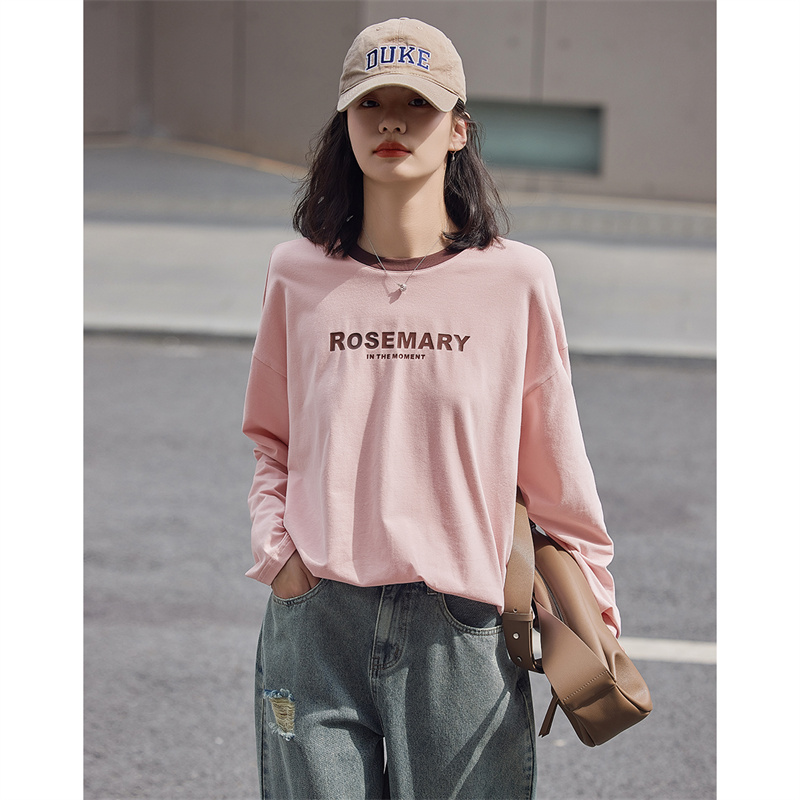 德玛纳粉色圆领长袖T恤女秋季新款显瘦内搭宽松休闲打底上衣