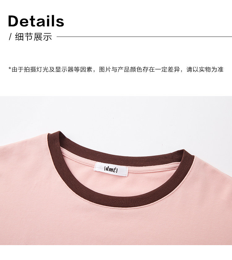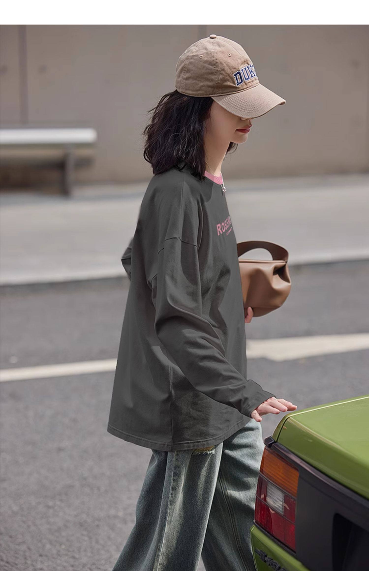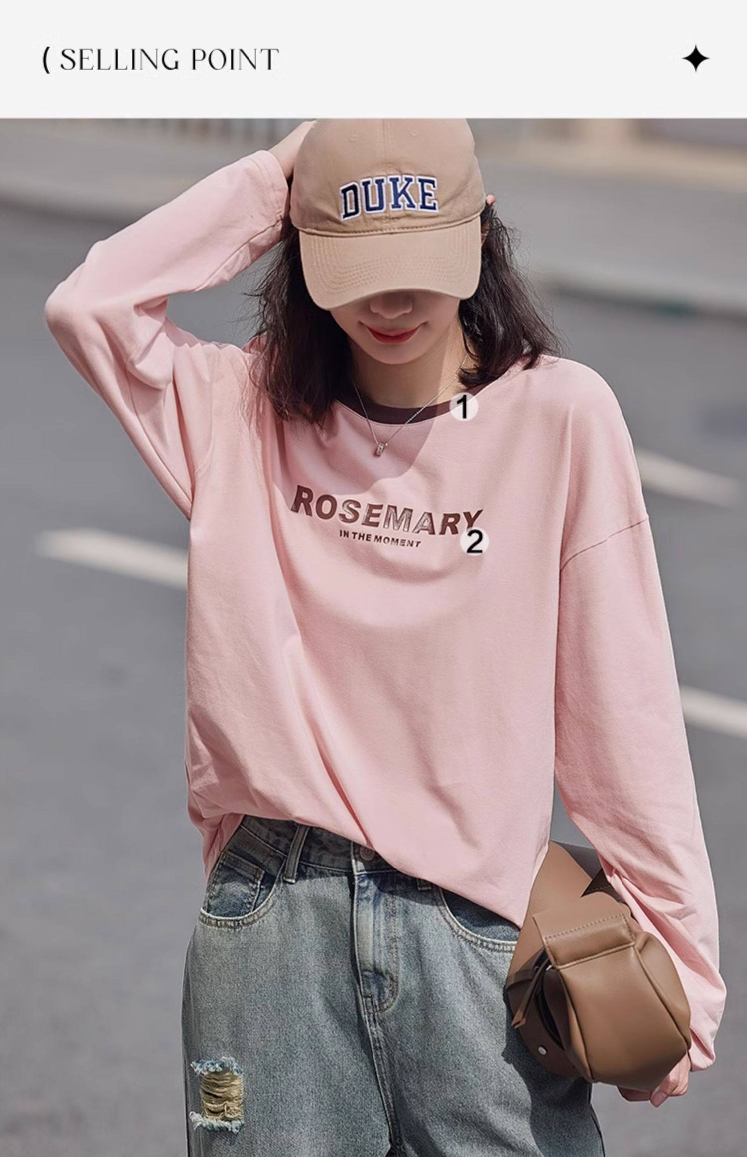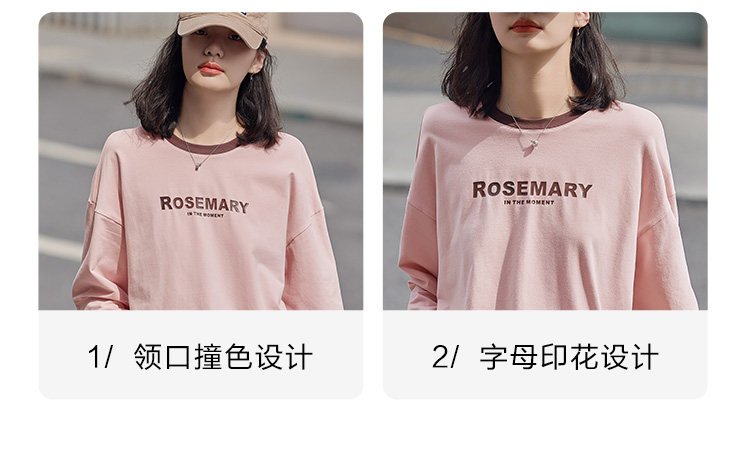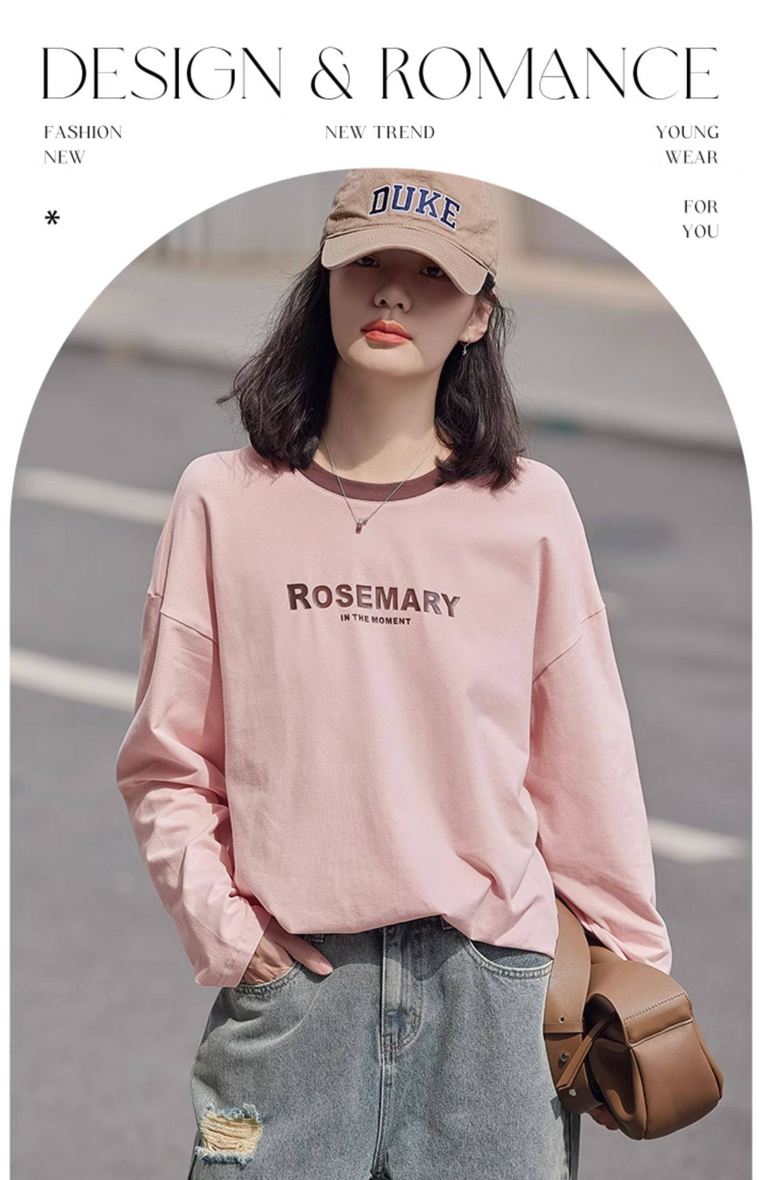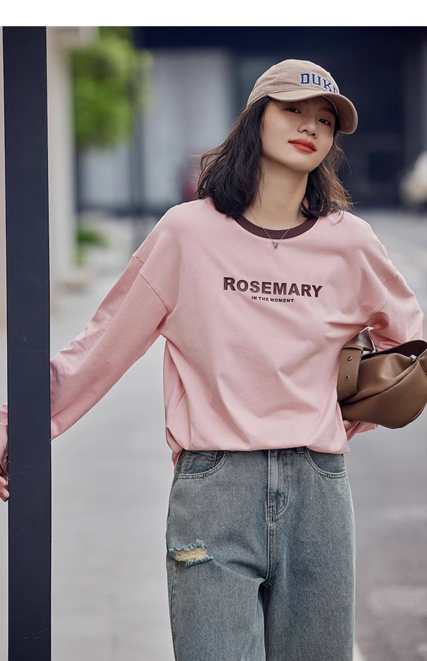德玛纳粉色圆领长袖T恤女秋季新款显瘦内搭宽松休闲打底上衣