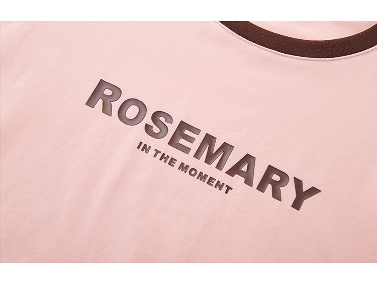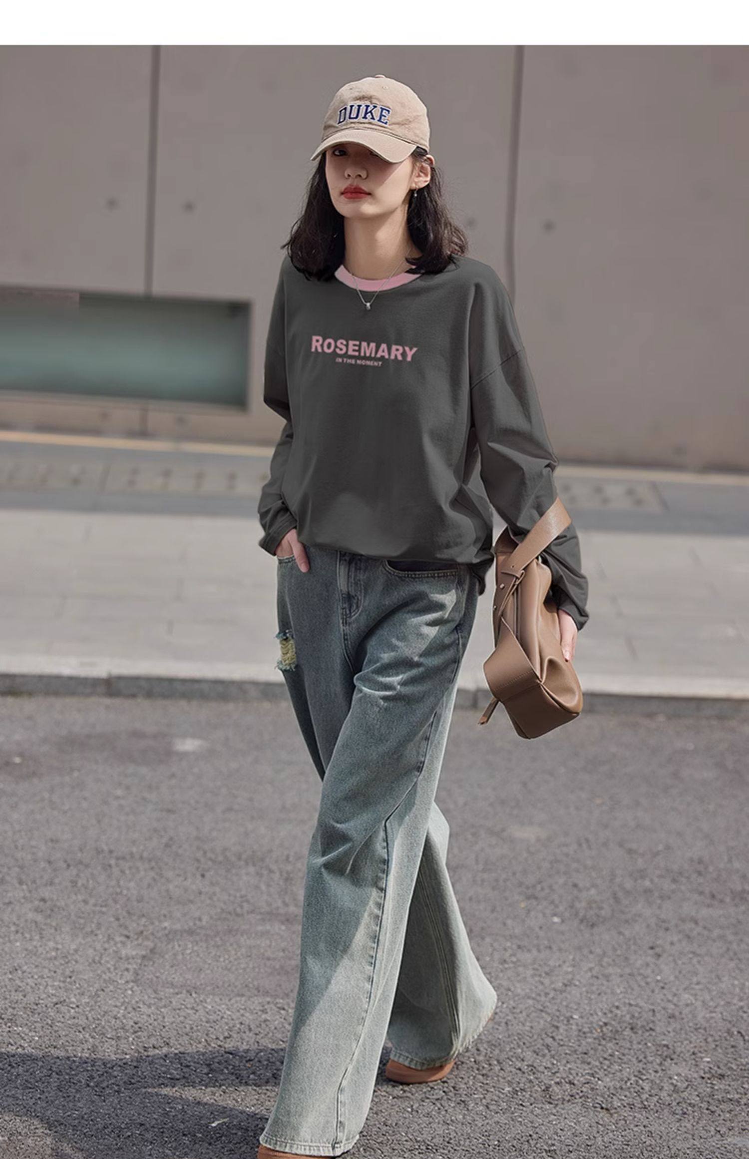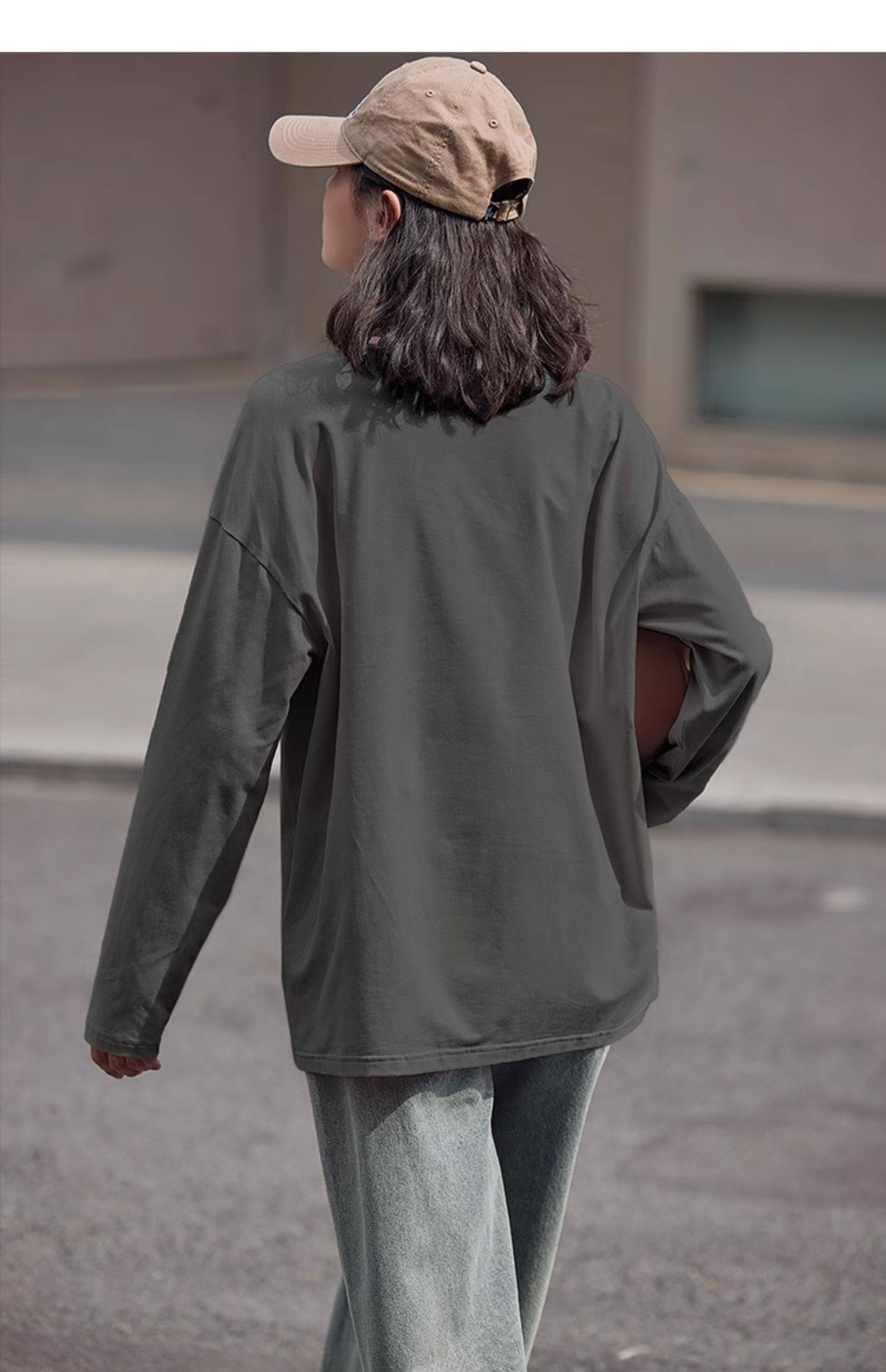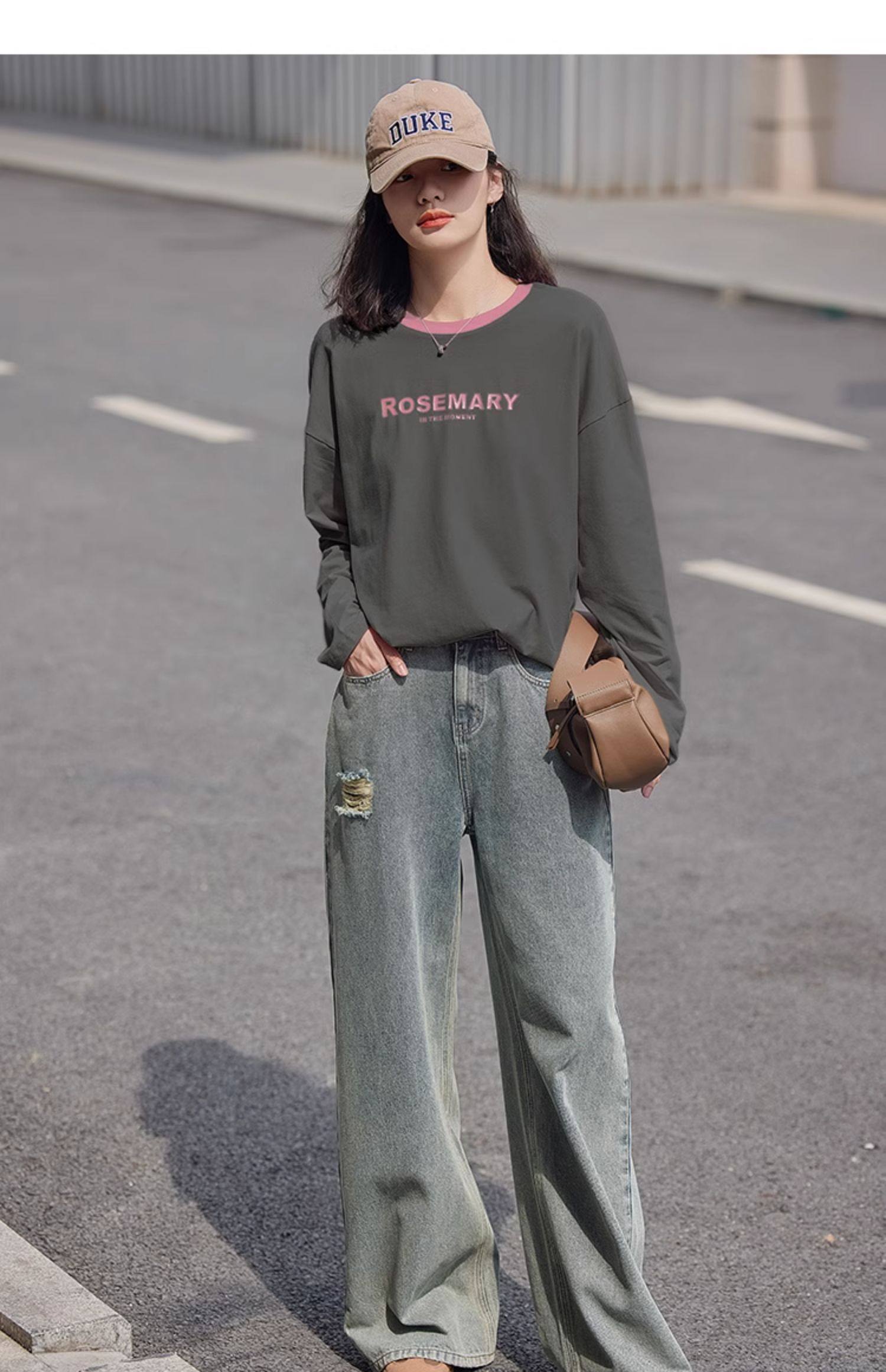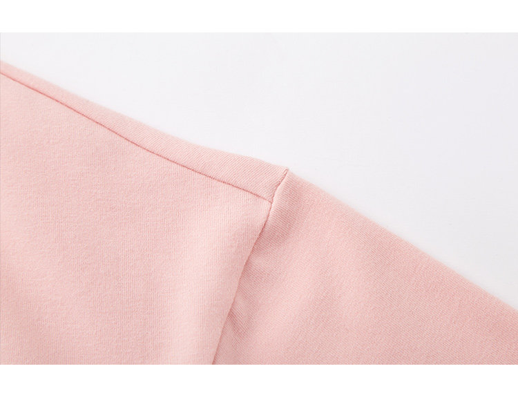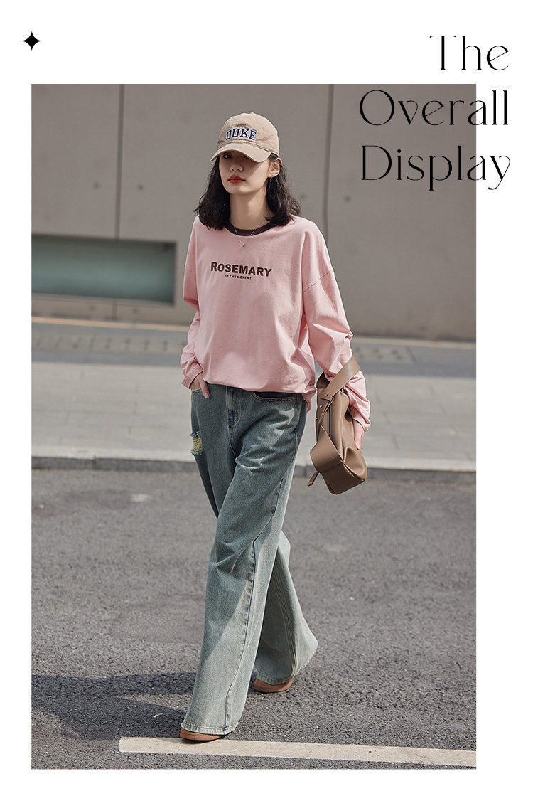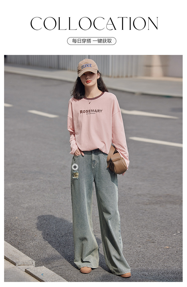 德玛纳粉色圆领长袖T恤女秋季新款显瘦内搭宽松休闲打底上衣