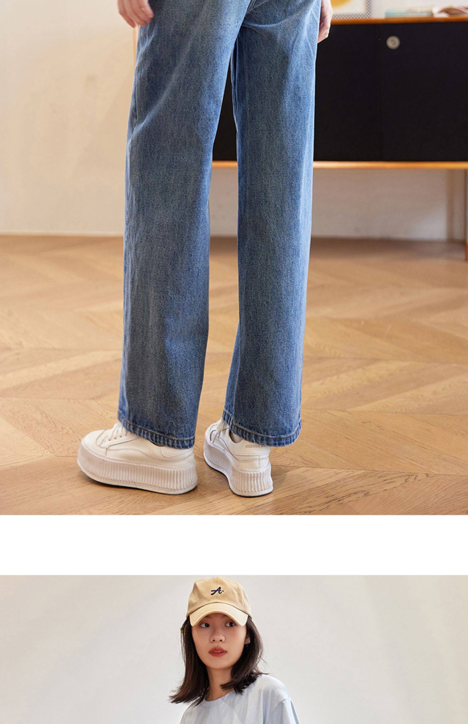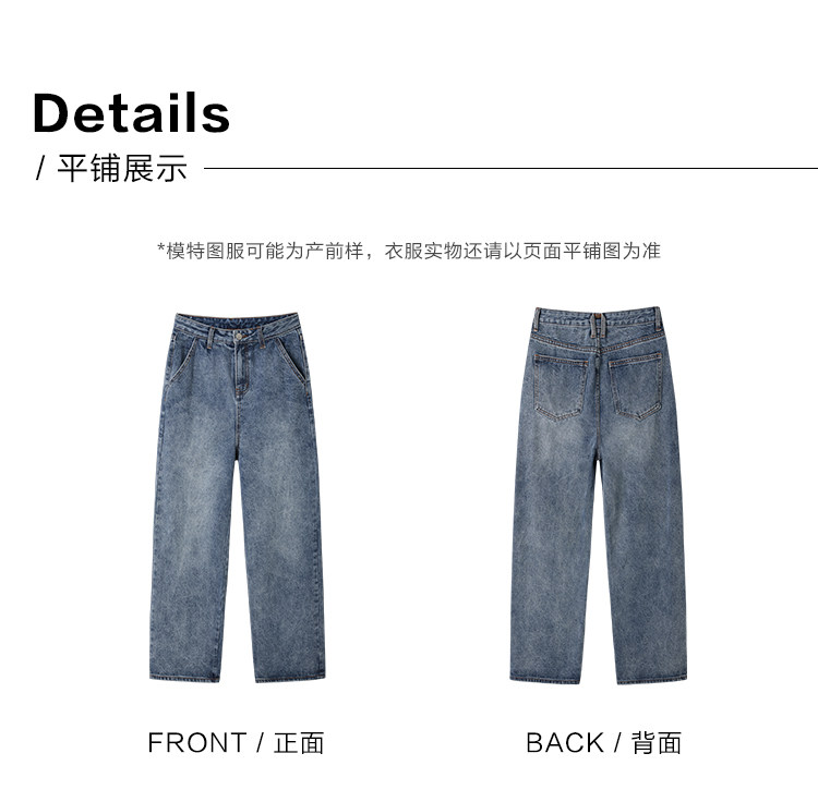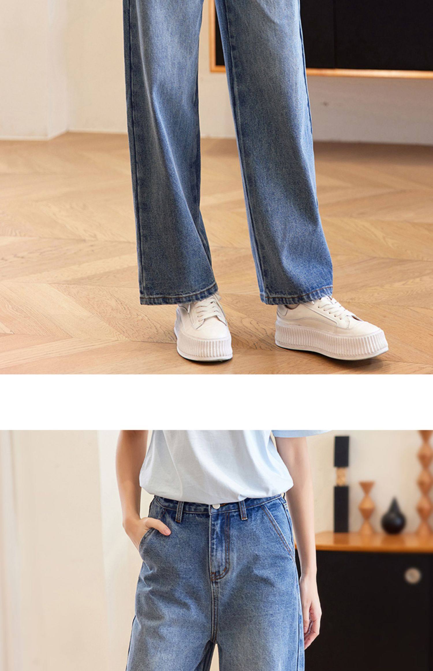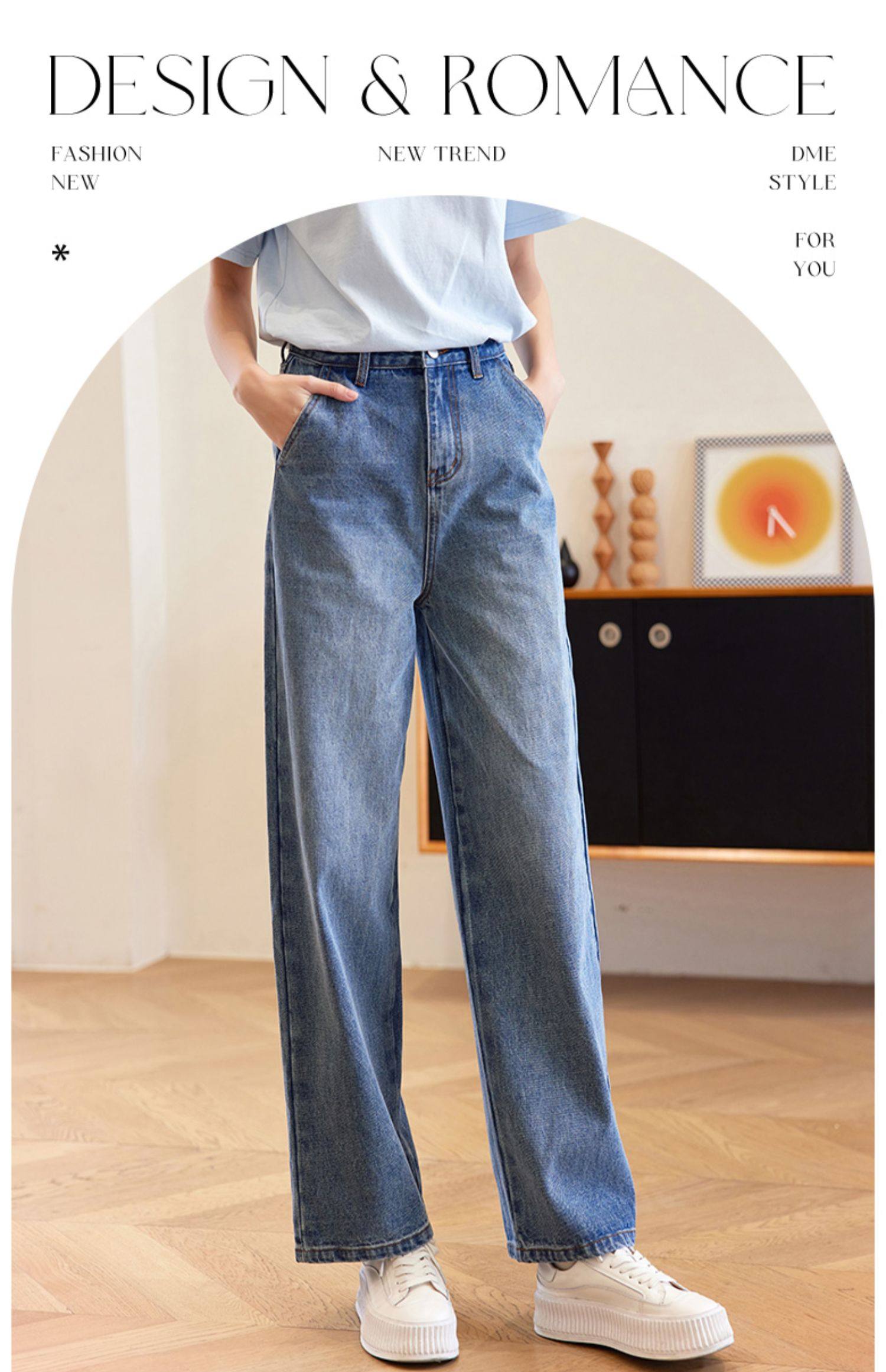 德玛纳蓝色牛仔裤女春季新款高腰垂感直筒阔腿裤宽松法棍裤子