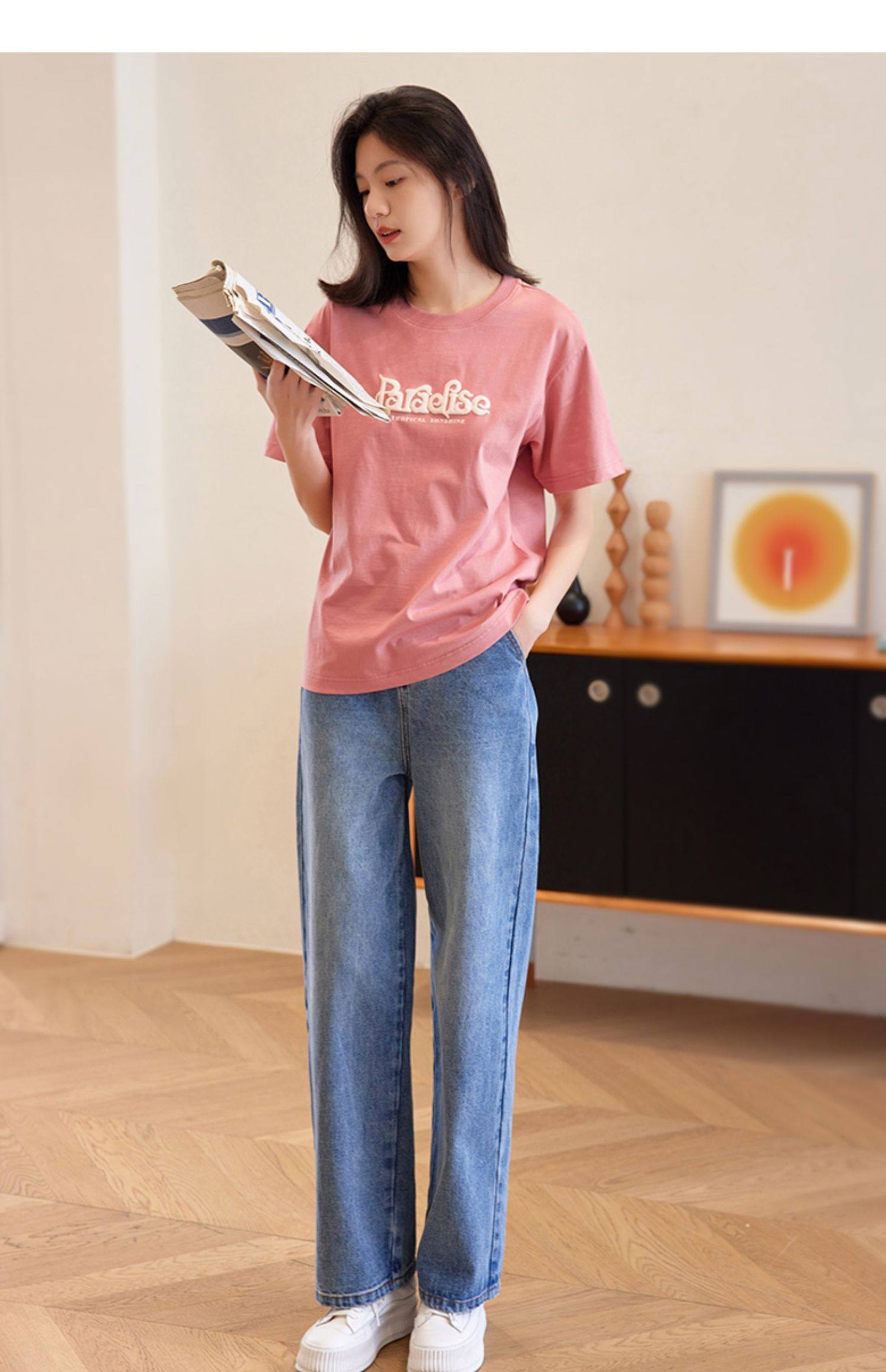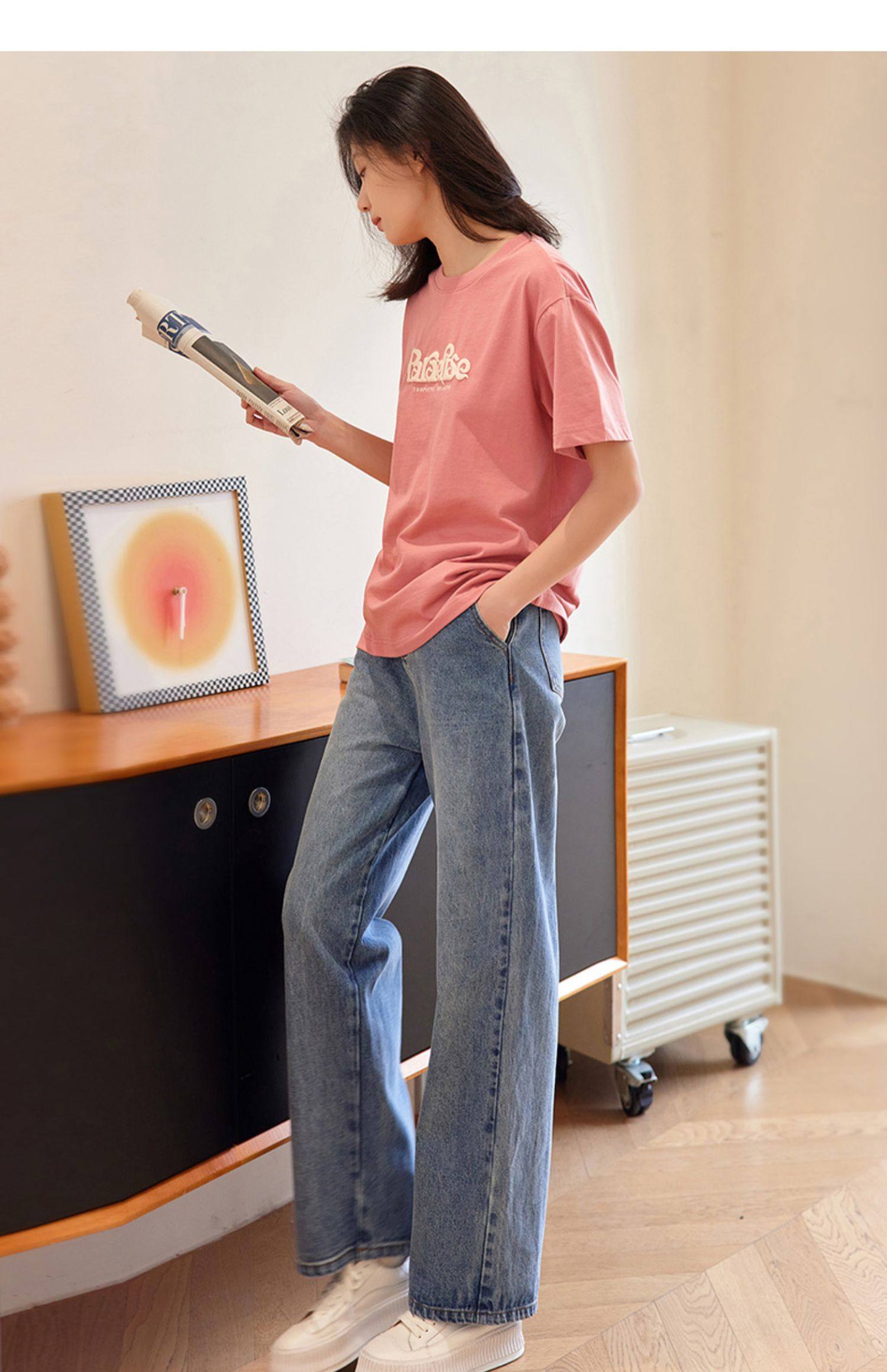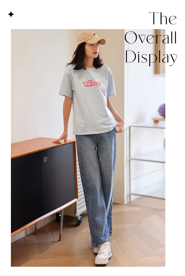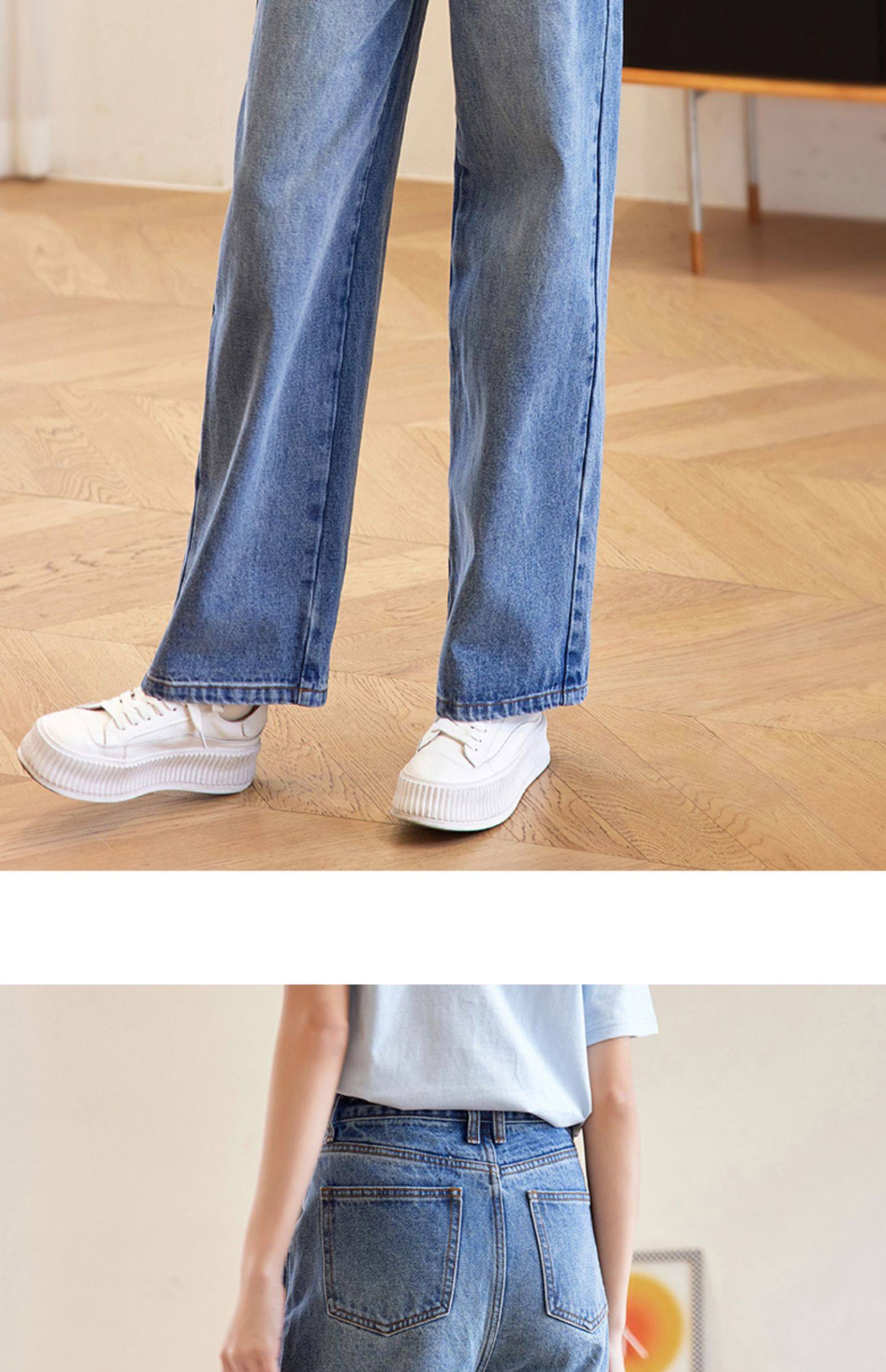 德玛纳蓝色牛仔裤女春季新款高腰垂感直筒阔腿裤宽松法棍裤子