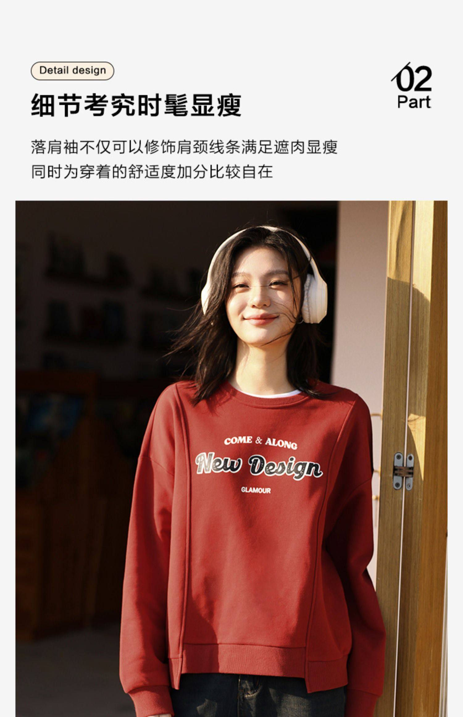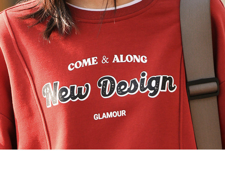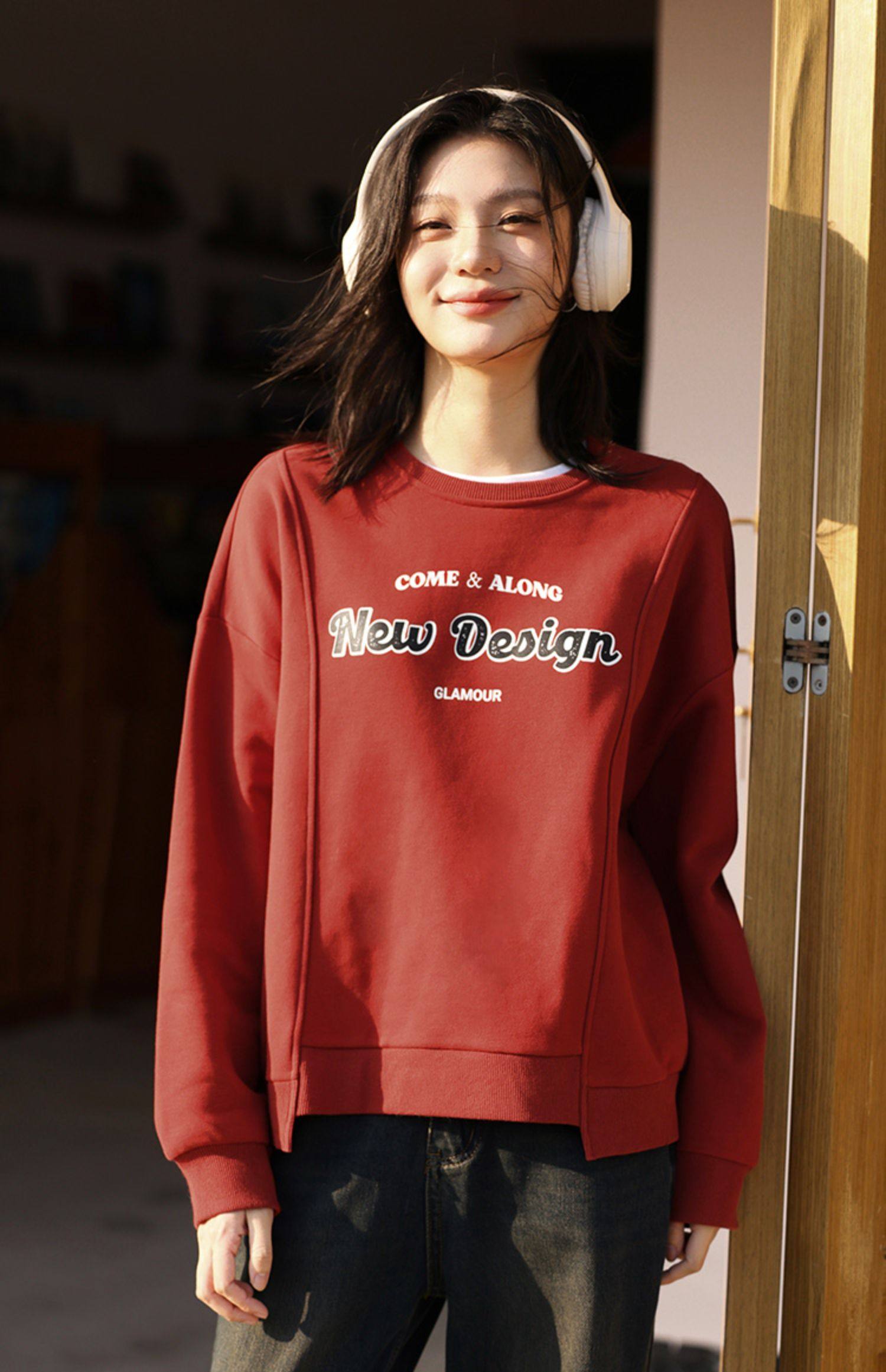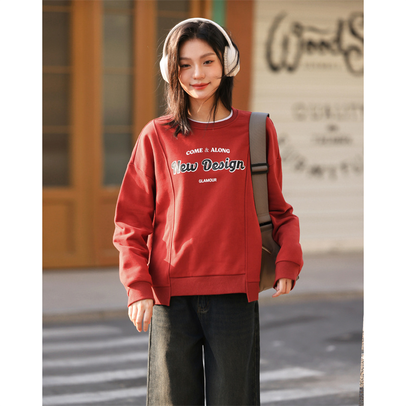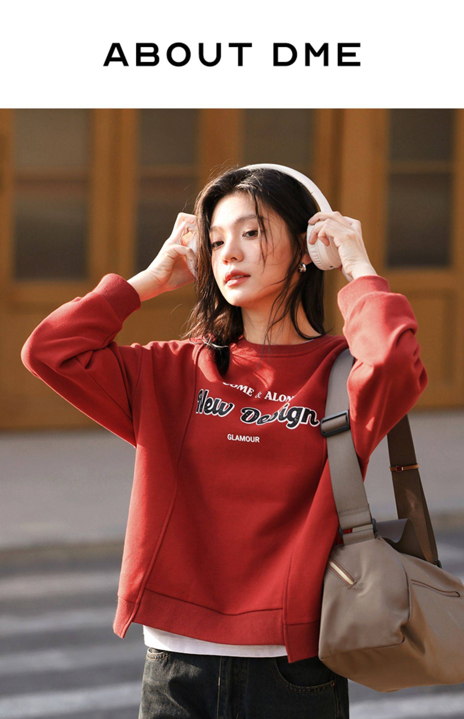 德玛纳红色字母休闲卫衣女冬季新款时尚内搭长袖宽松打底上衣