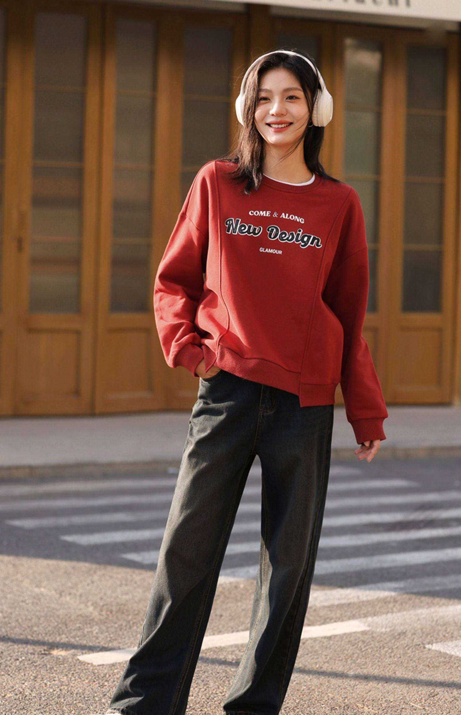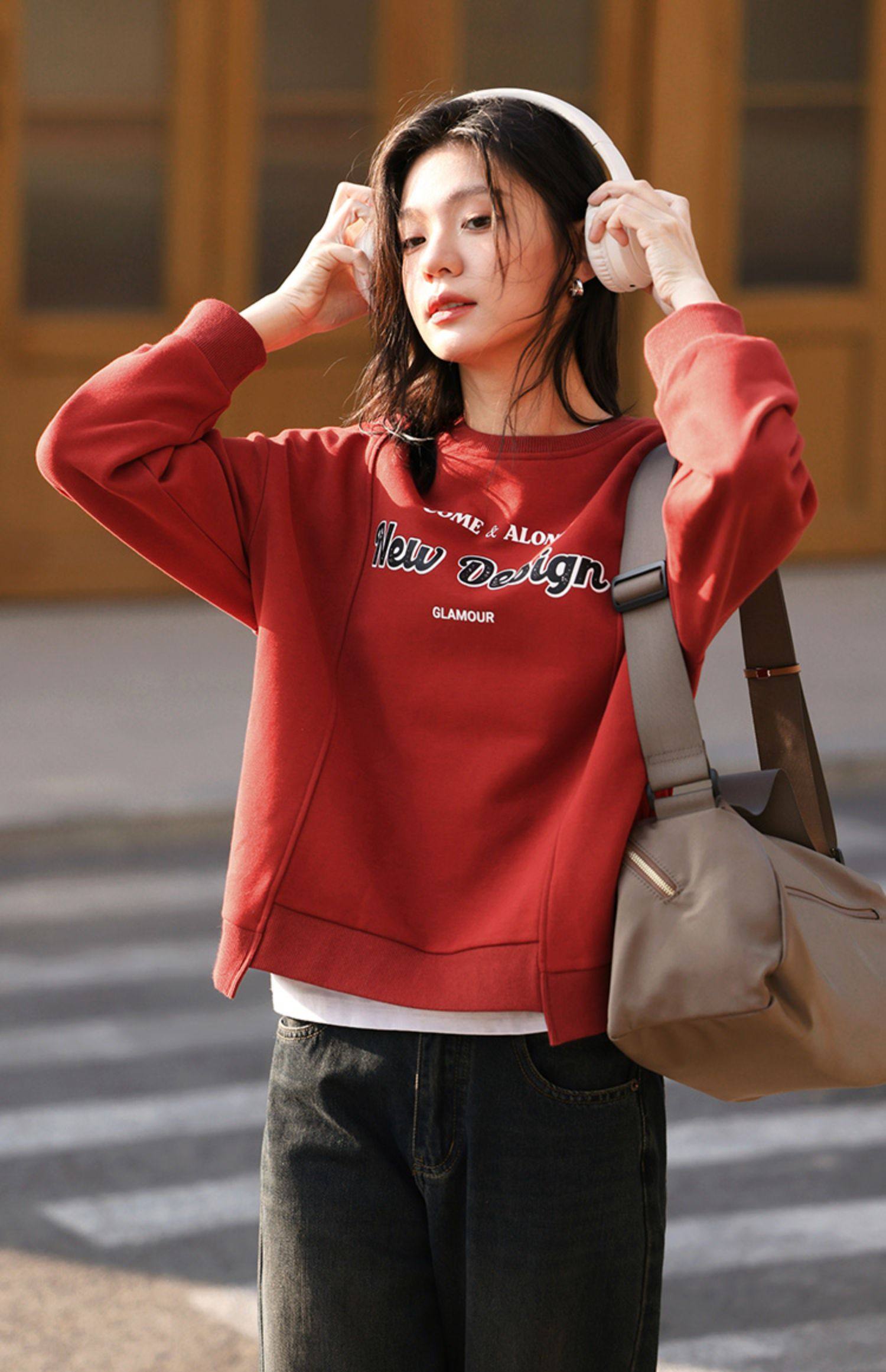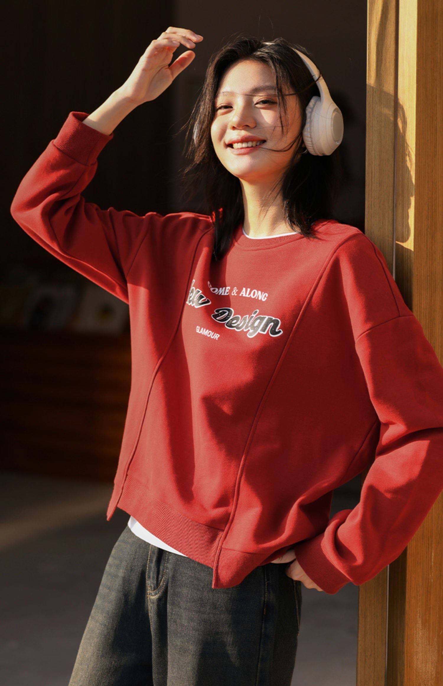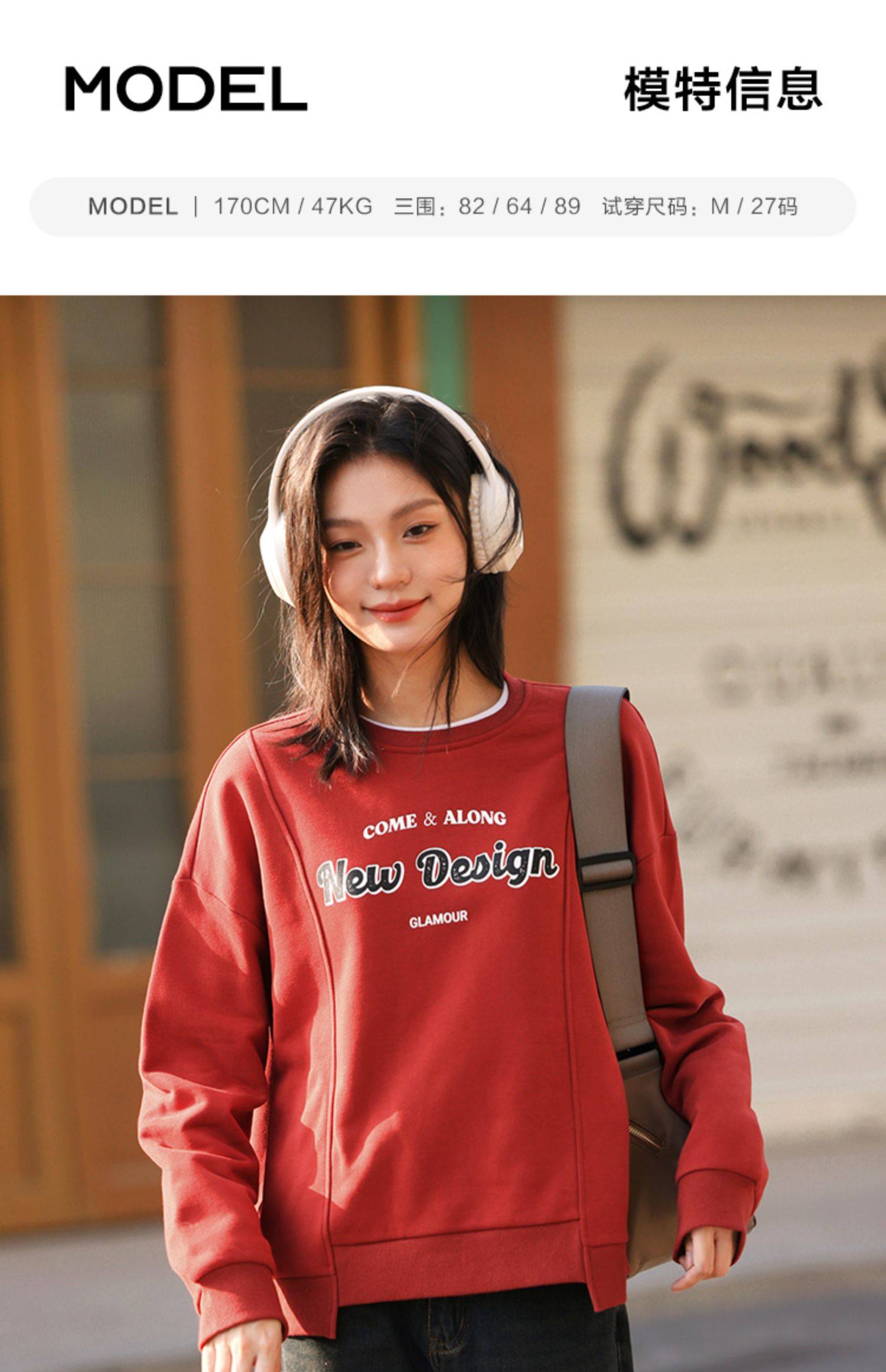 德玛纳红色字母休闲卫衣女冬季新款时尚内搭长袖宽松打底上衣