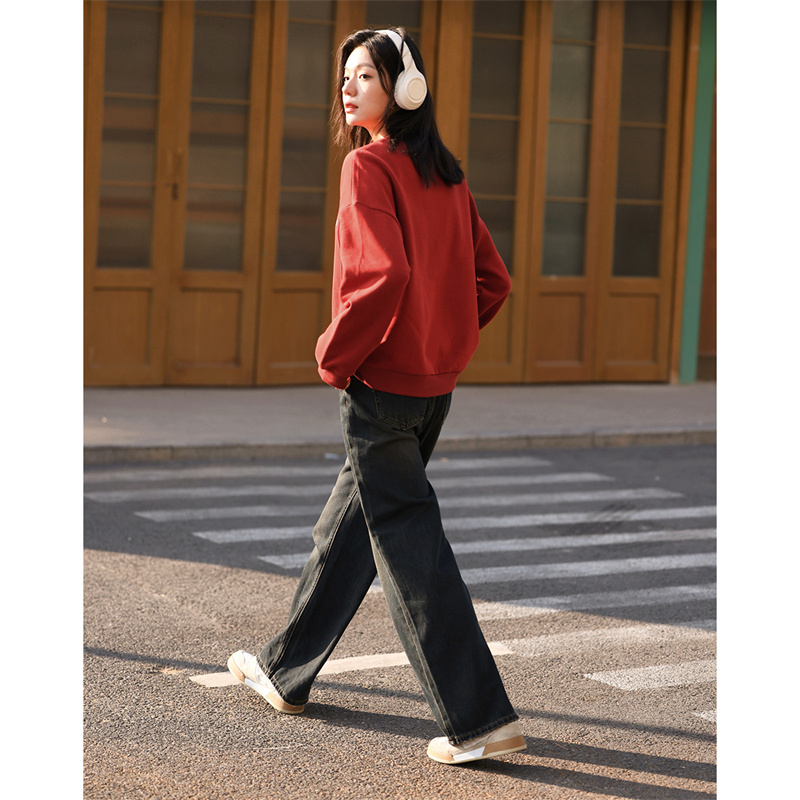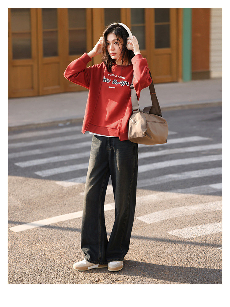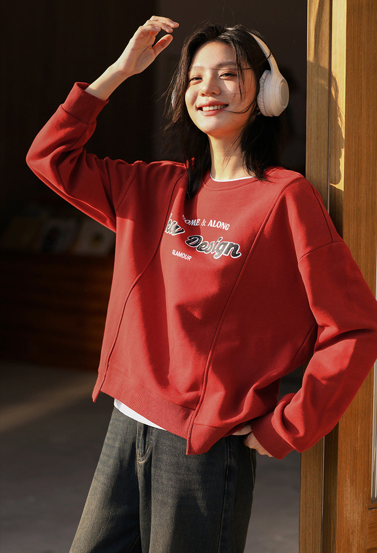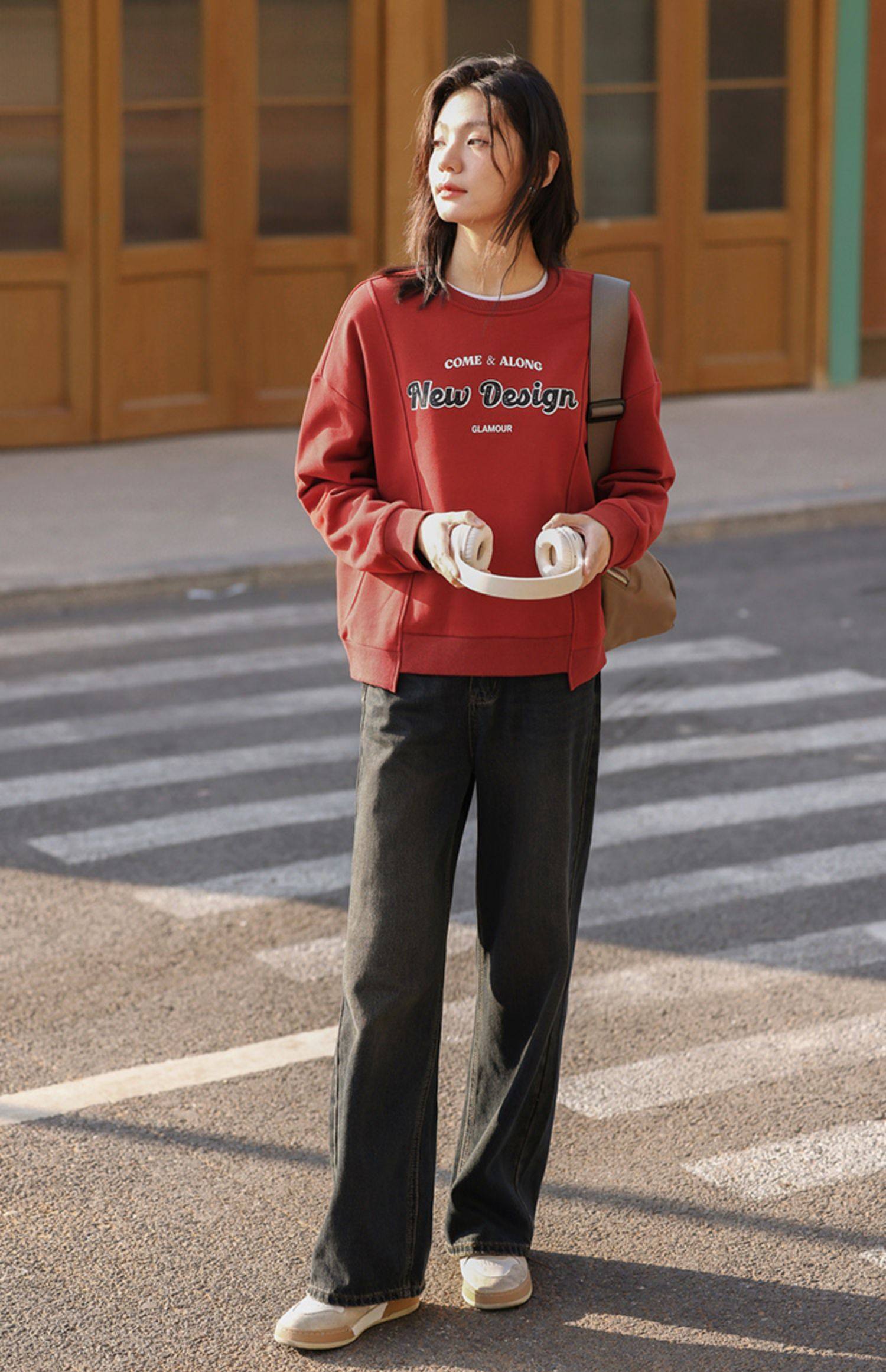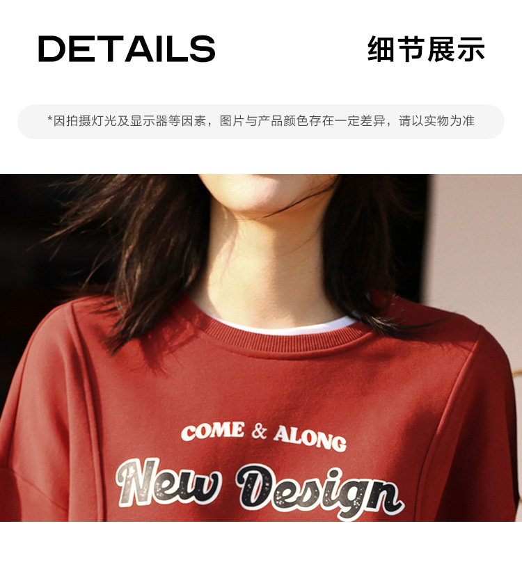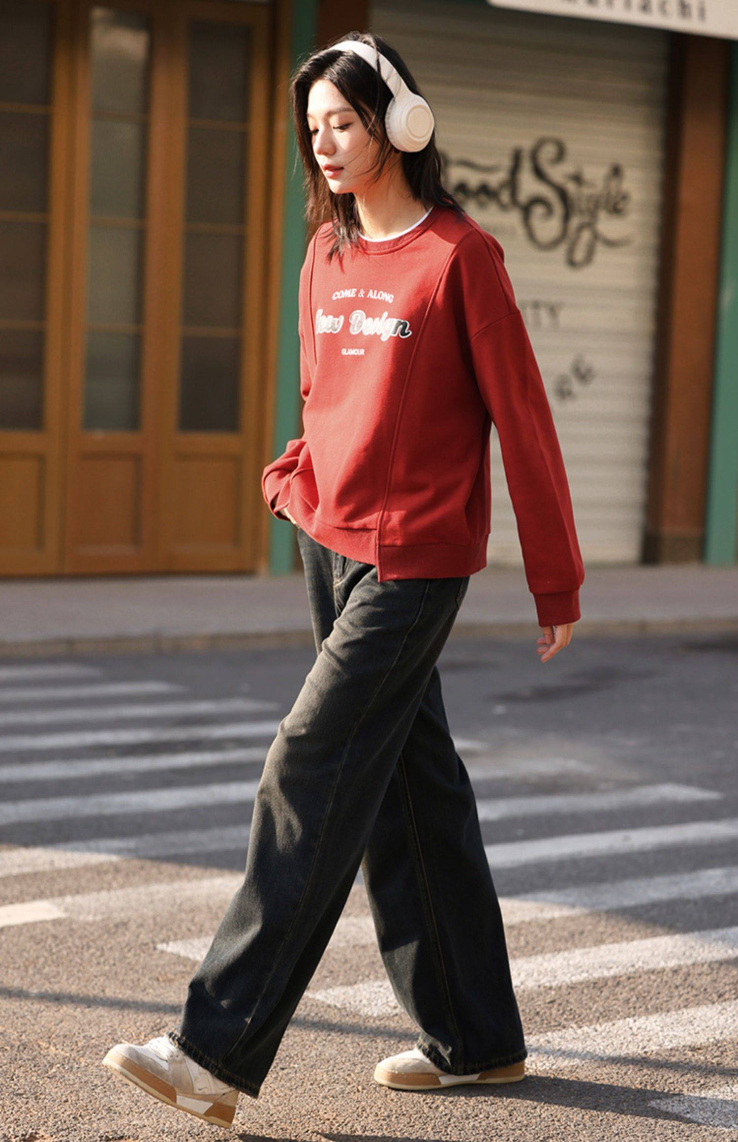 德玛纳红色字母休闲卫衣女冬季新款时尚内搭长袖宽松打底上衣