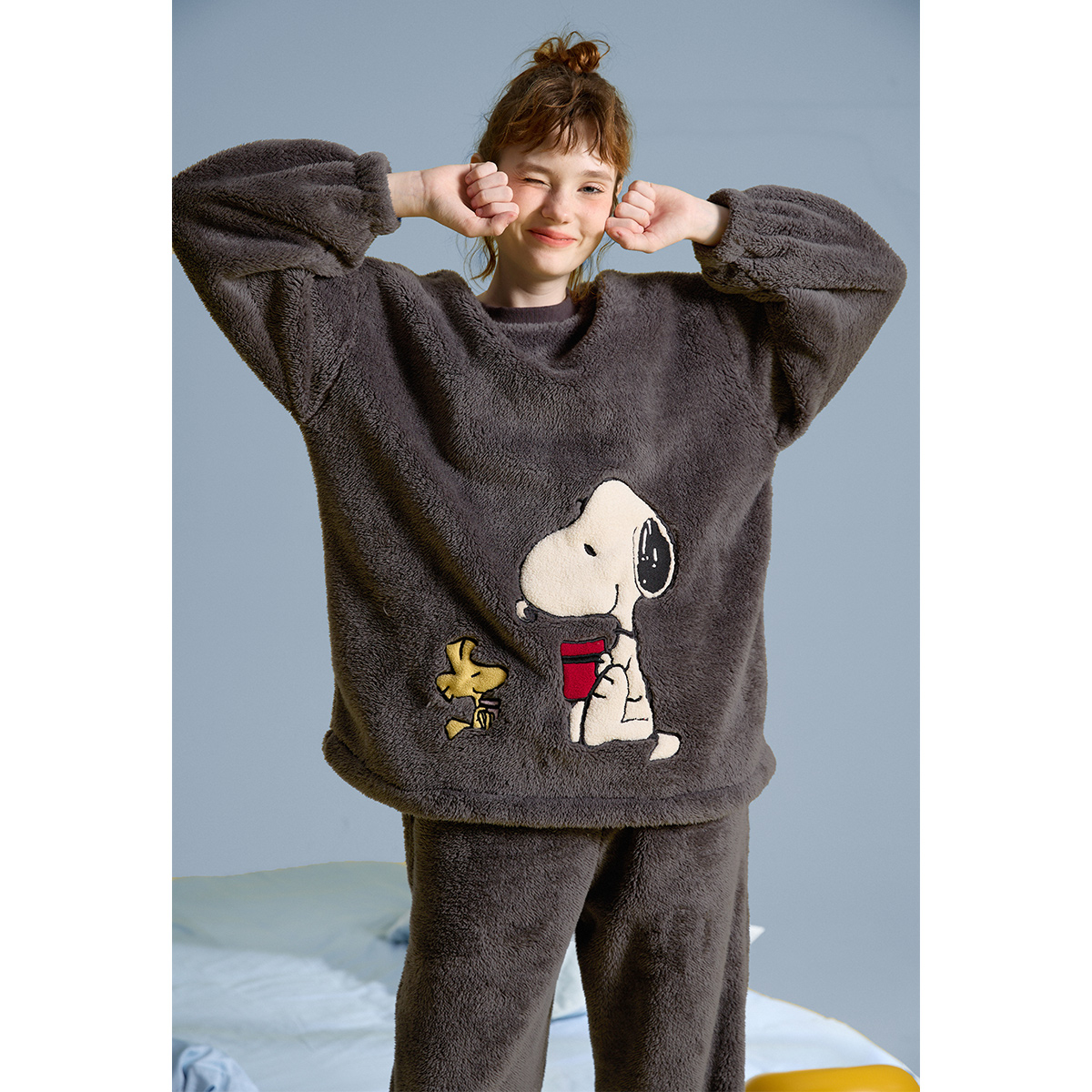 yso史努比冬季睡衣女圆领卡通珊瑚绒套装可外穿家居服D