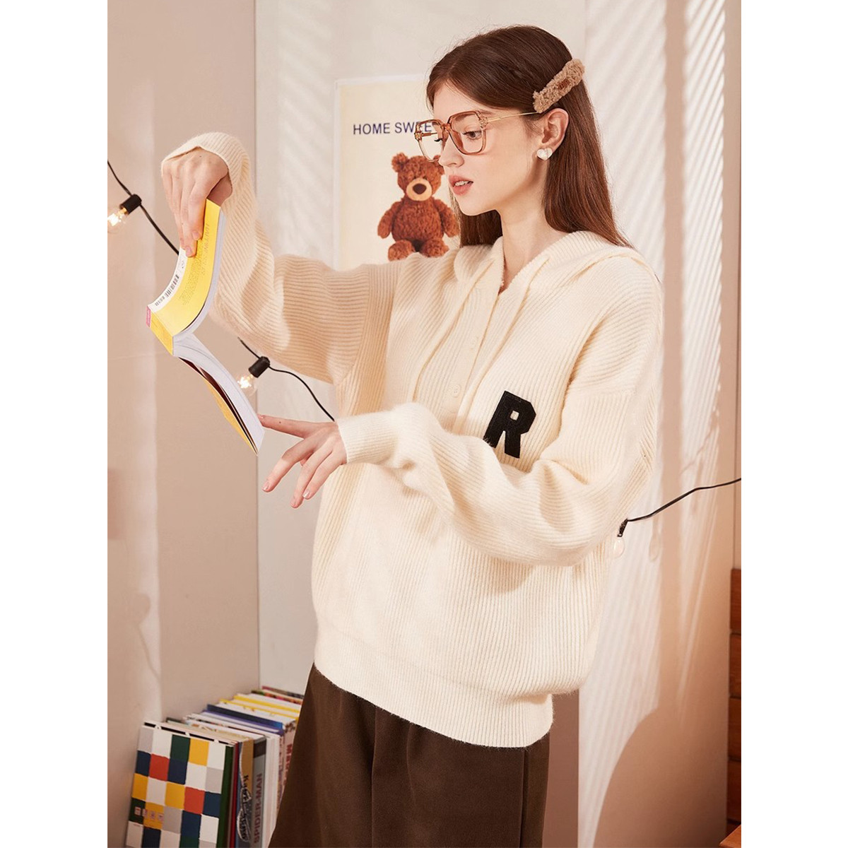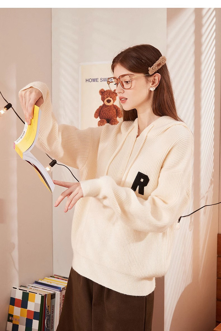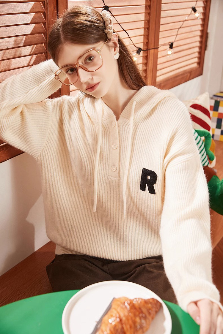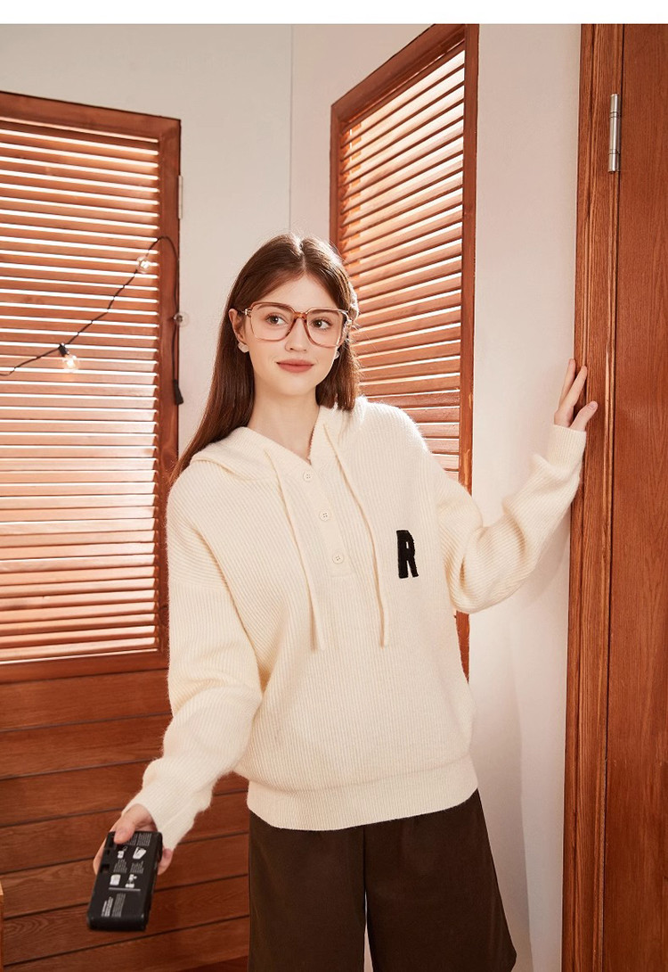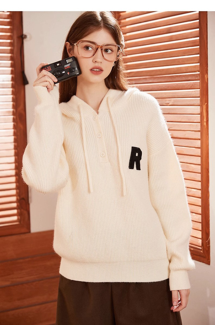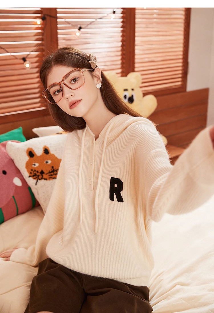 2023秋冬新款女连帽字母标帽绳毛衣百搭设计感潮流时髦韩系