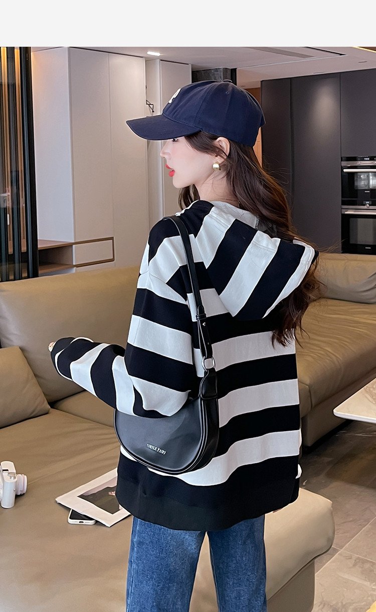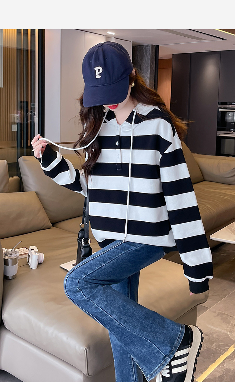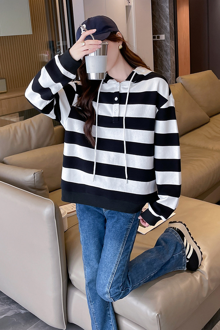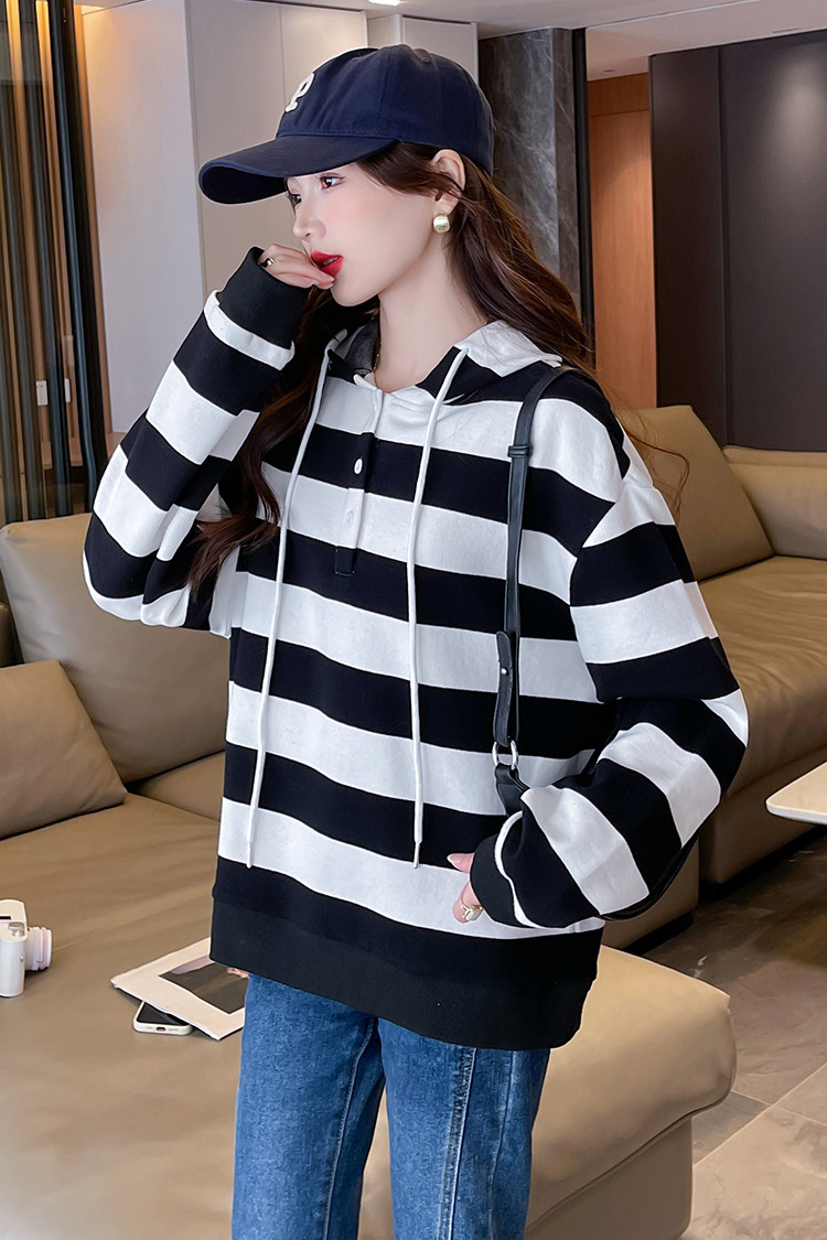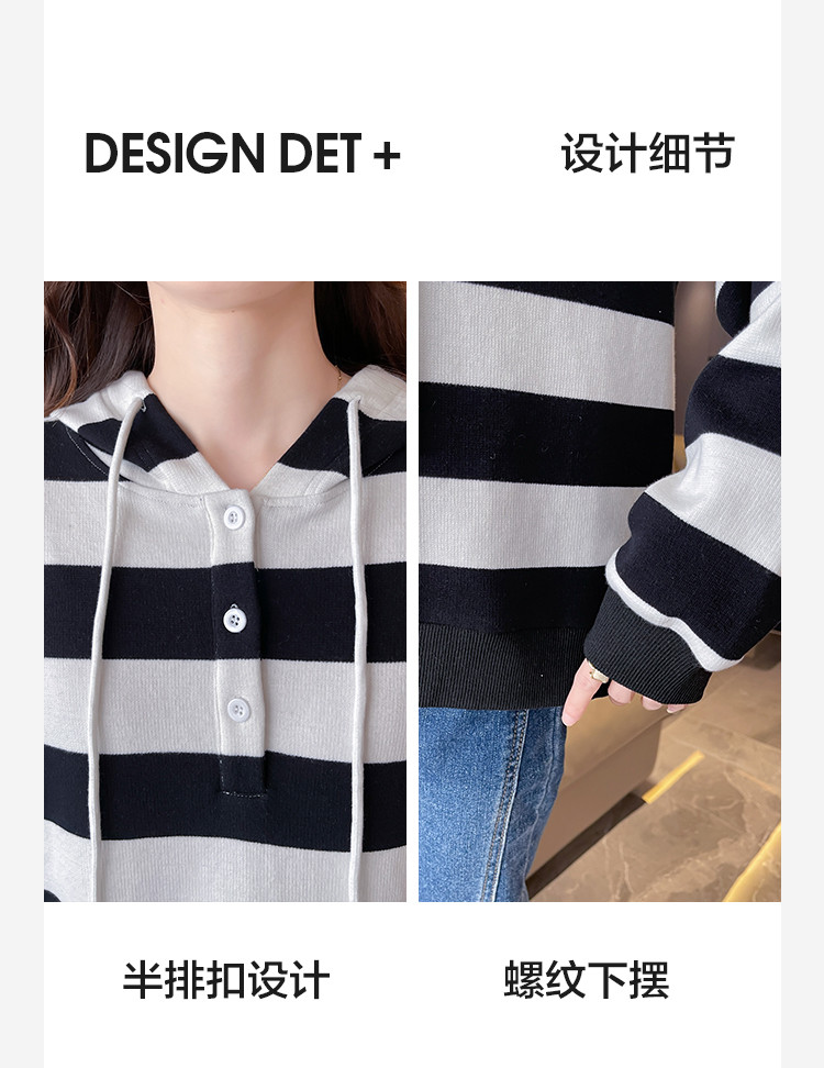 2023秋冬新款女连帽条纹卫衣百搭减龄学院风时尚韩版慵懒风潮