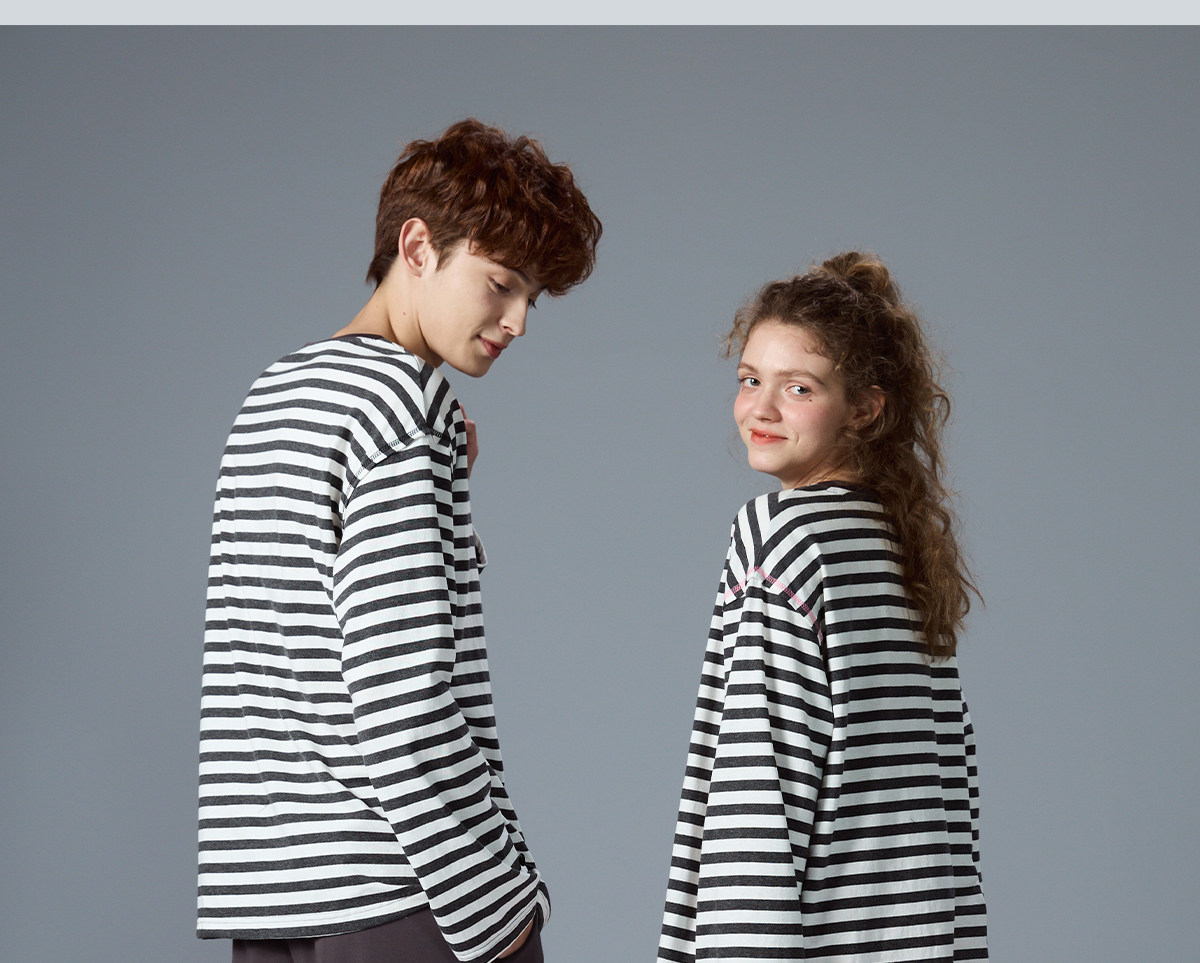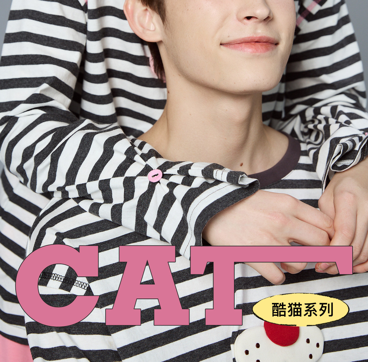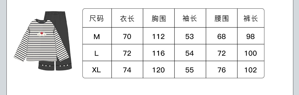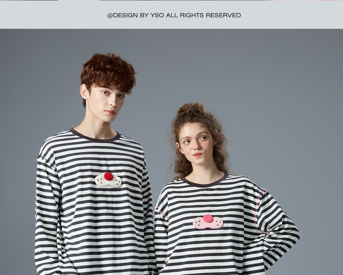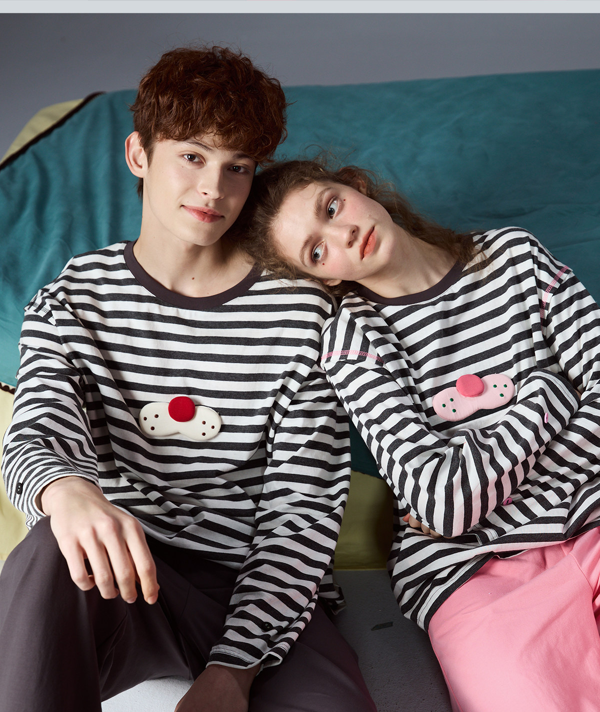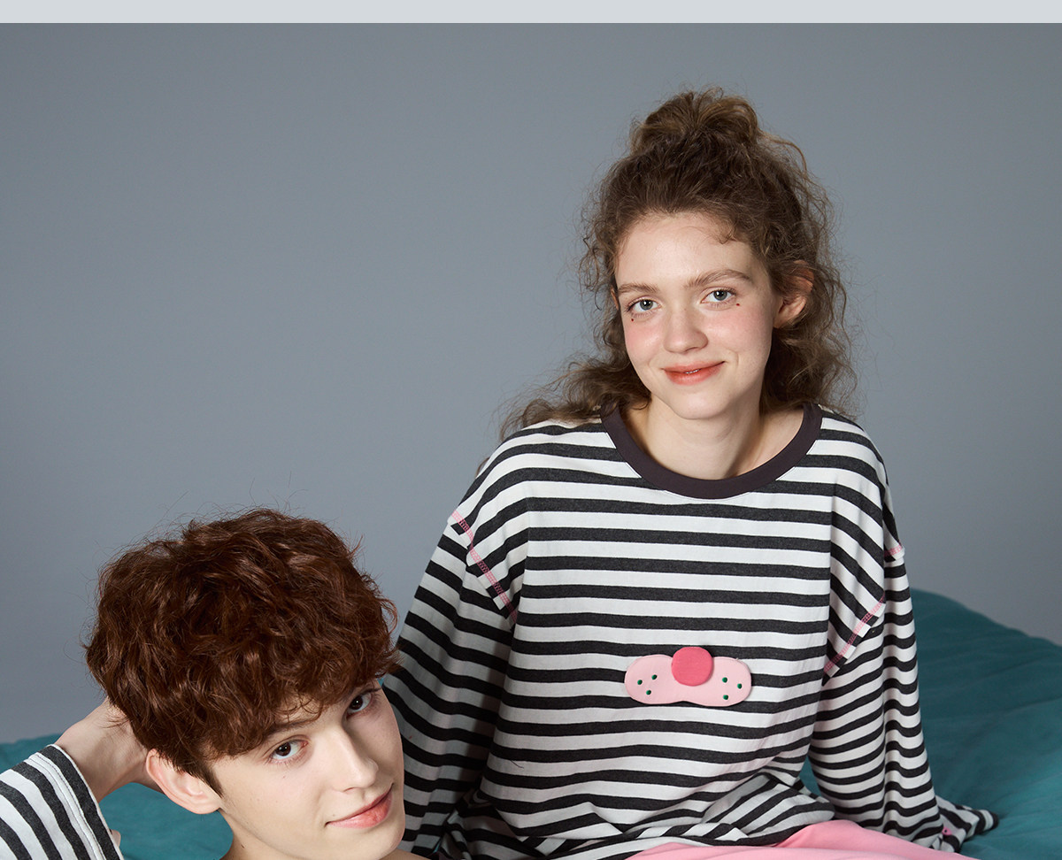 yso【酷猫系列】春秋情侣女圆领条纹套装男可外穿家居服A