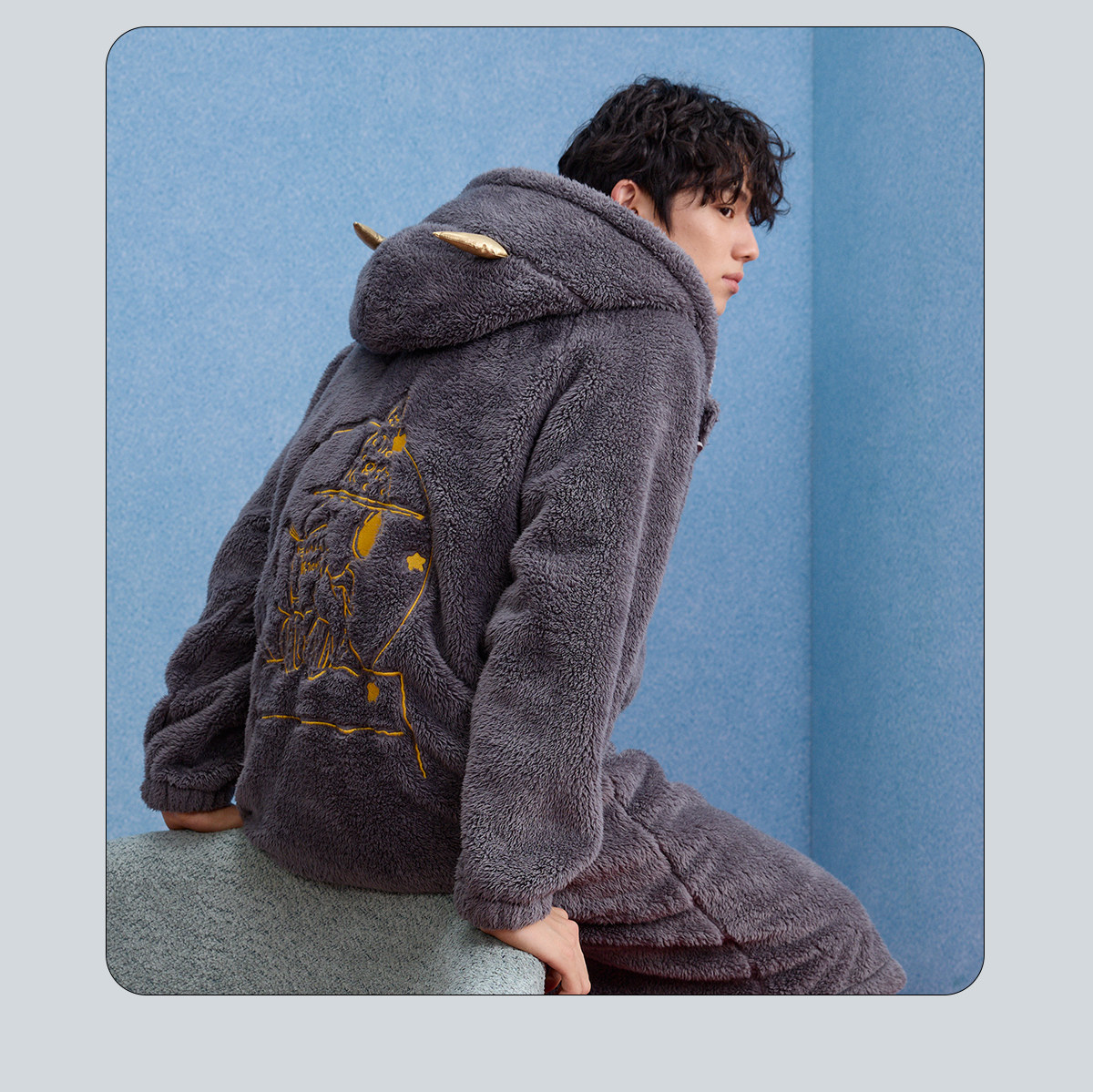 Gukoo果壳情侣睡衣条纹保暖牛奶绒女睡衣迪士尼冬款男家居服套装D
