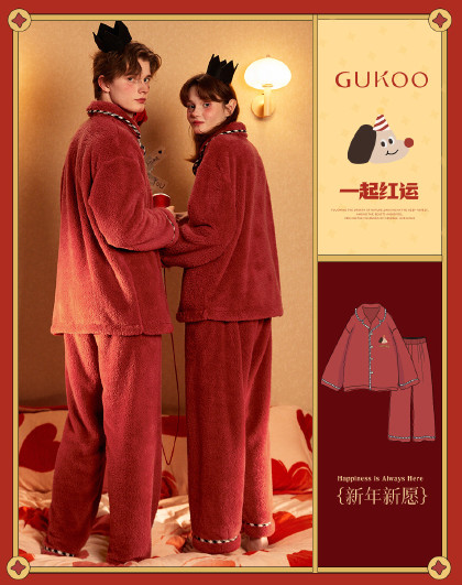 Gukoo果壳睡衣情侣派对小狗秋冬新款薄绒睡衣女保暖男家居服套装D