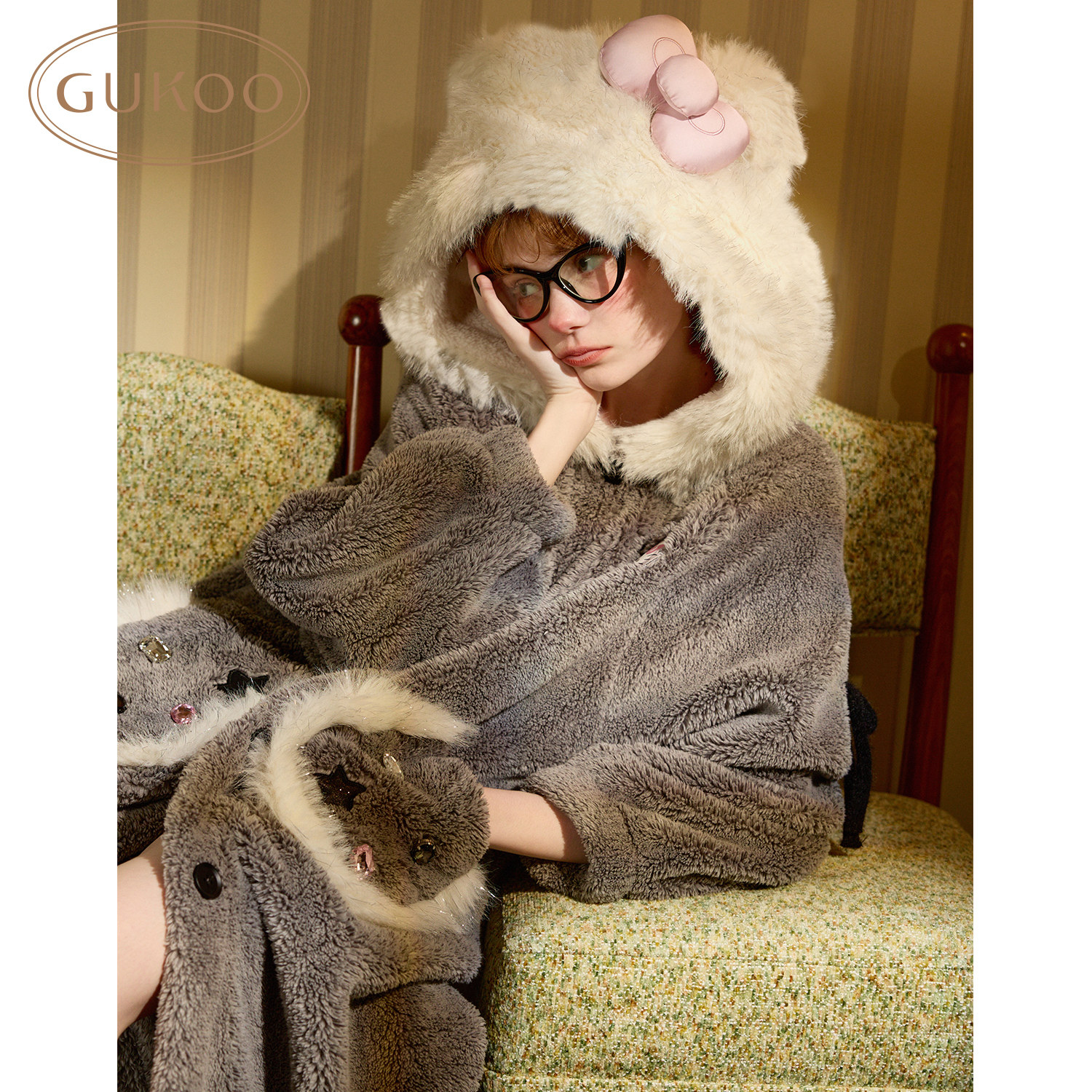 Gukoo/果壳睡袍冬季HelloKitty联名新款毛绒保暖女士家居服睡袍D