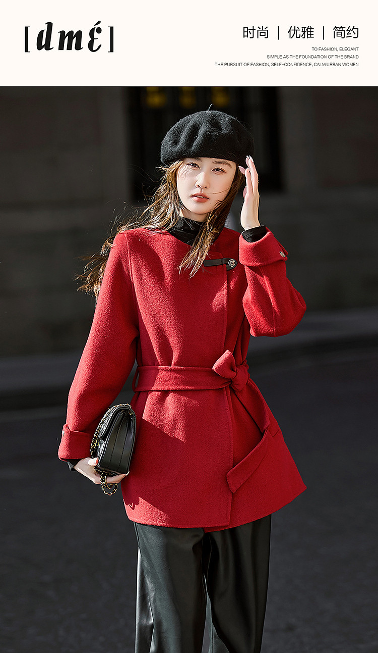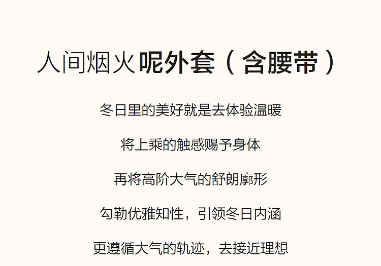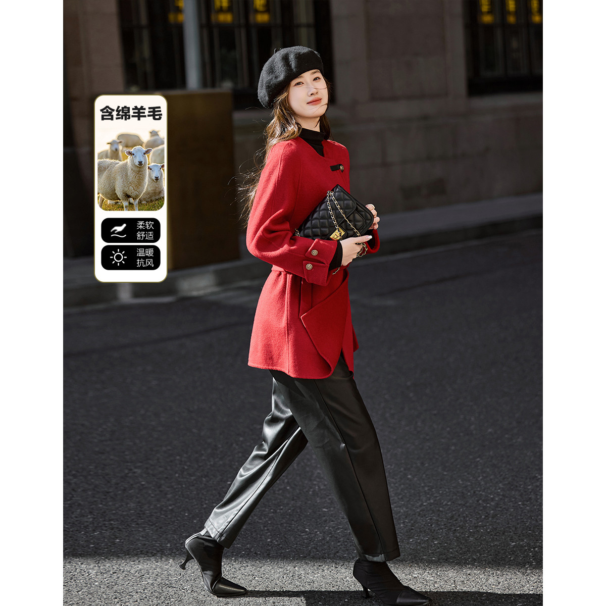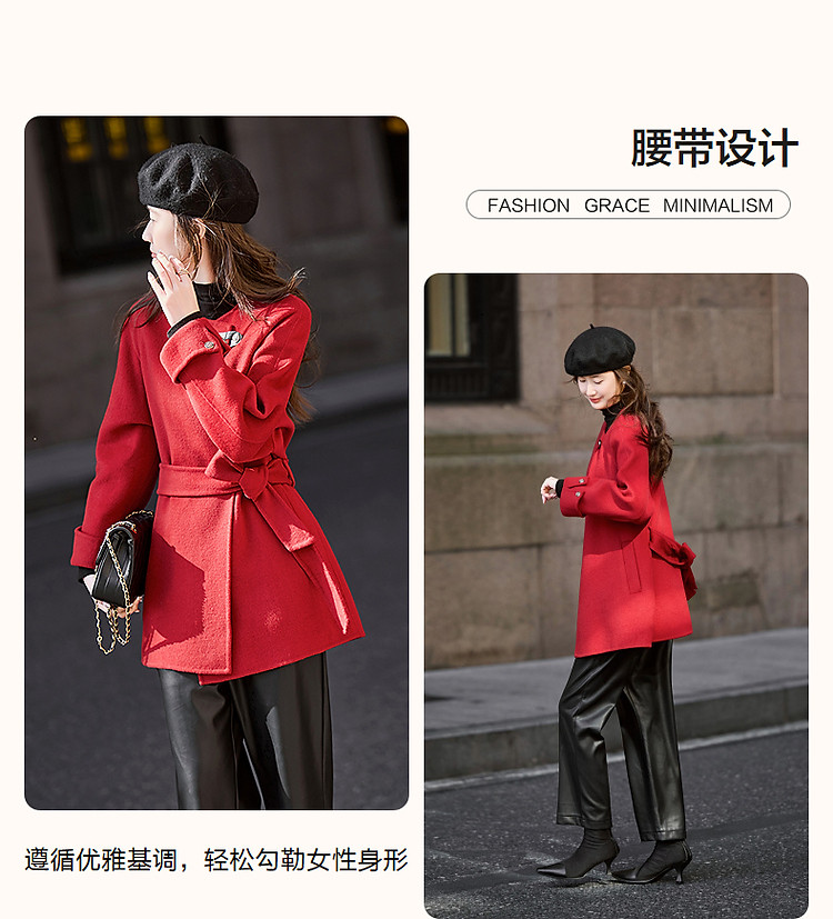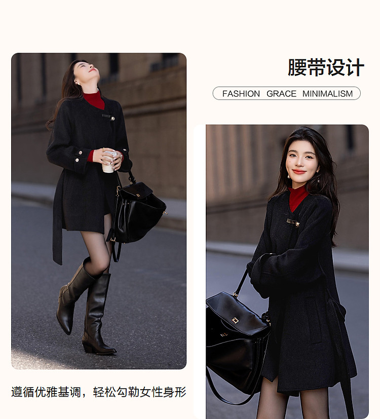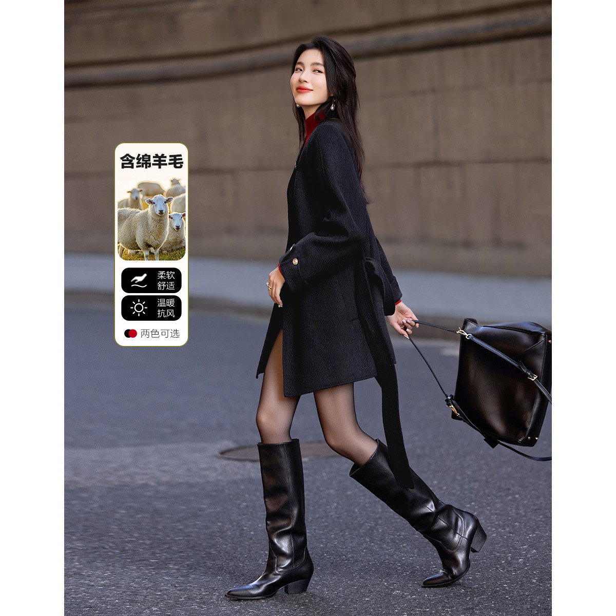 【人间烟火】冬季静奢风绵羊毛顺毛呢皮袢纽扣腰带藏肉大衣女外套