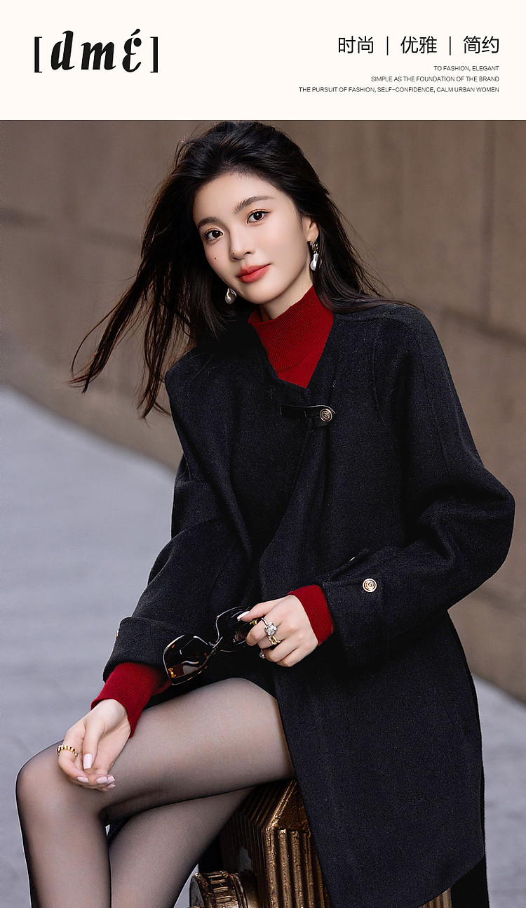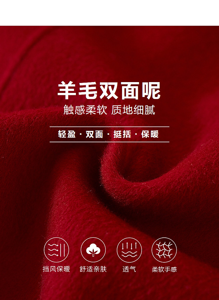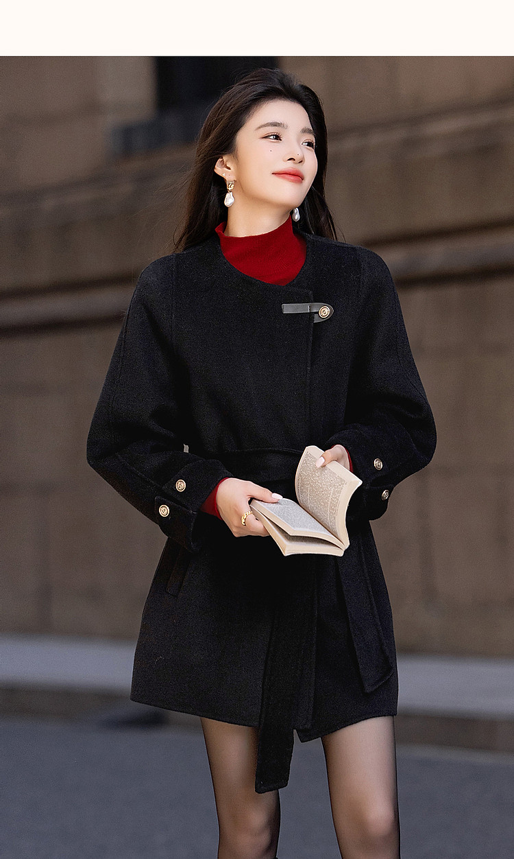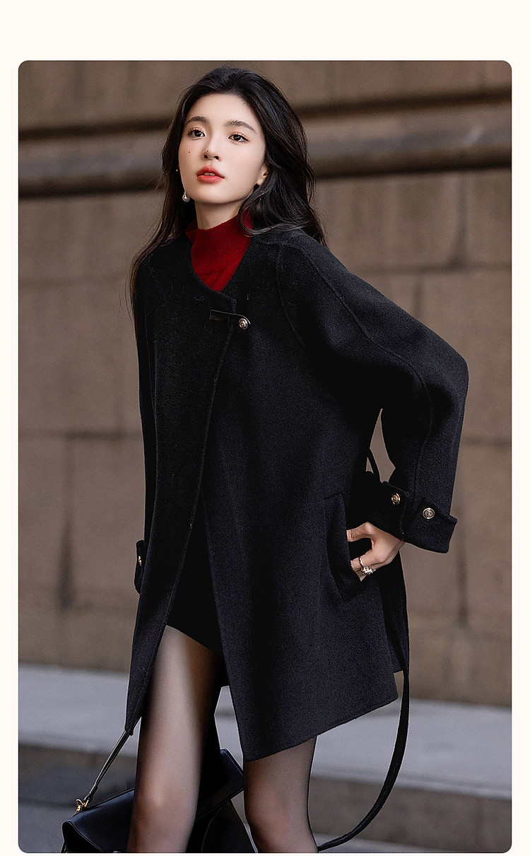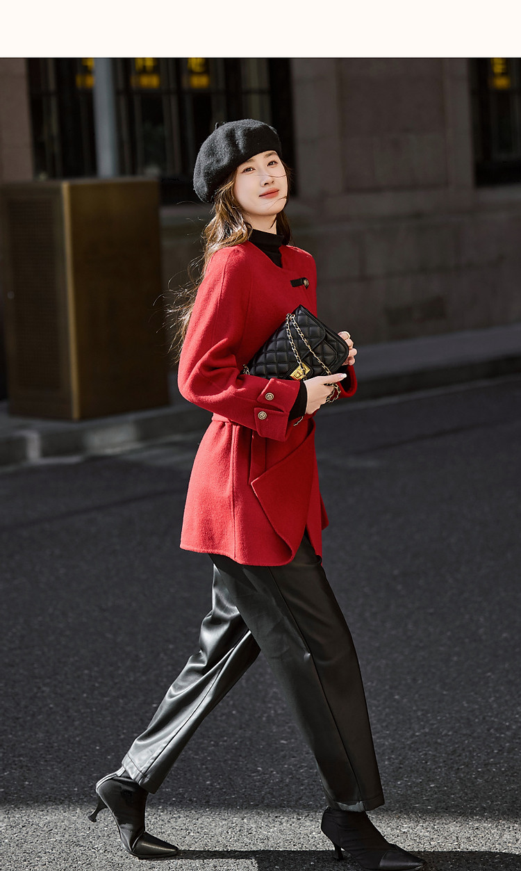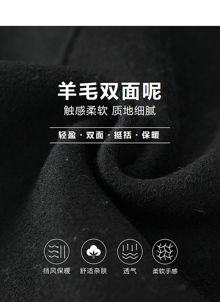 【人间烟火】冬季静奢风绵羊毛顺毛呢皮袢纽扣腰带藏肉大衣女外套