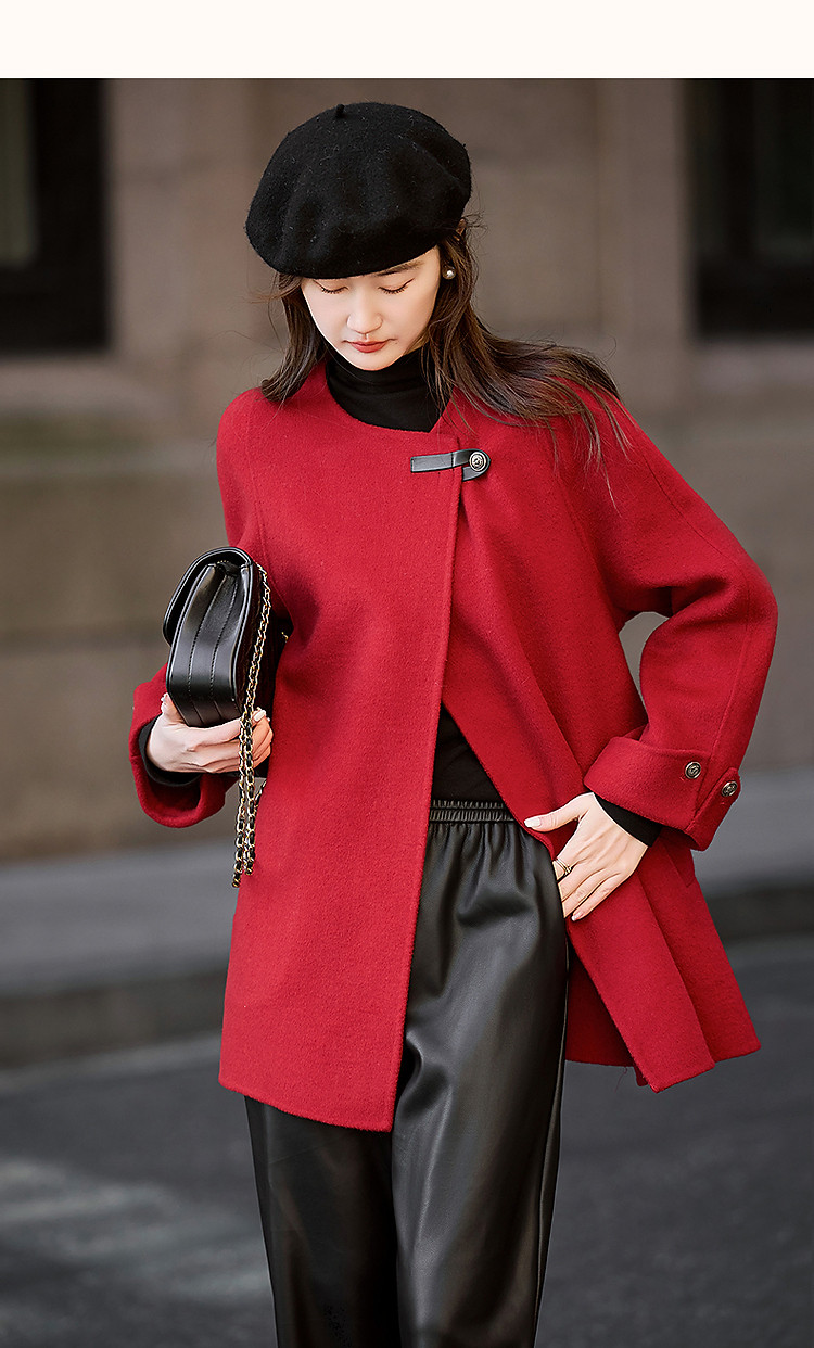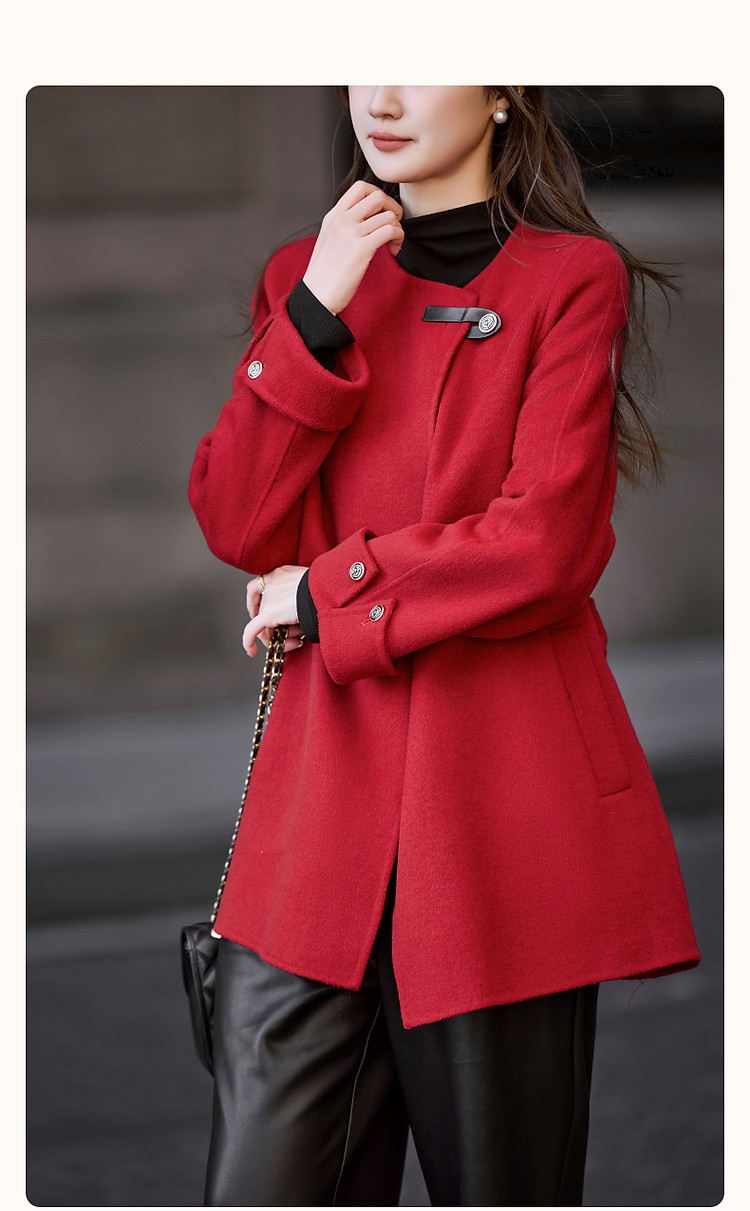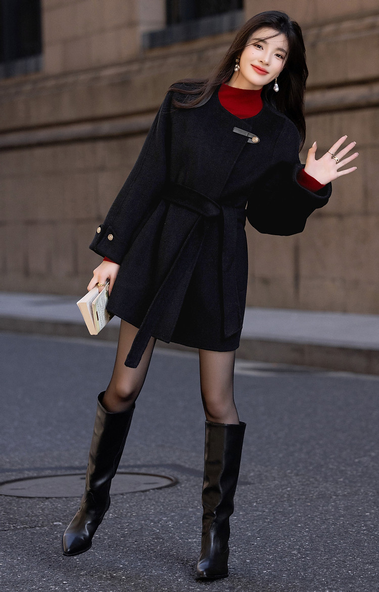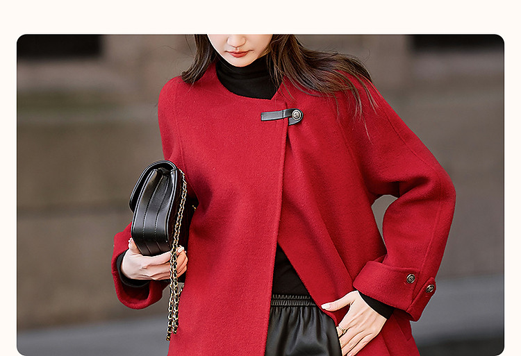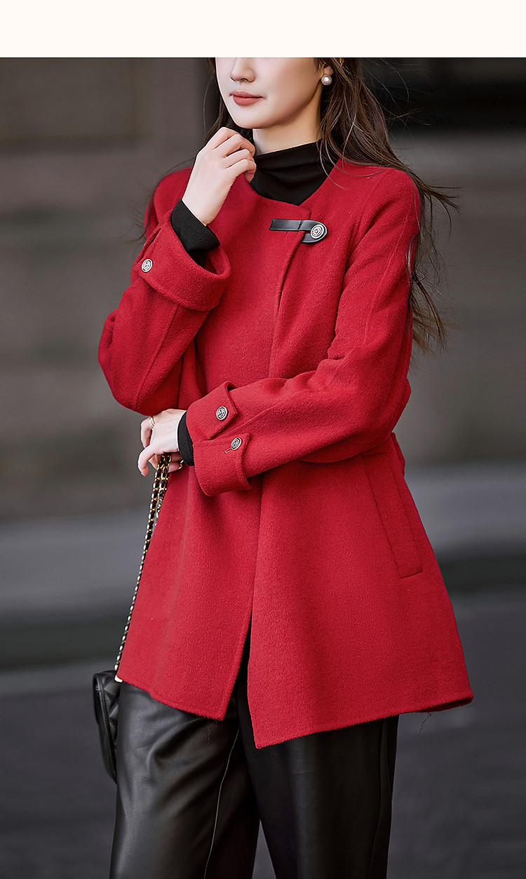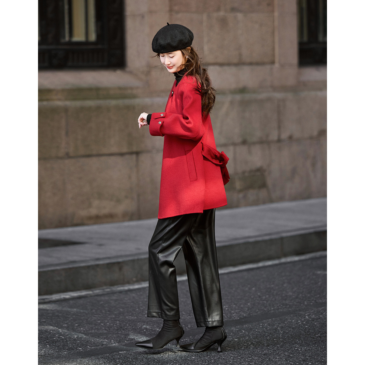 【人间烟火】冬季静奢风绵羊毛顺毛呢皮袢纽扣腰带藏肉大衣女外套