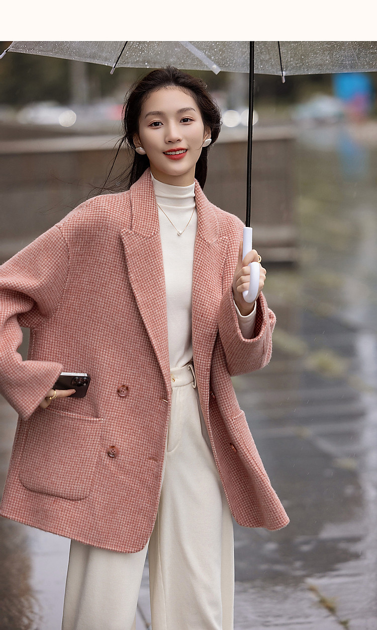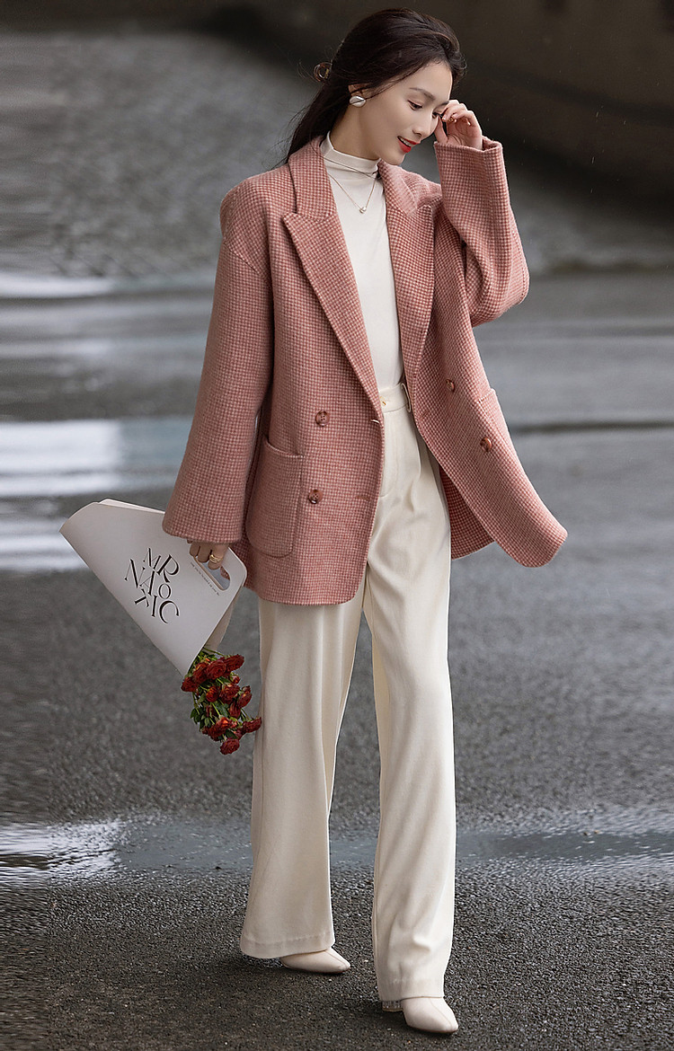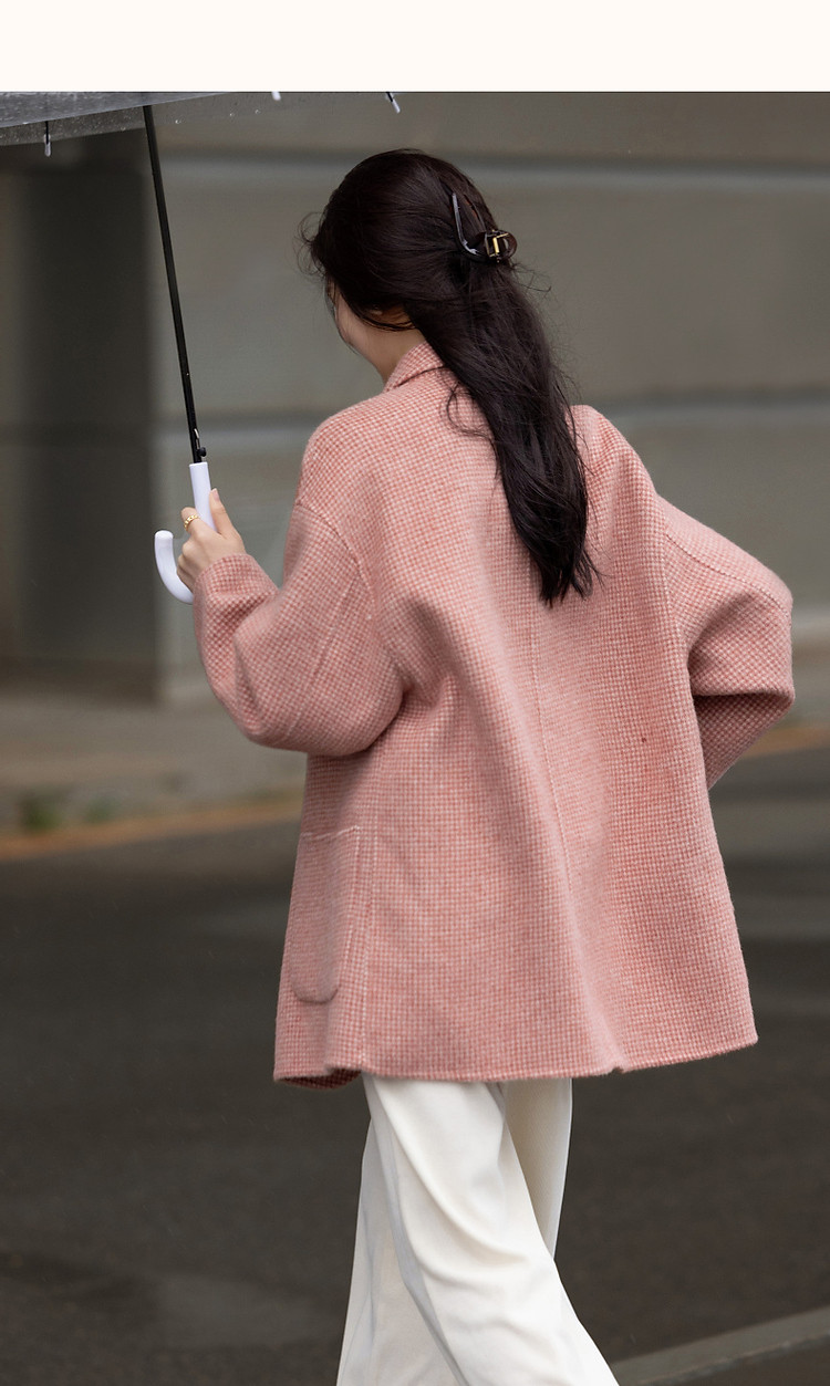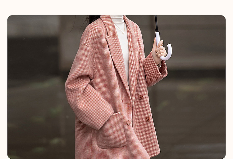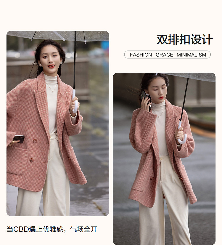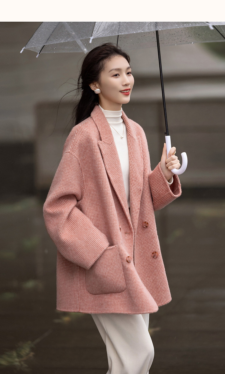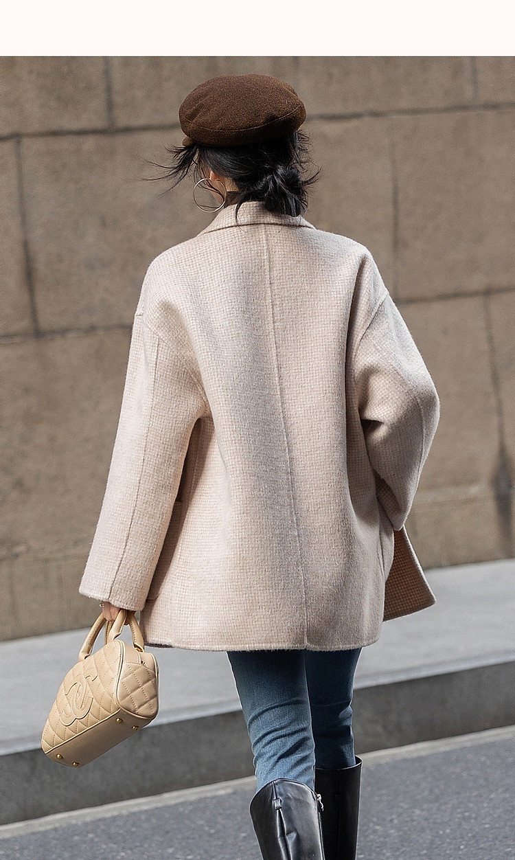 【韩风大女主】24冬静奢千鸟格含绵羊毛双面呢双排扣松弛女外套