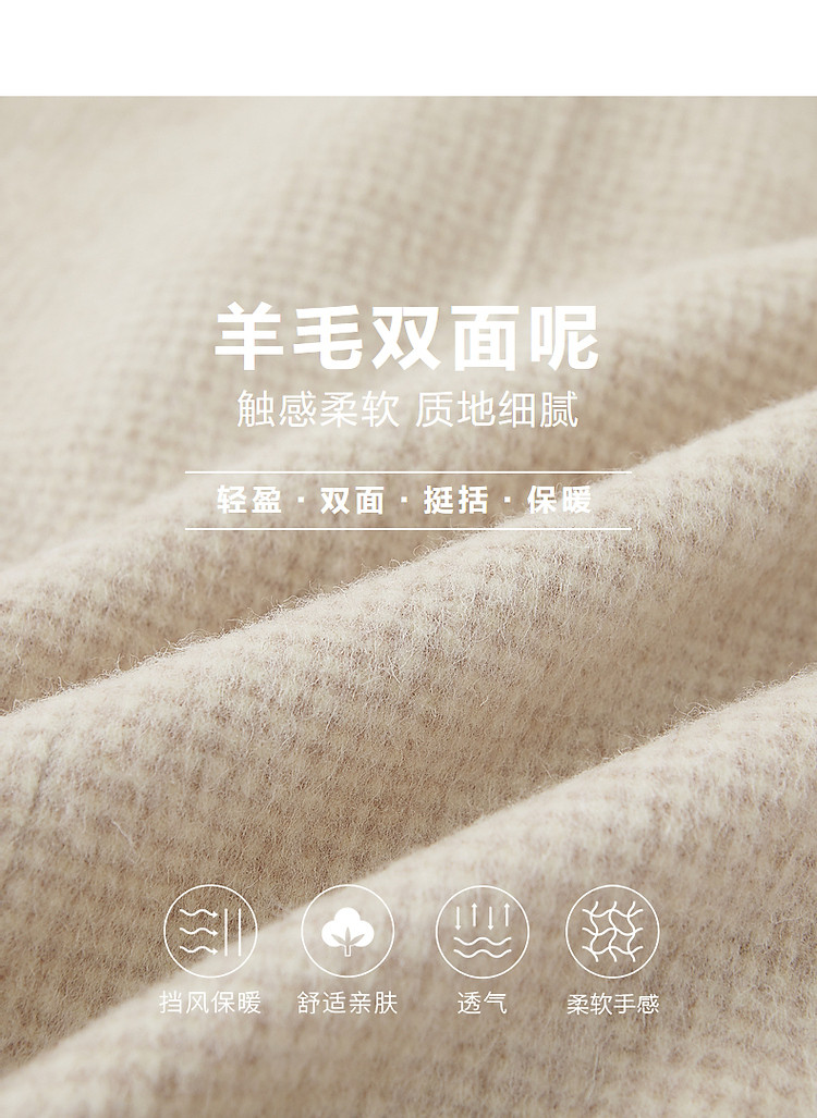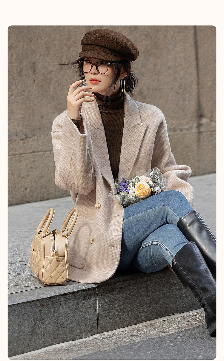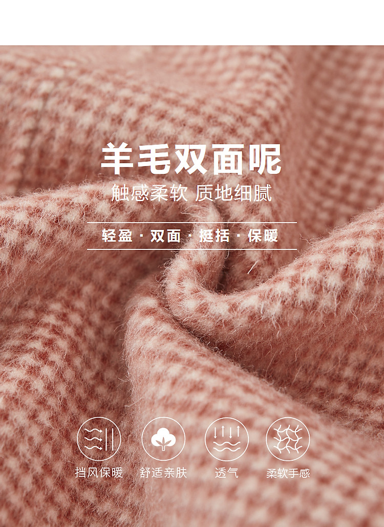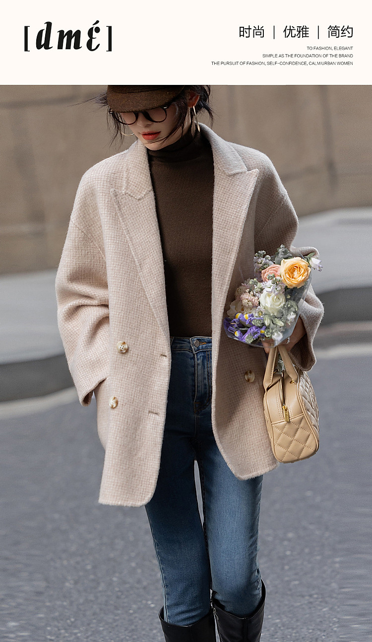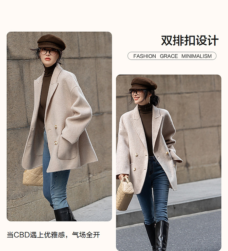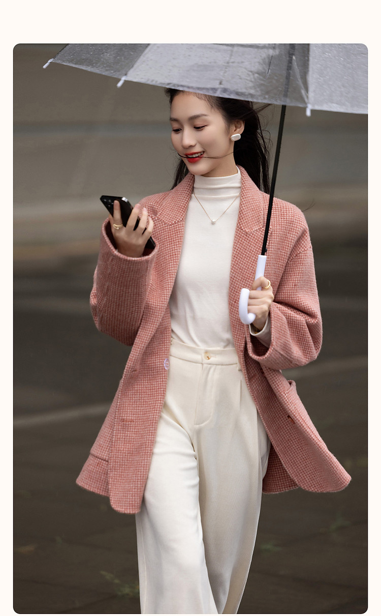 【韩风大女主】24冬静奢千鸟格含绵羊毛双面呢双排扣松弛女外套